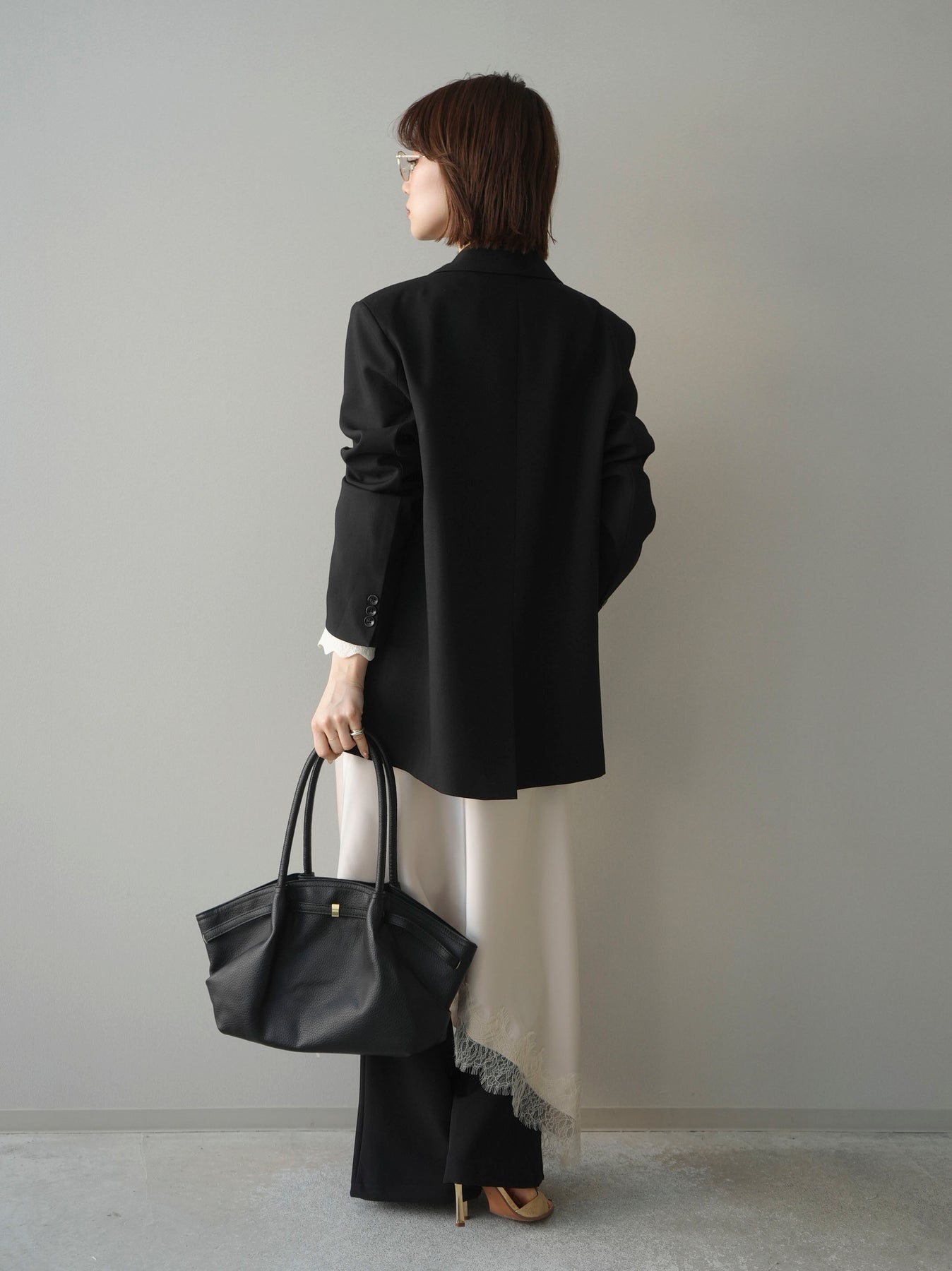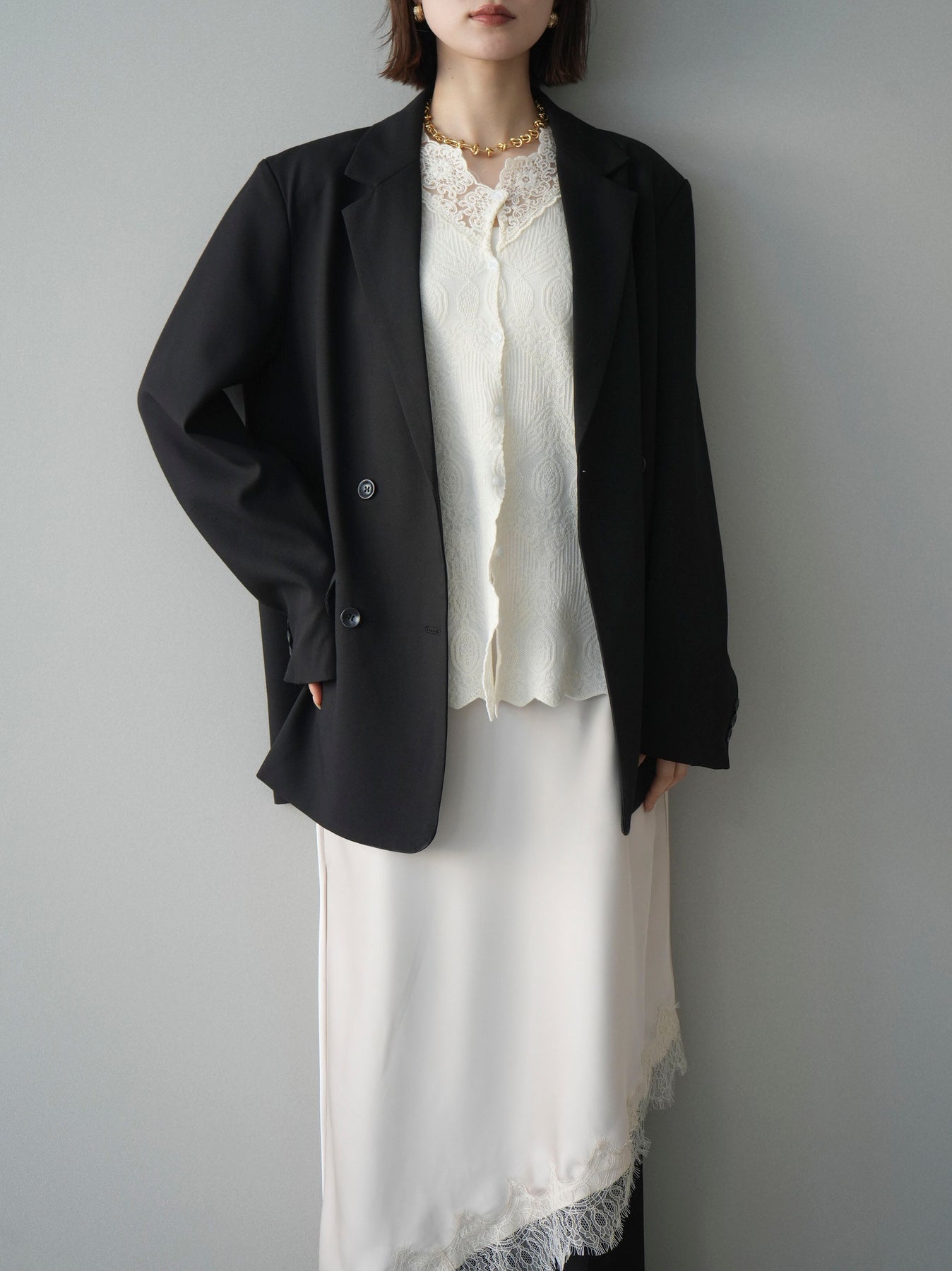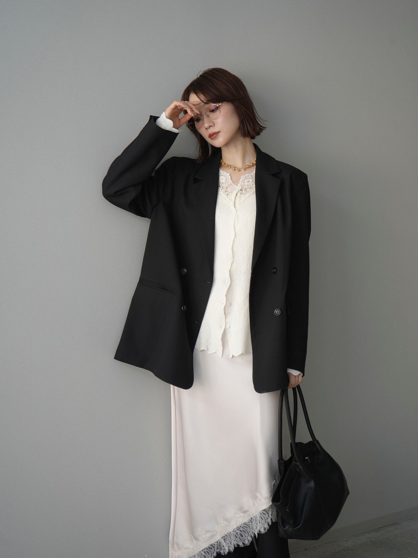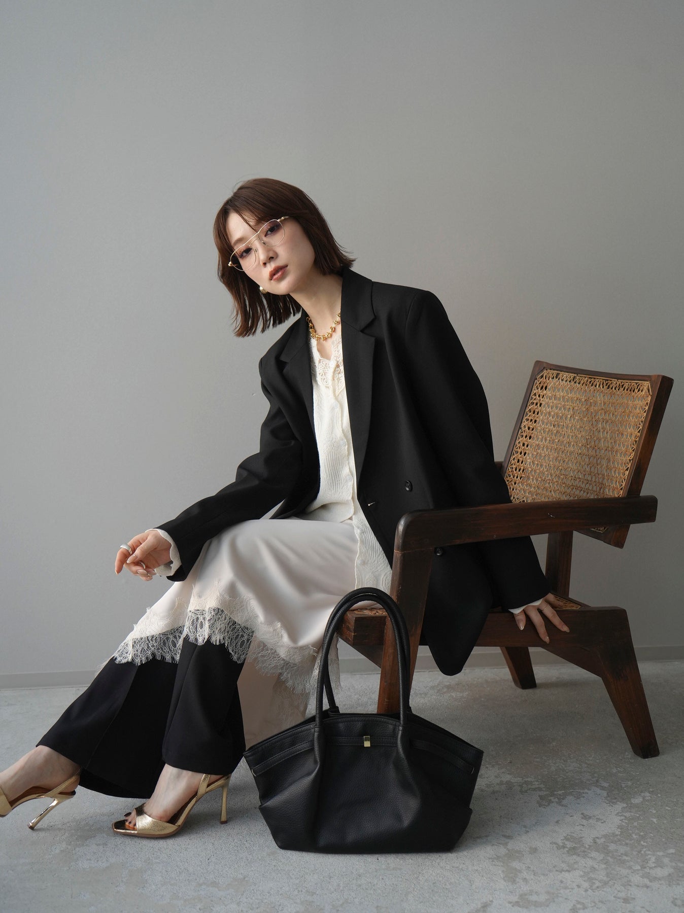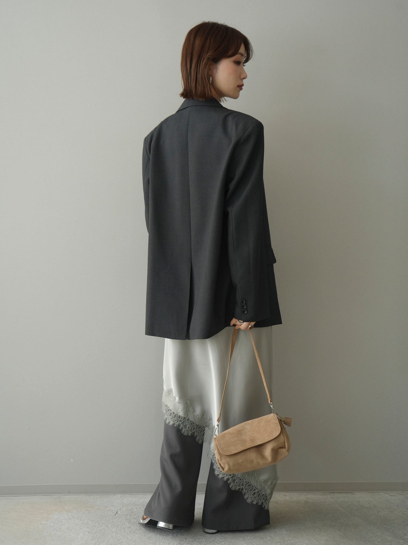 [SET]ダブルブレストオーバージャケット+レースネックジャガードニットカーディガン+サテンライクアシメレーススカート+センターシームフレアパンツ(4set))