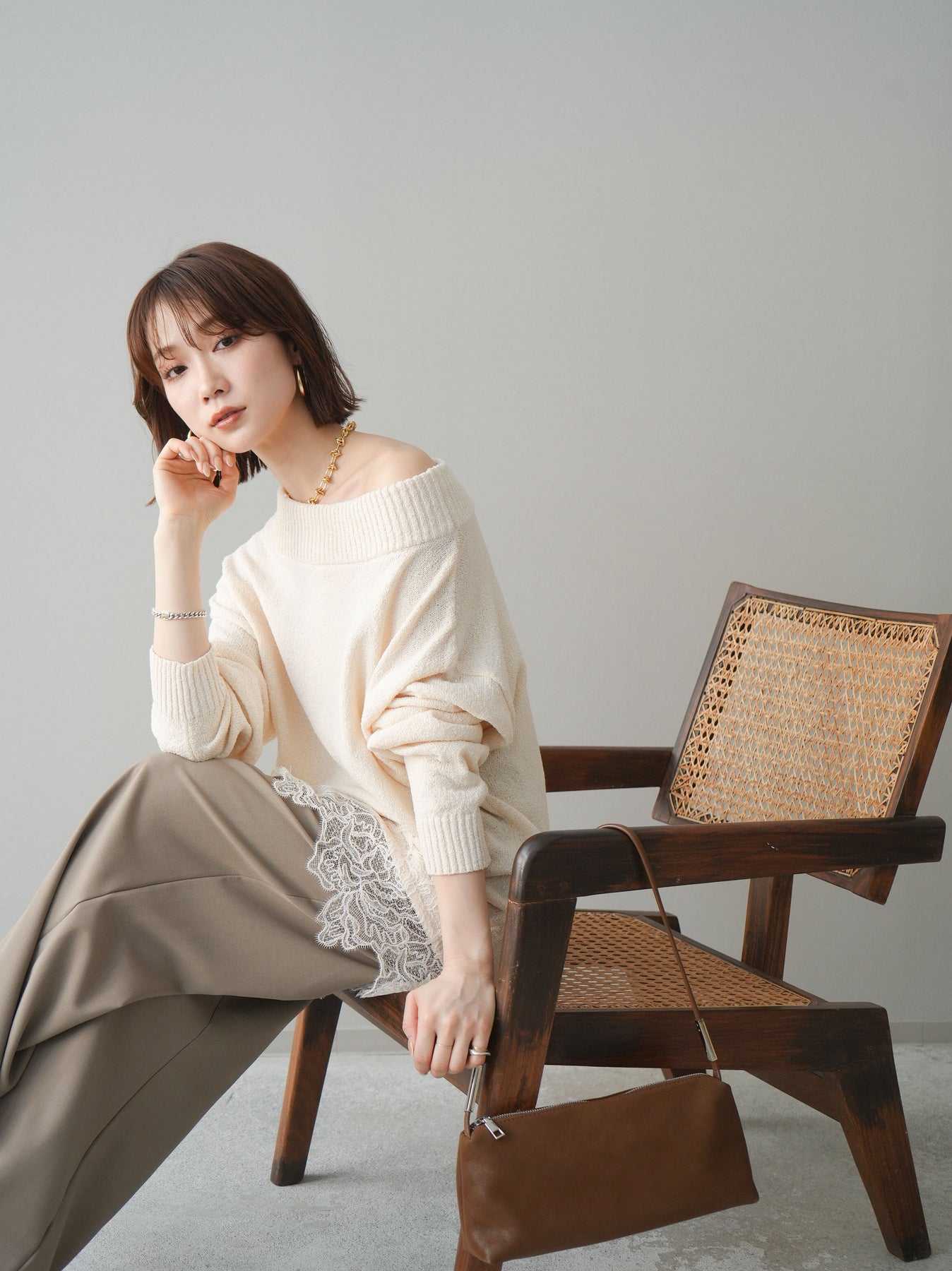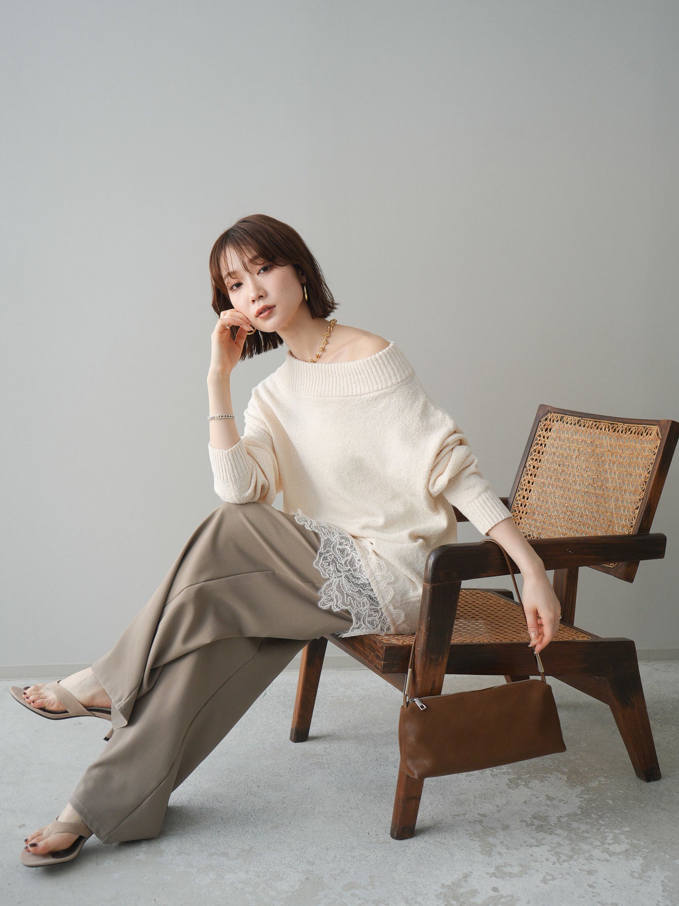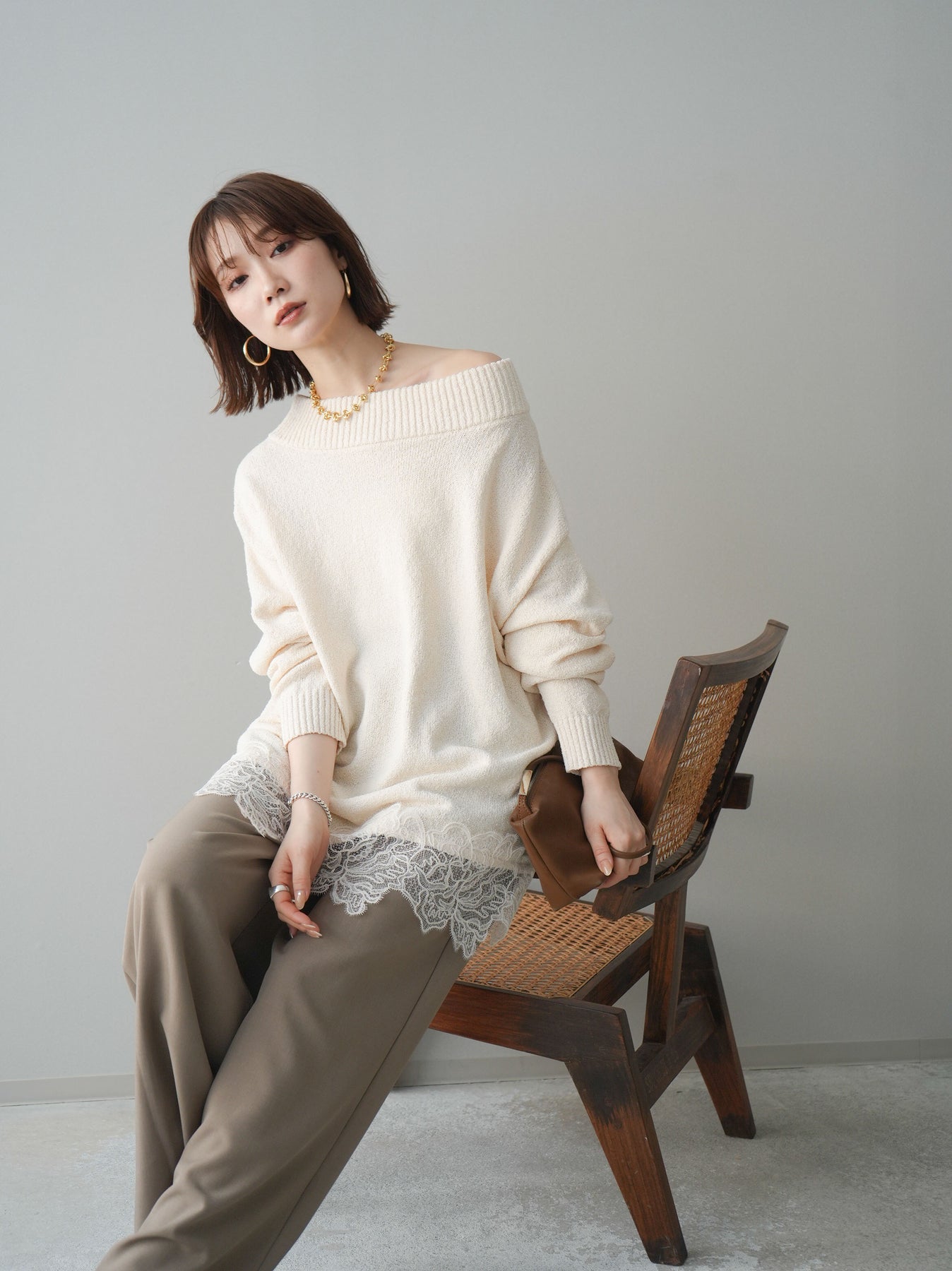 やわらかな編地に繊細なレースをあしらった、女性らしさ漂うニットプルオーバー。裾に施されたアシンメトリーデザインのレースヘムが動きにニュアンスを生み、シンプルながらも印象的な一枚に仕上げました。程よくゆとりのあるシルエットで抜け感を演出し、パンツにもスカートにも合わせやすいバランス感。デイリーからきれいめスタイルまで幅広く活躍するアイテムです。 ※ボトムス、キャミソール(インナー)以外の商品は一律でインナーは付属していません