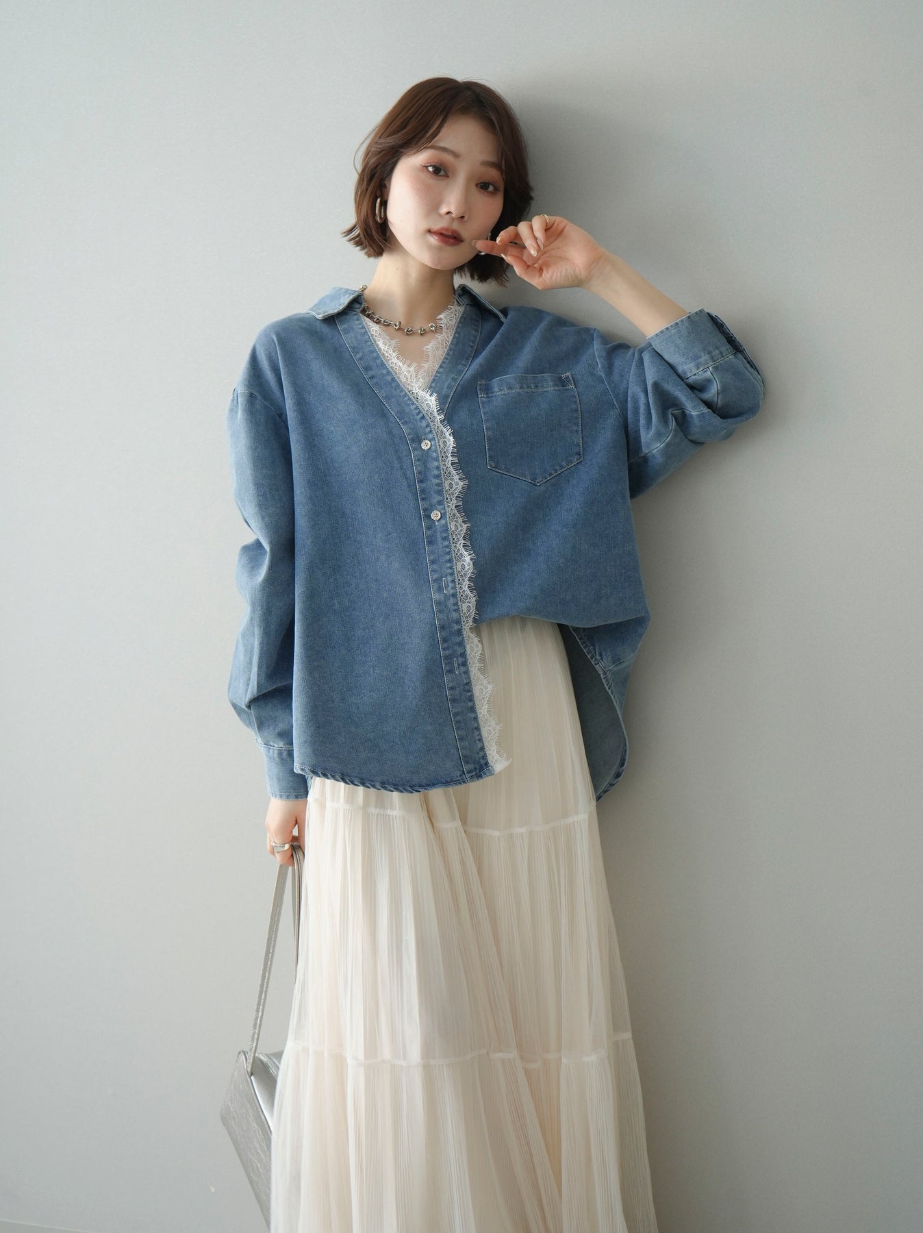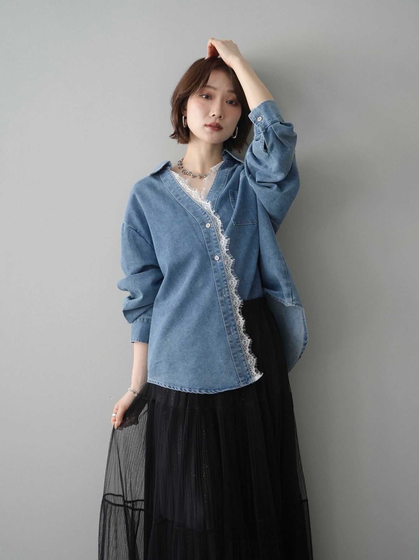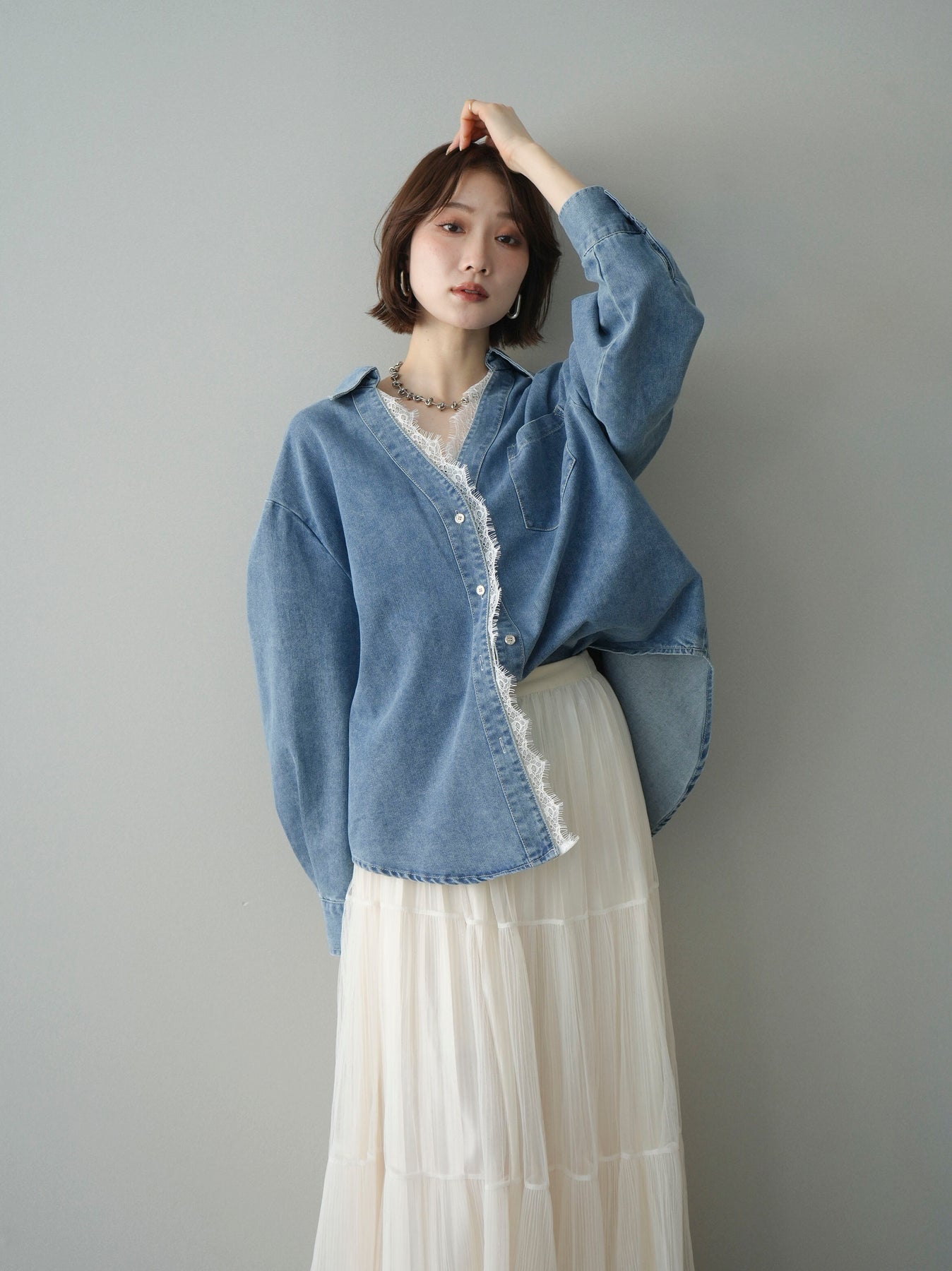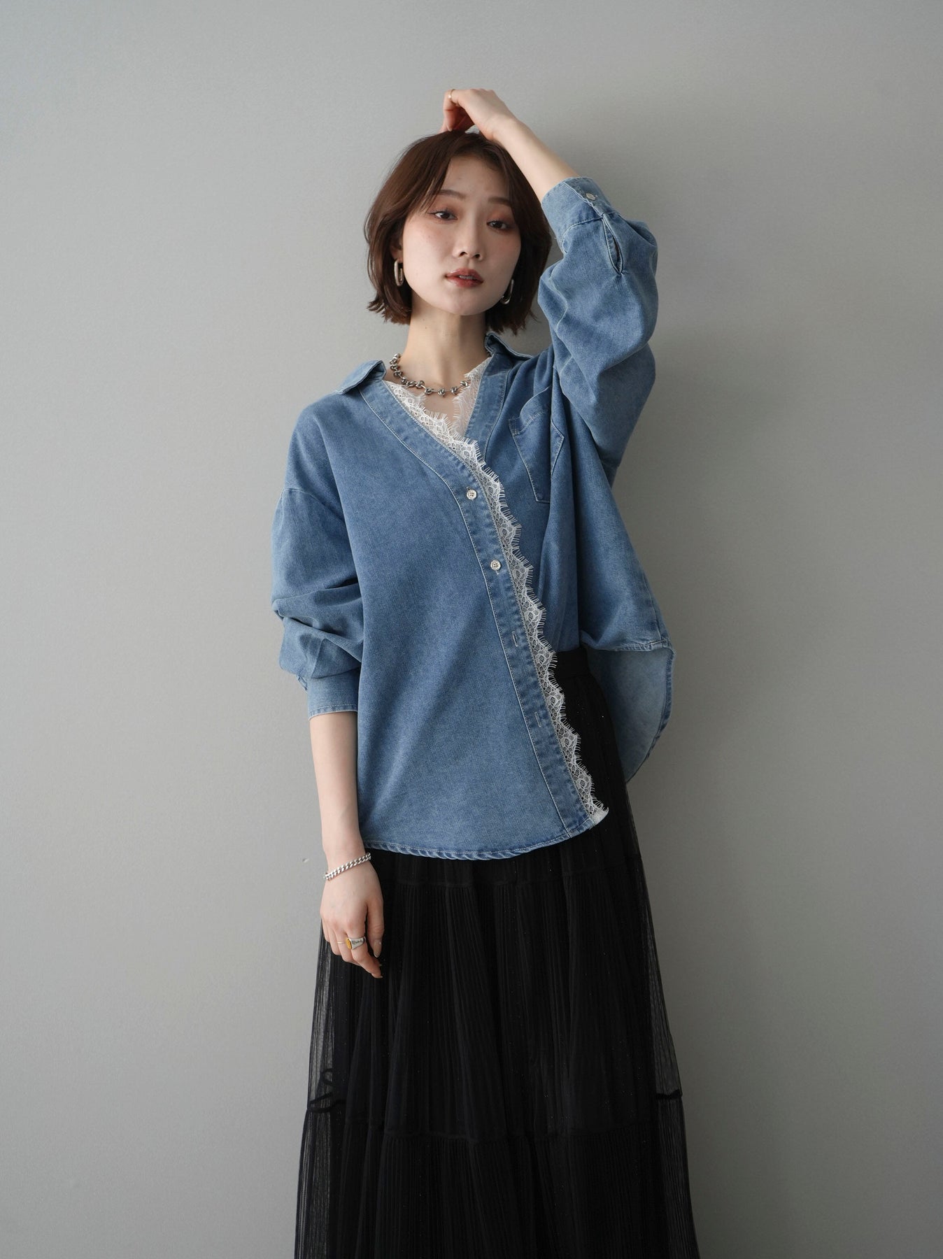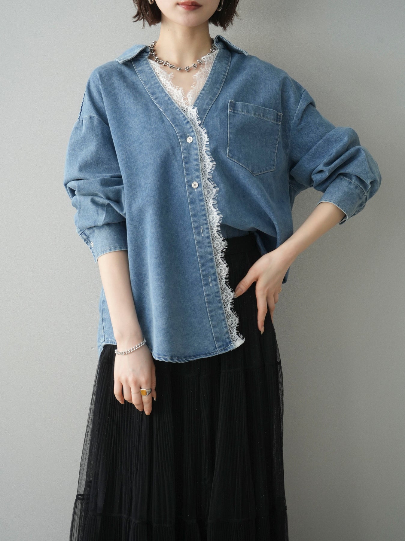[SET]レースレイヤードデニム開襟シャツ+選べるアクセセット(2set)