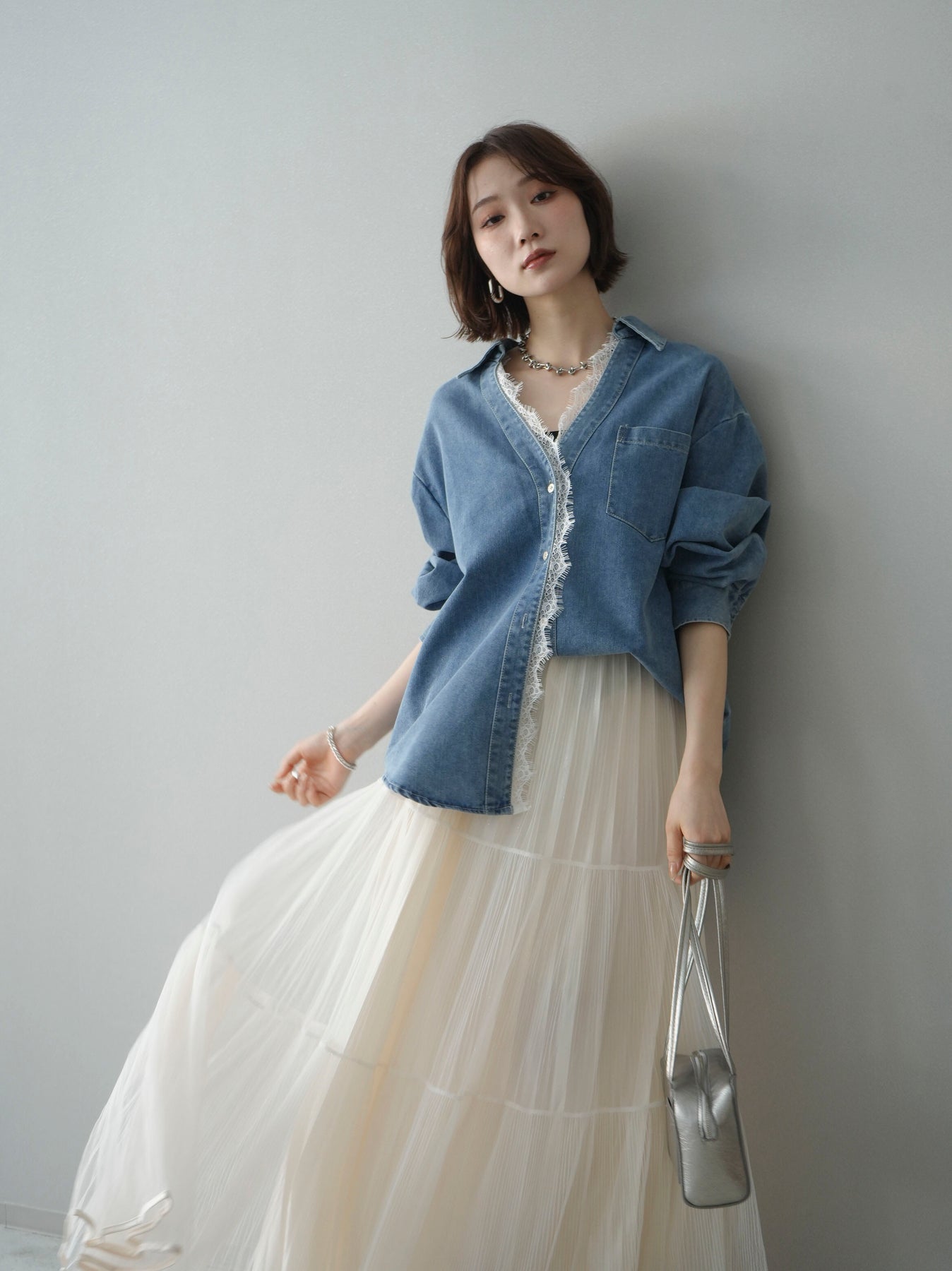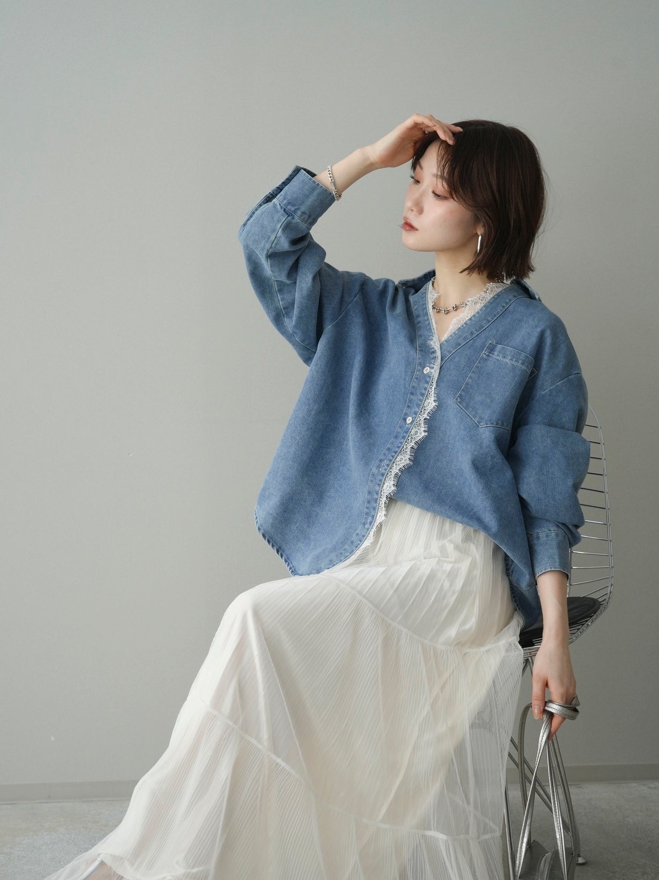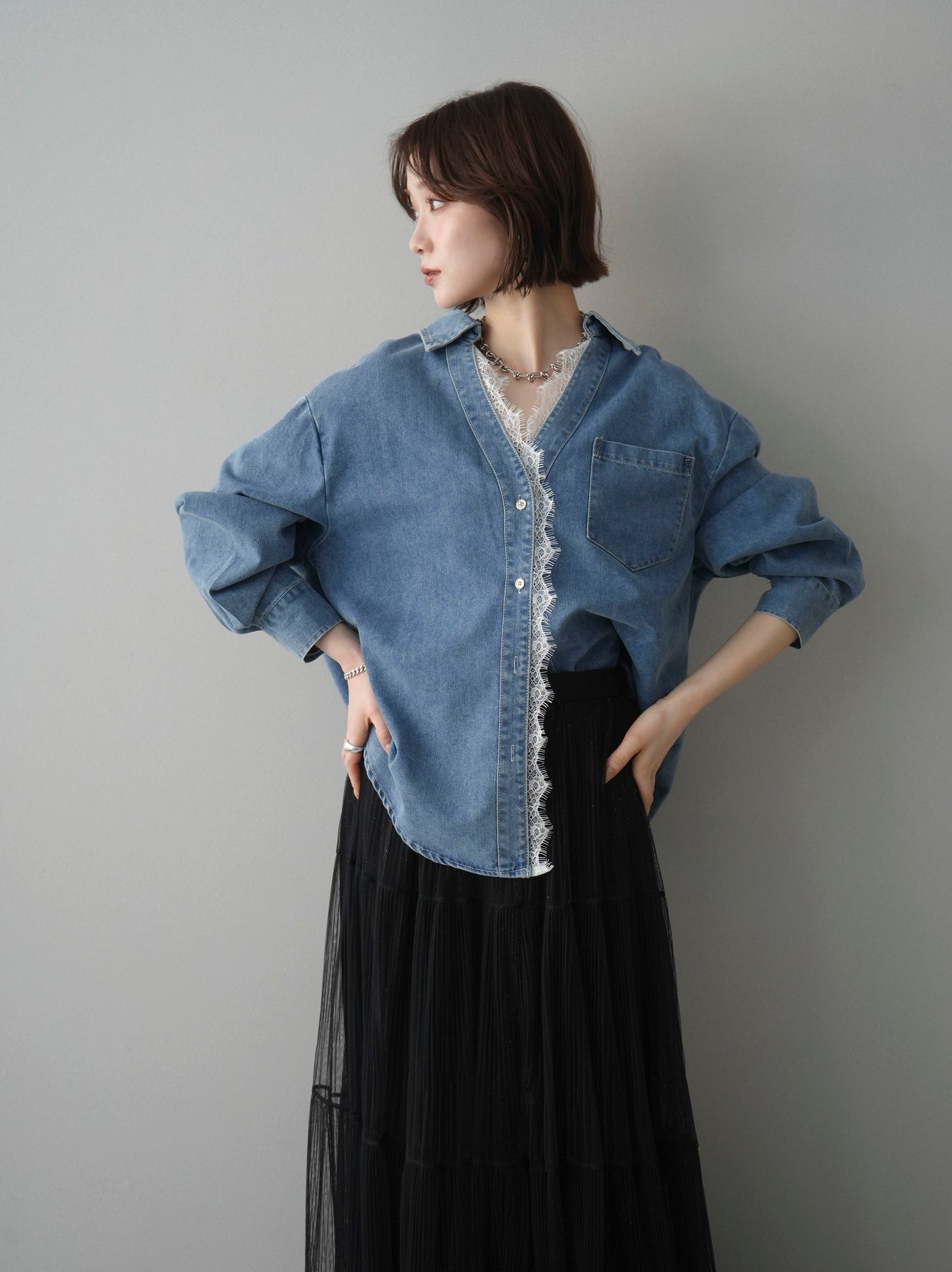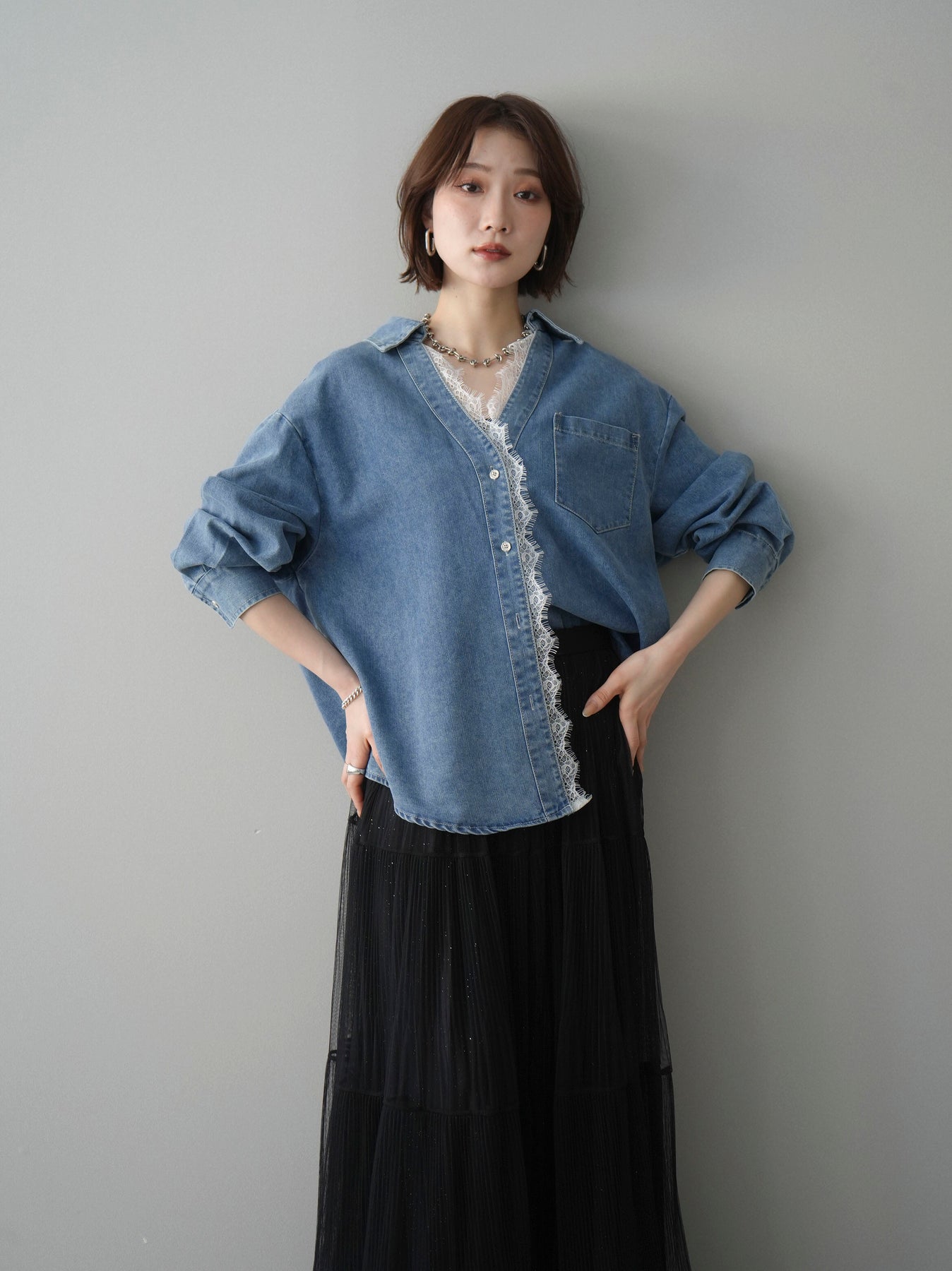 [SET]レースレイヤードデニム開襟シャツ+選べるアクセセット(2set)