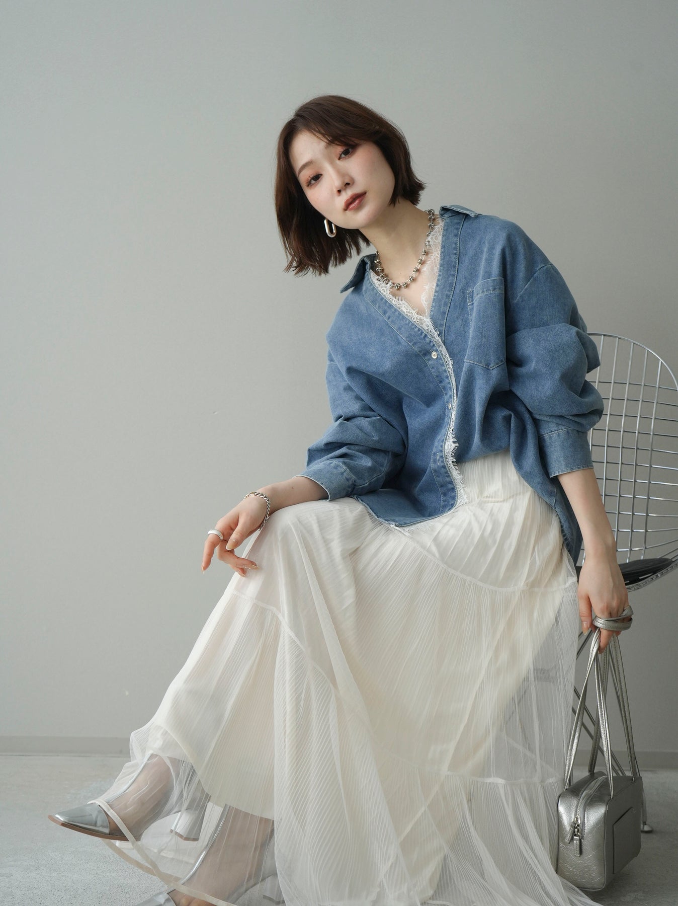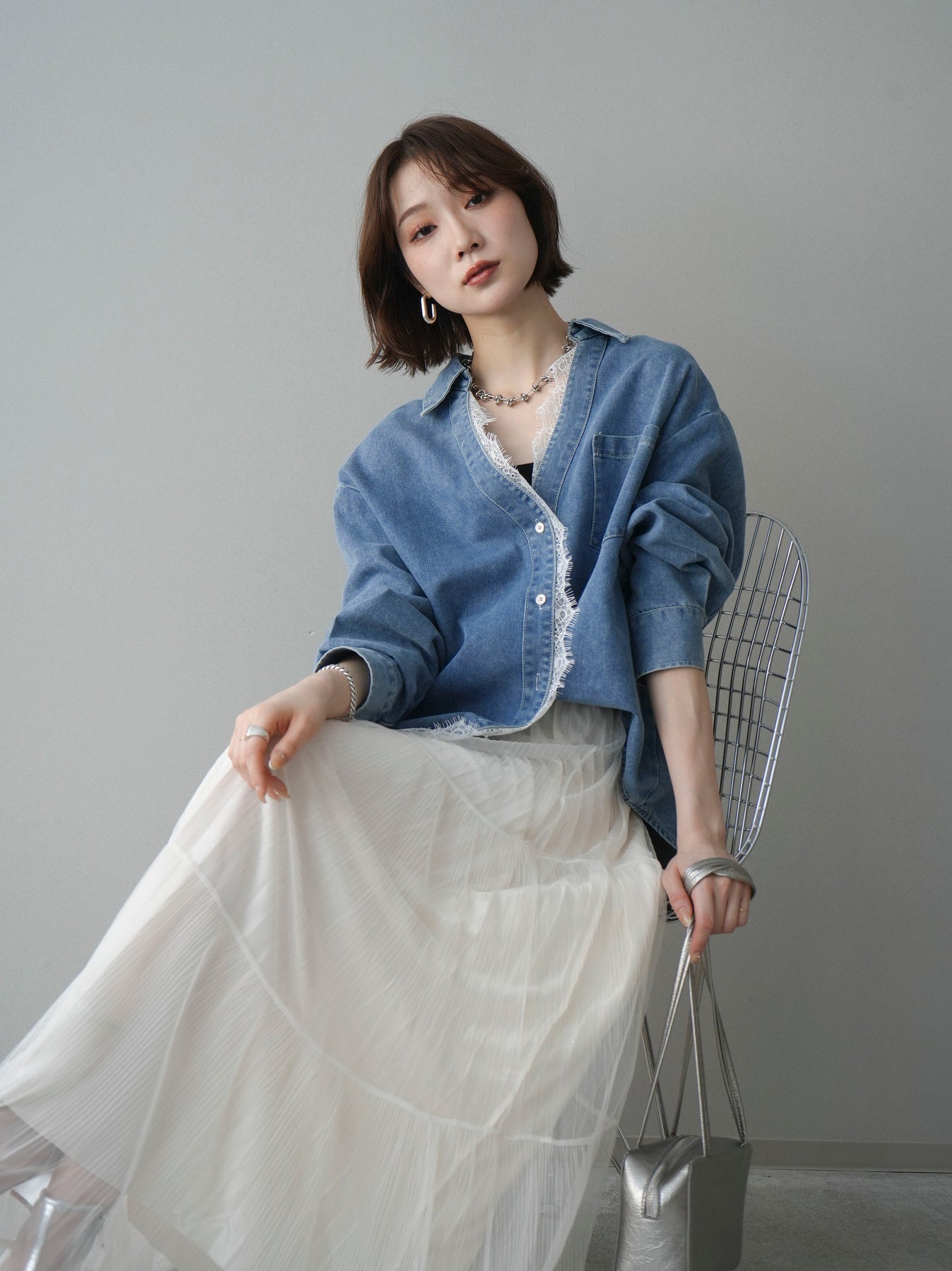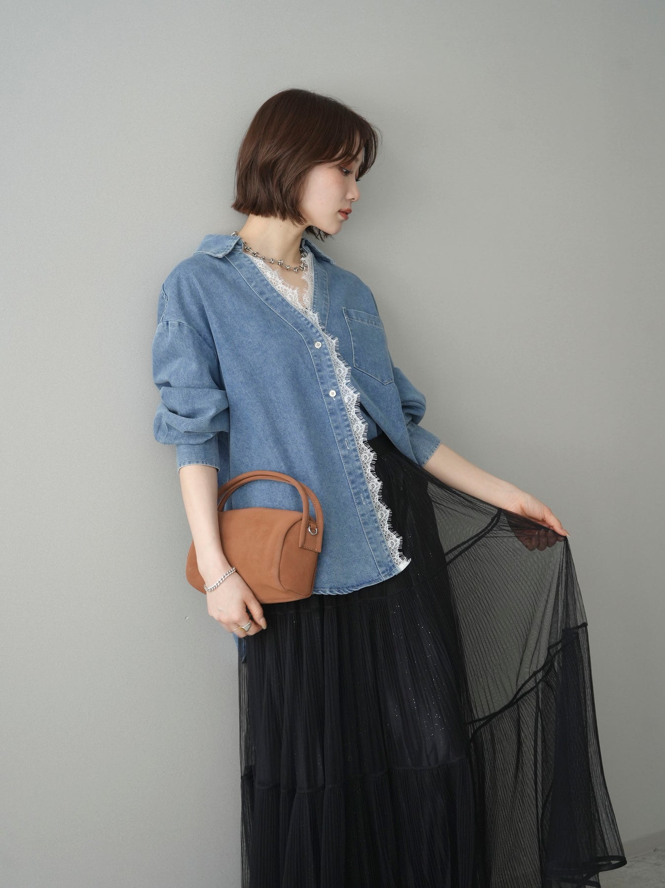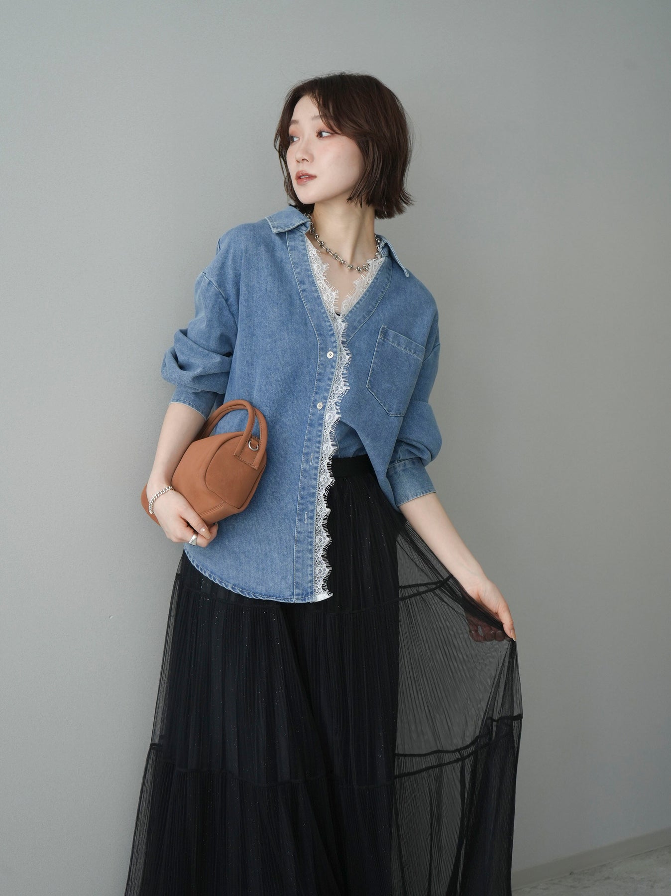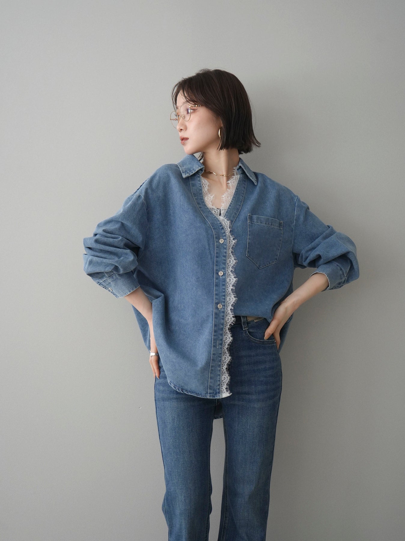 [SET]レースレイヤードデニム開襟シャツ+選べるアクセセット(2set)