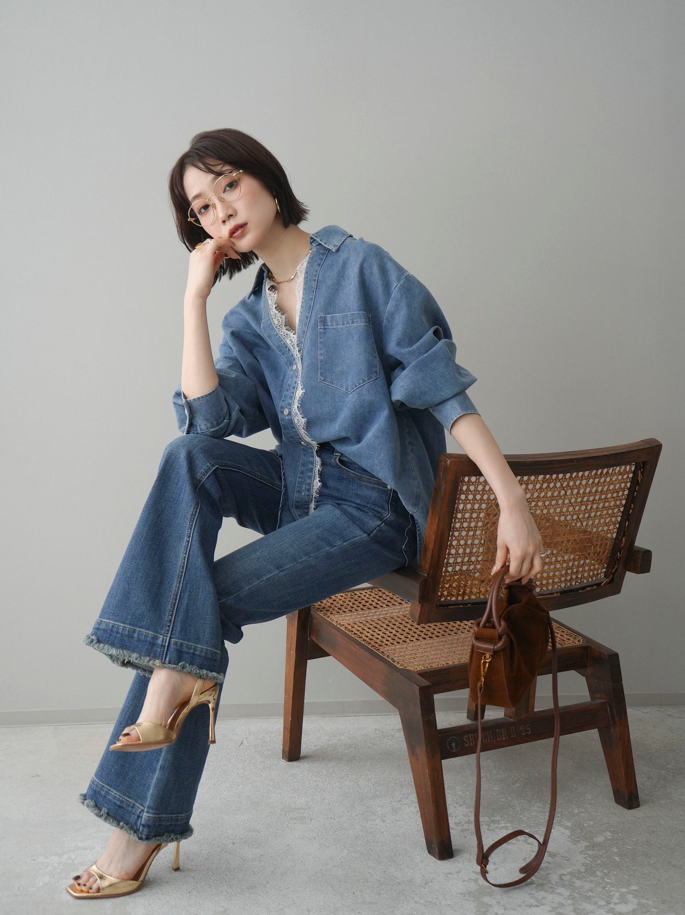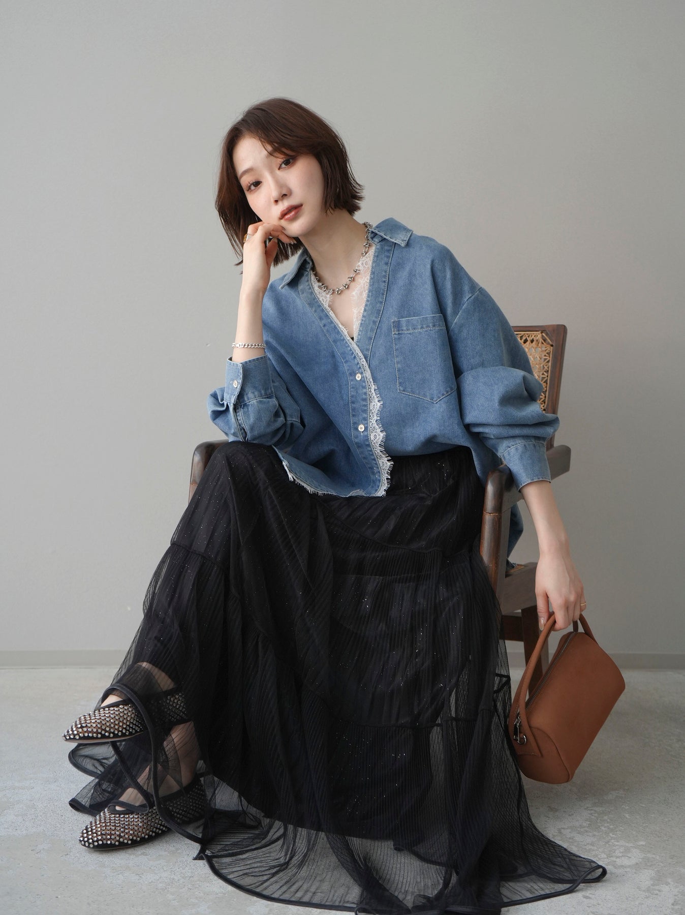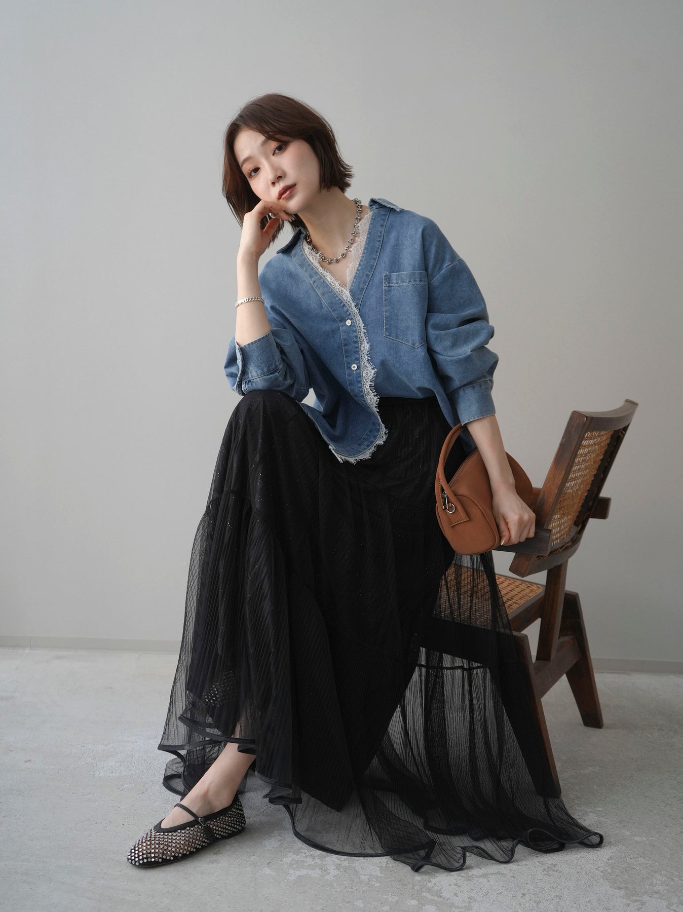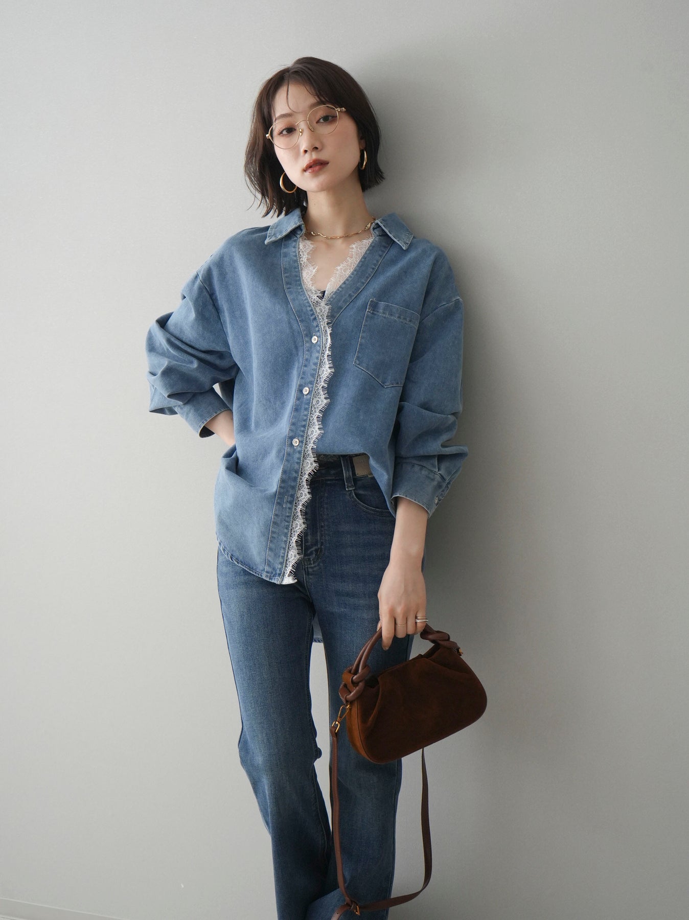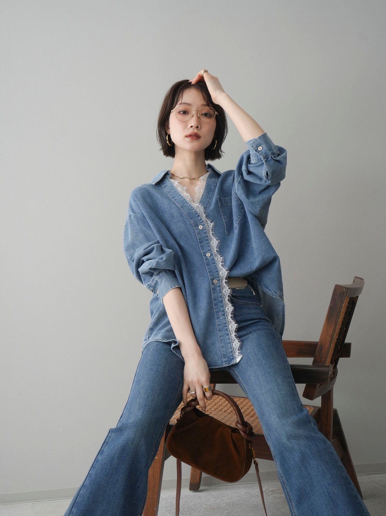 [SET]レースレイヤードデニム開襟シャツ+選べるアクセセット(2set)