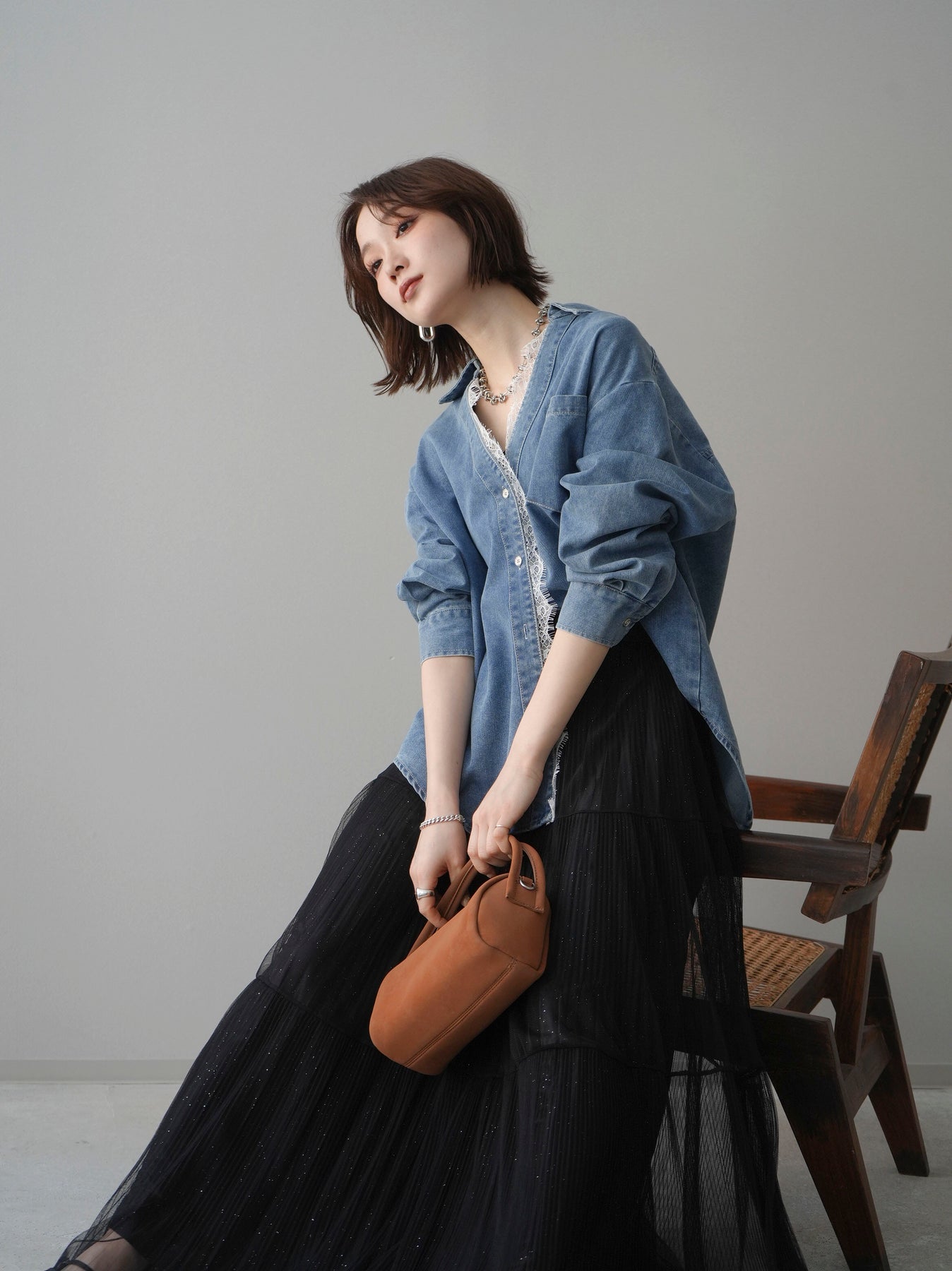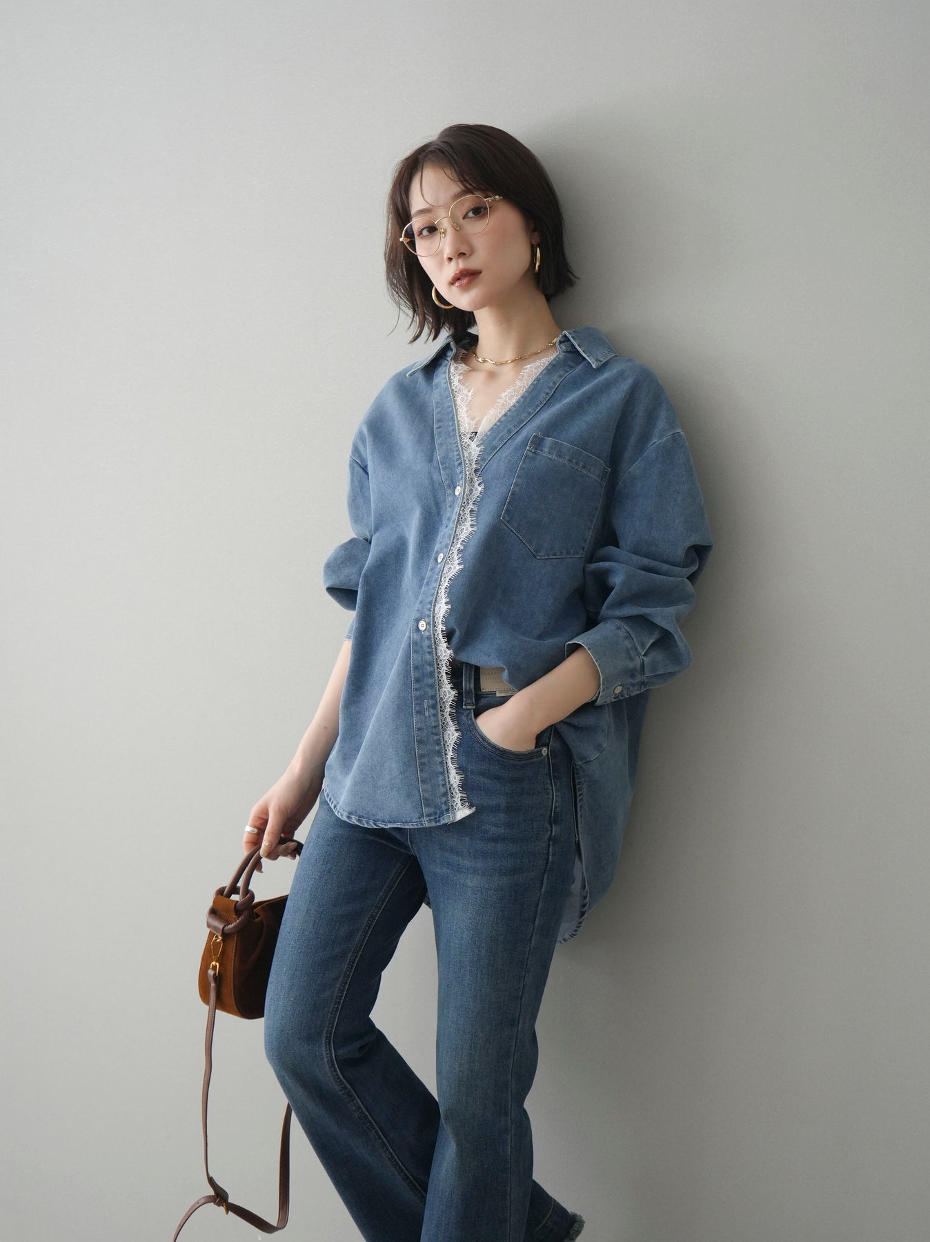 カジュアルなデニムシャツに繊細なレースをレイヤードした、抜け感と女性らしさを兼ね備えた一枚。開襟デザインで顔まわりをすっきりと見せながら、フロントから覗くレースがさりげない華やかさをプラスします。ゆったりとしたシルエットと前後差のある丈感がこなれた印象を演出し、さっと羽織るだけでスタイリングが決まるアイテム。ボタンを閉じてトップスとして着用するのはもちろん、軽いアウター感覚でレイヤードスタイルを楽しむのもおすすめです。デニムならではの程よいラフさとレースの上品さが絶妙にマッチし、デイリーコーデに新鮮さを与えてくれます。 ※ボトムス、キャミソール(インナー)以外の商品は一律でインナーは付属していません。