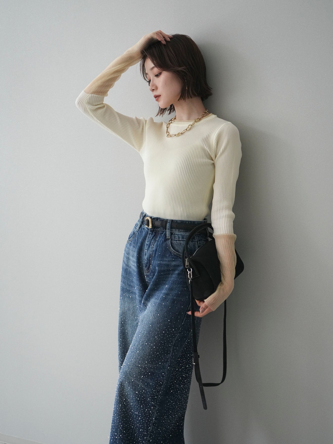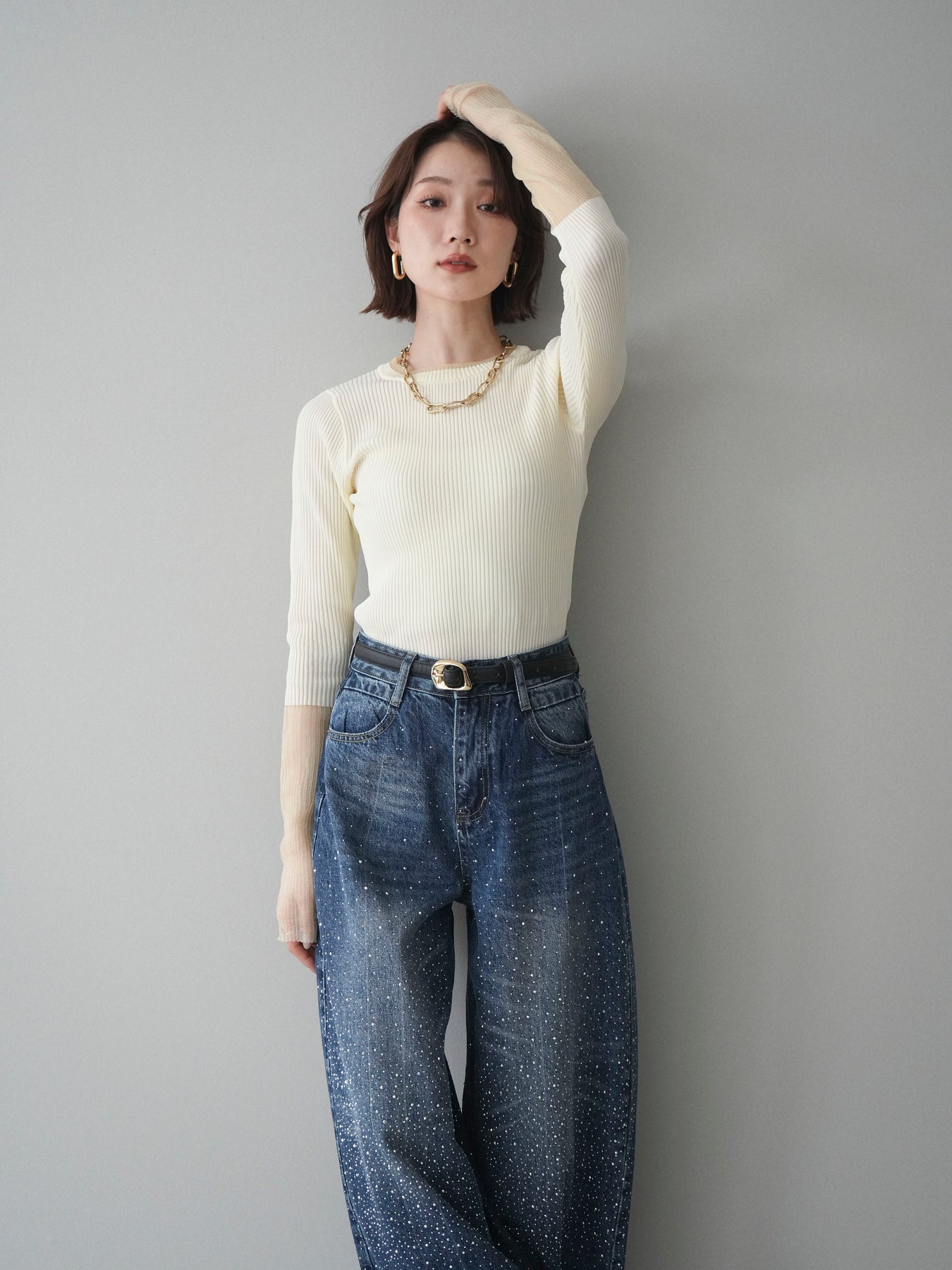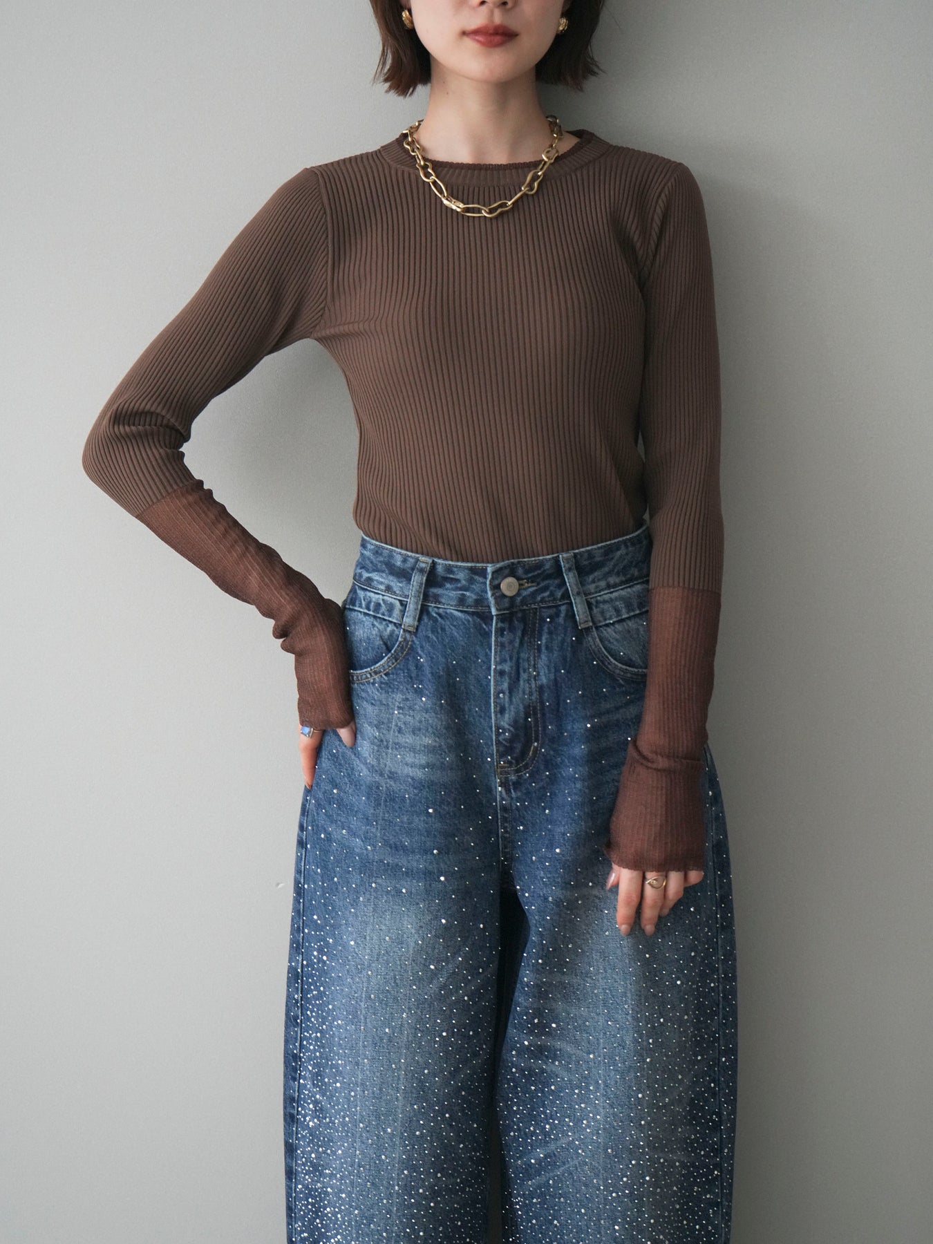 縦リブのすっきりとしたシルエットに、袖口のラメシアー切替が映えるリブニットトップス。身頃は程よくフィットし、女性らしいラインをきれいに引き立ててくれます。ほんのり透け感のある袖口デザインが抜け感をプラスし、シンプルながらも一枚で着映える仕上がりに。ジャケットやキャミワンピースのインナーとしても活躍し、ロングシーズン着回せる万能アイテムです。