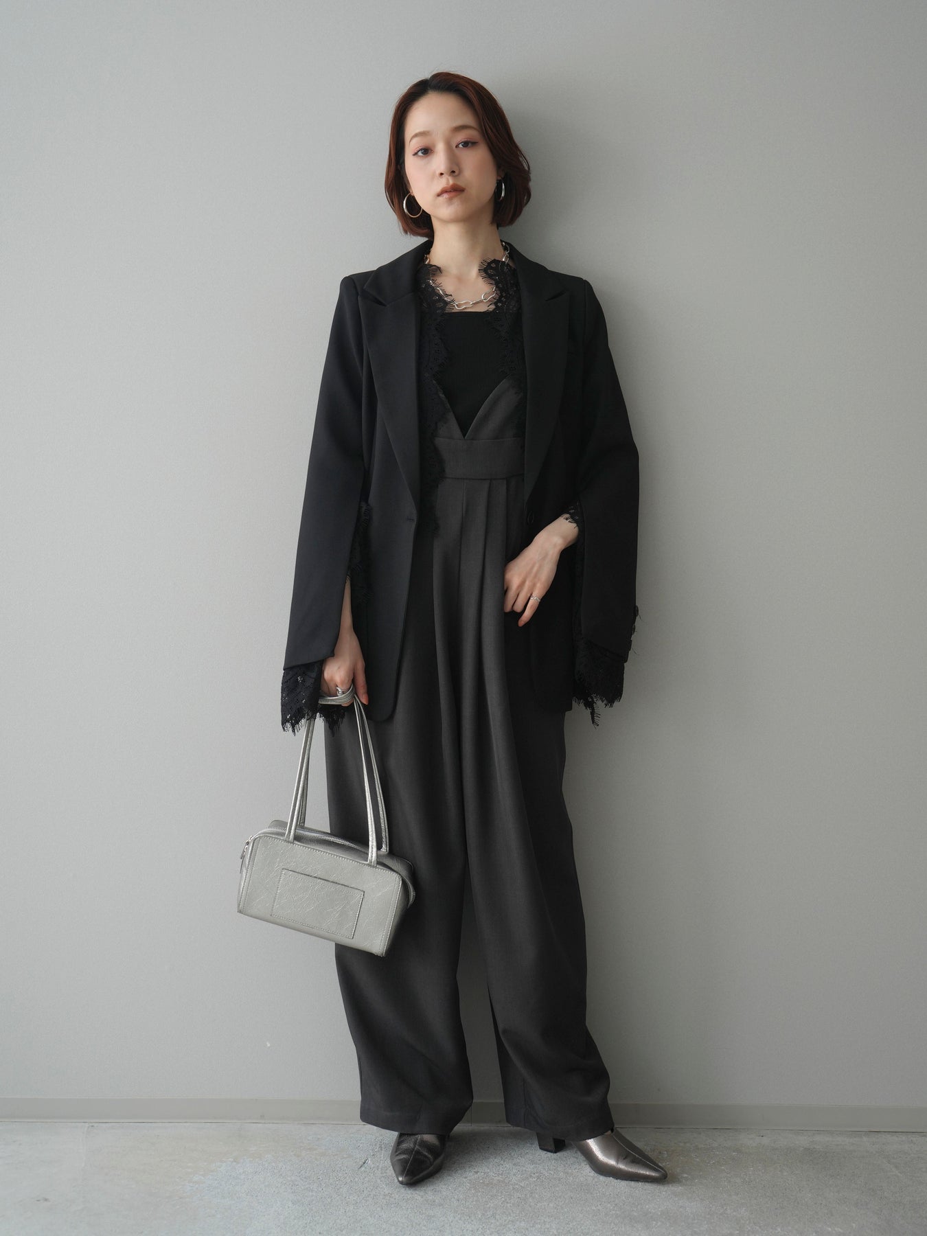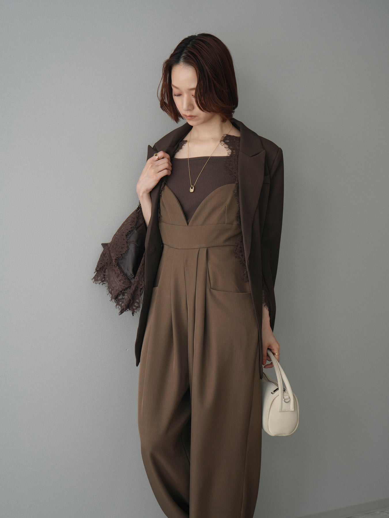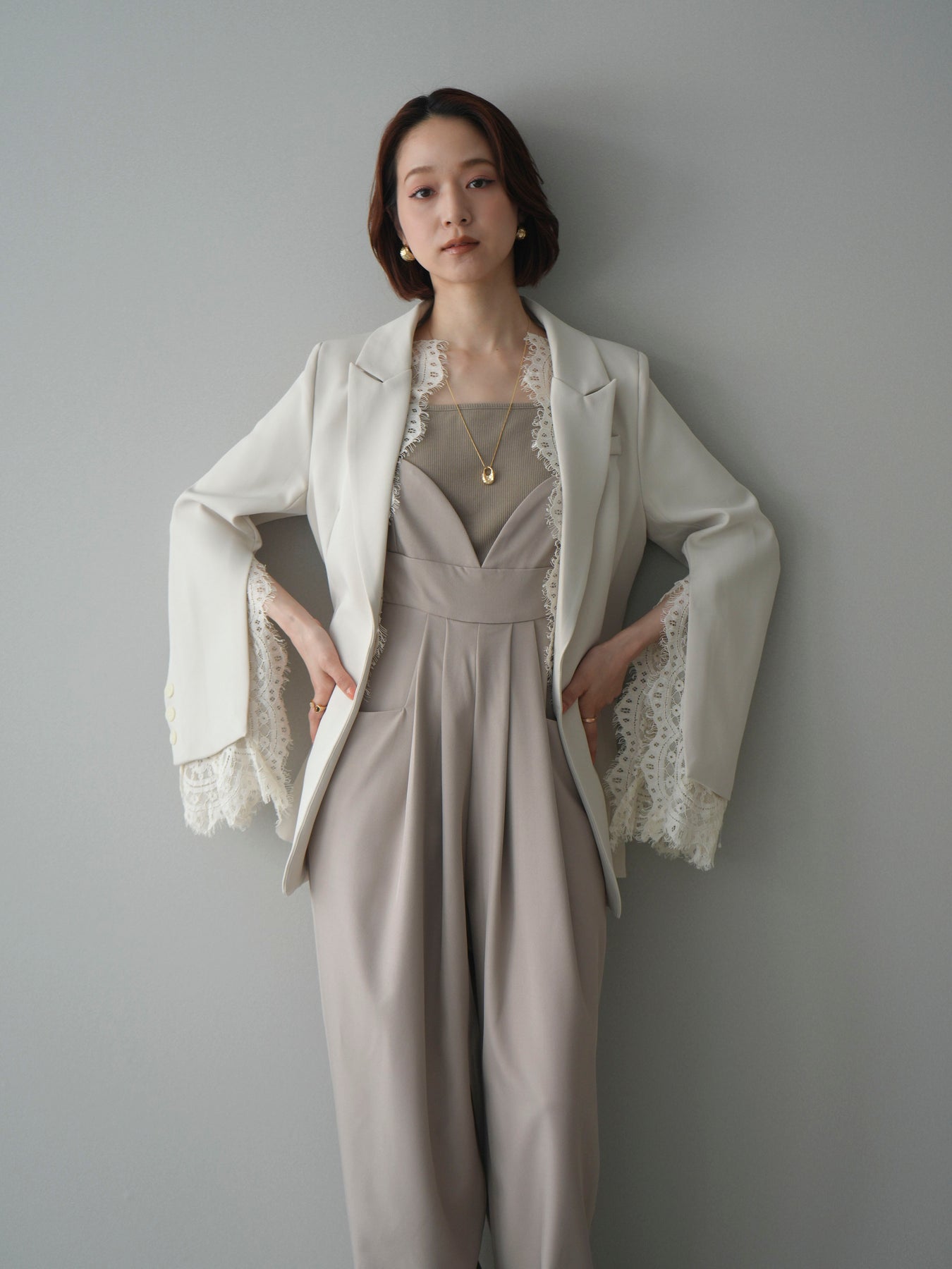 [SET]レースレイヤードスリットジャケット+バックデザインサロペット(2set)