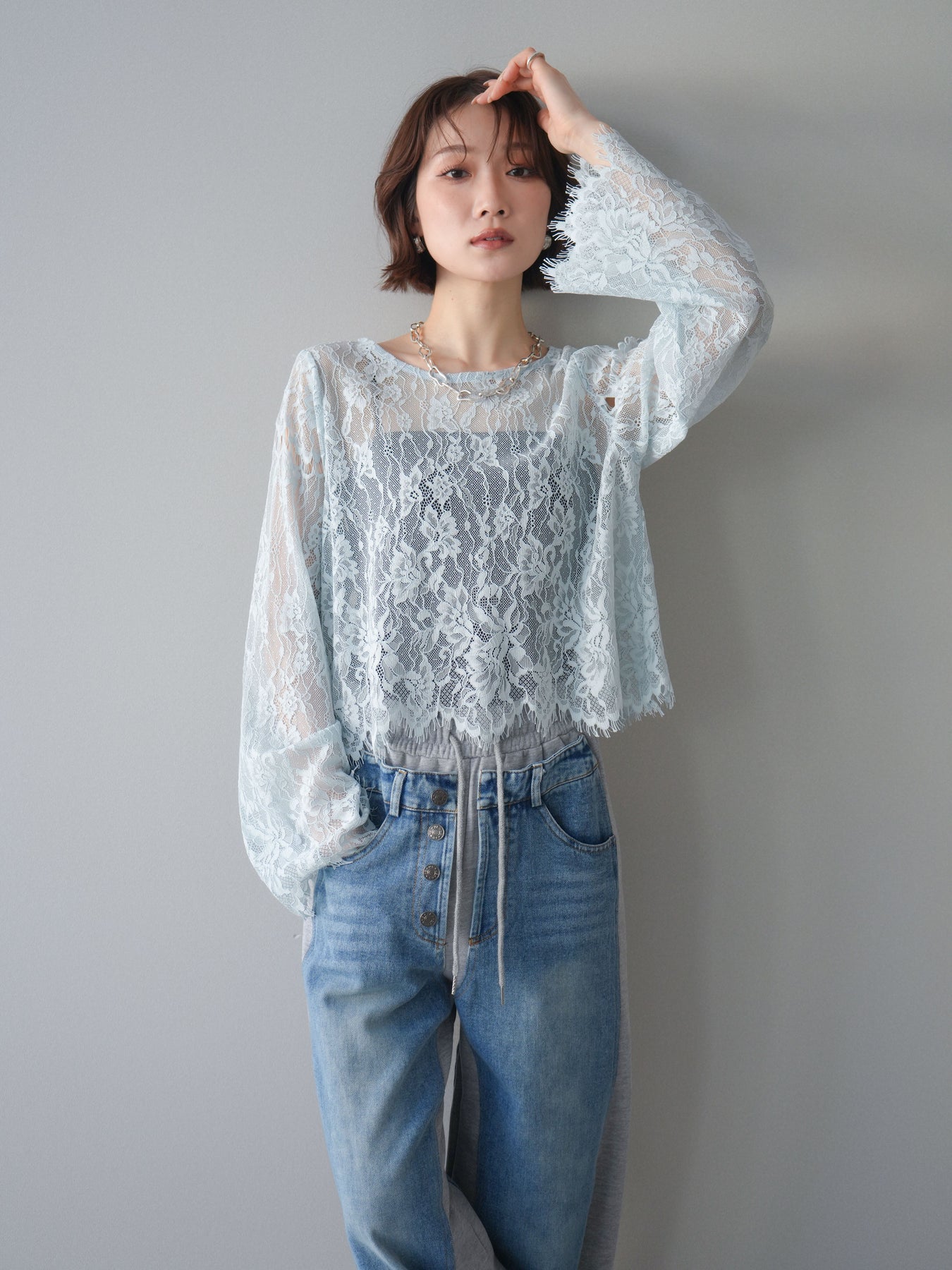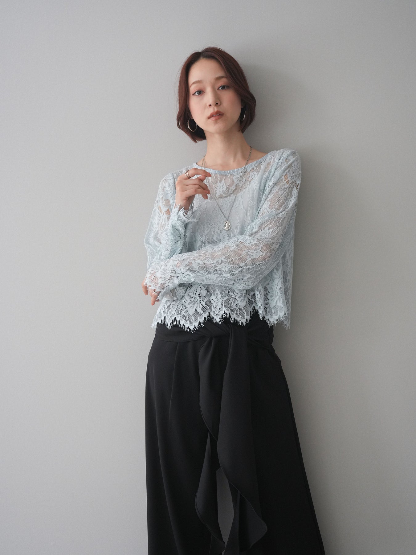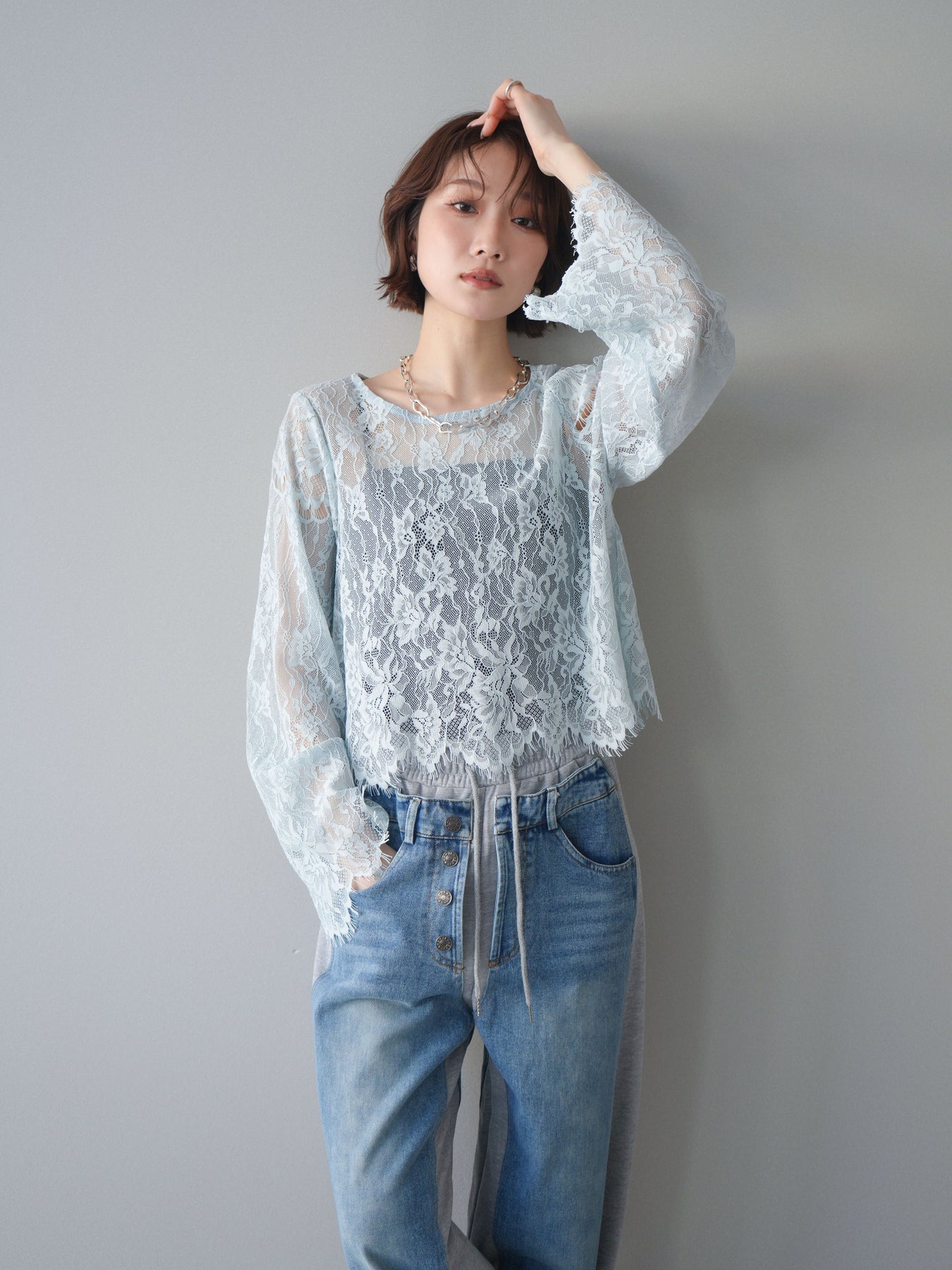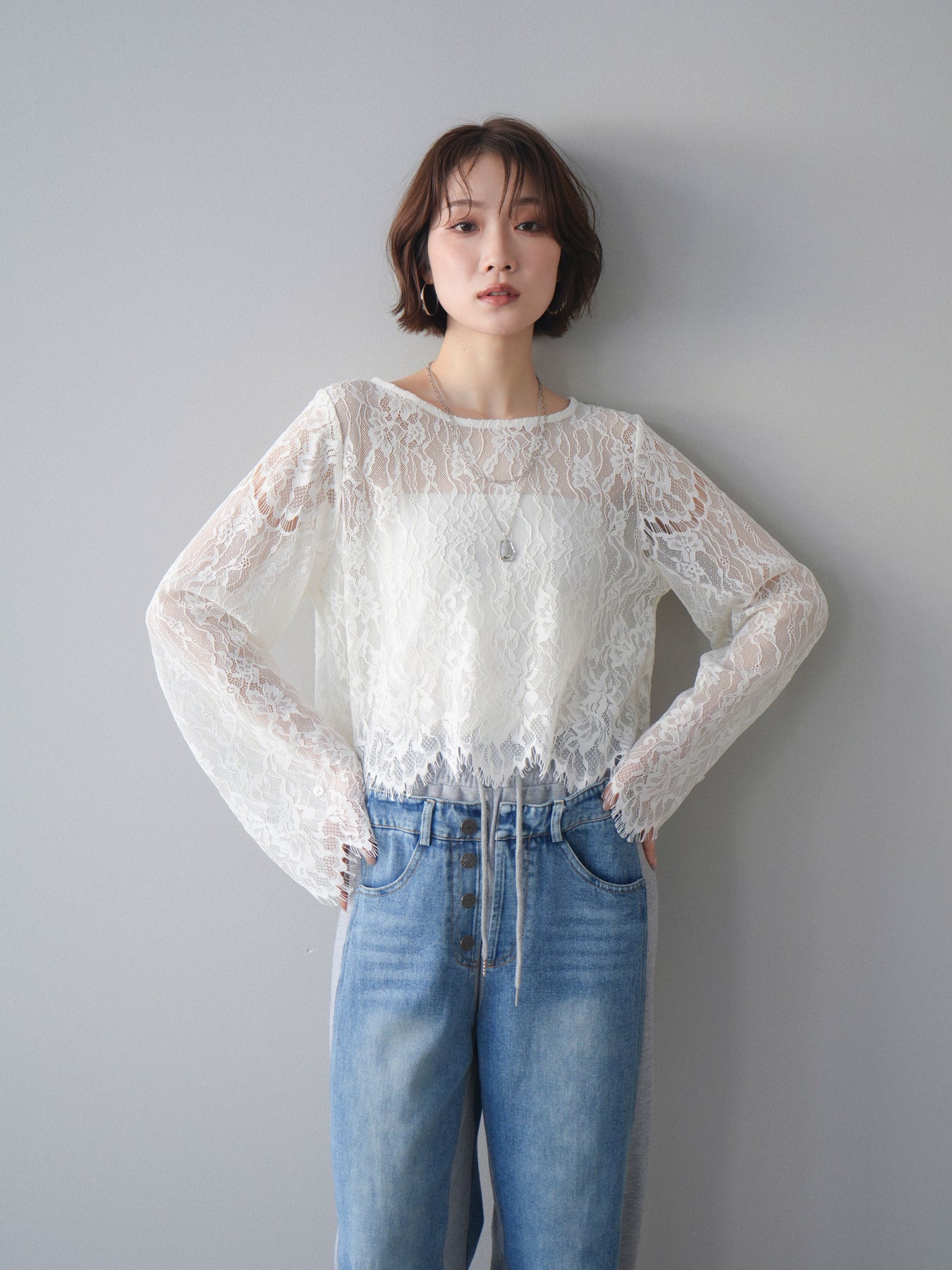繊細な総レース素材が目を惹くロングスリーブトップス。透け感のある軽やかな風合いで、スタイリングに抜け感をプラスしてくれます。すっきりとしたシルエットでインナー使いにも重宝し、キャミソールやタンクトップを重ねてヘルシーに着こなすのもおすすめ。デニムやスラックス、ジャンパースカートのインナーなど、幅広いコーディネートに取り入れやすい一枚です。 ※ボトムス、キャミソール(インナー)以外の商品は一律でインナーは付属していません