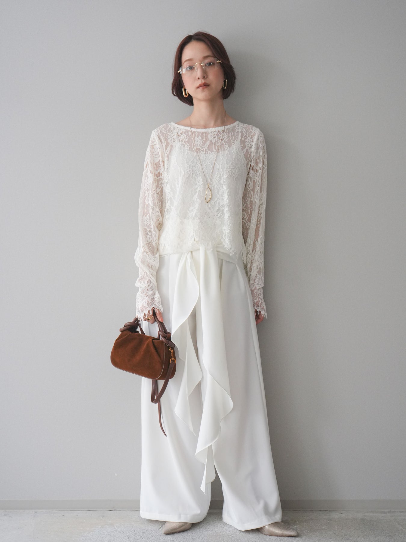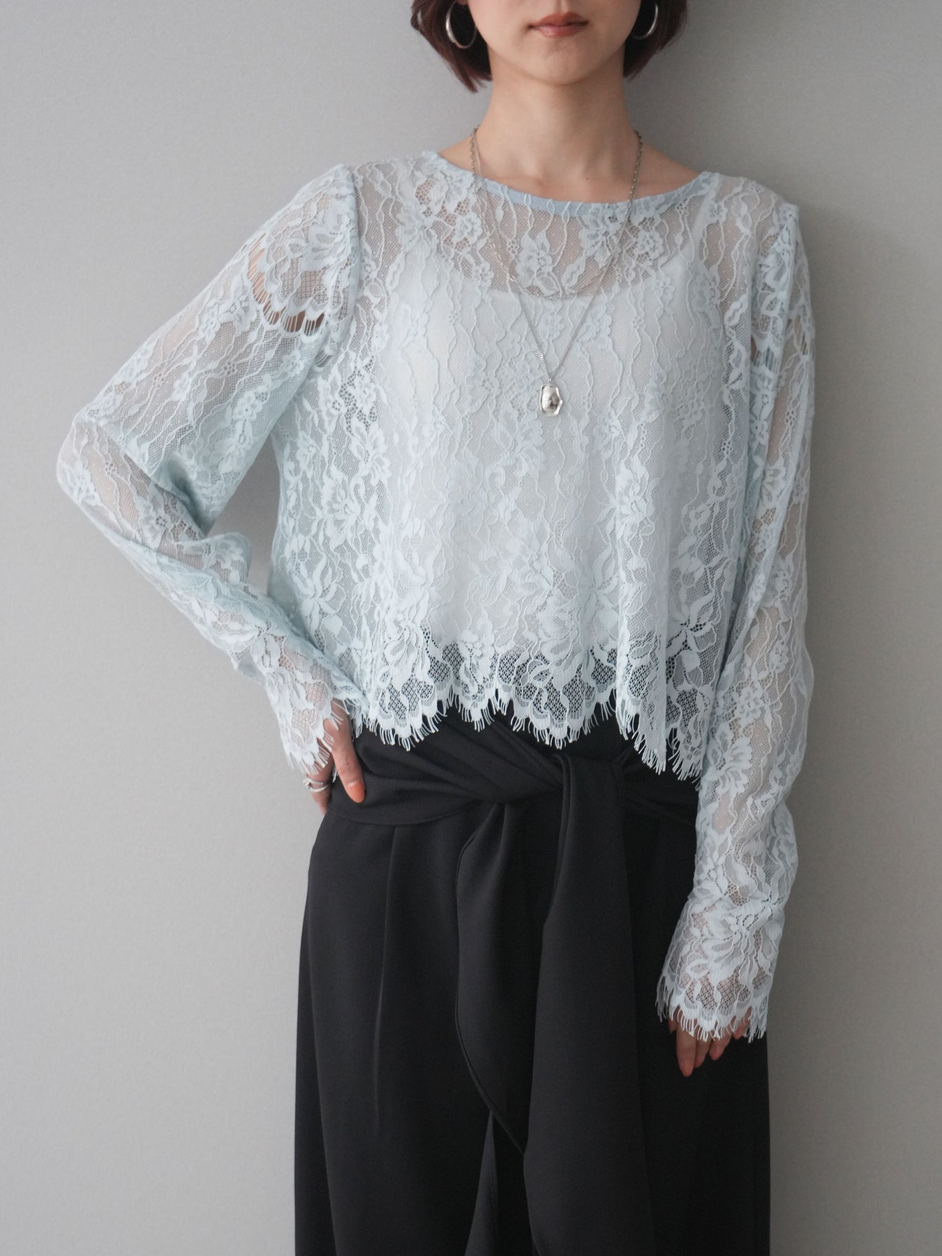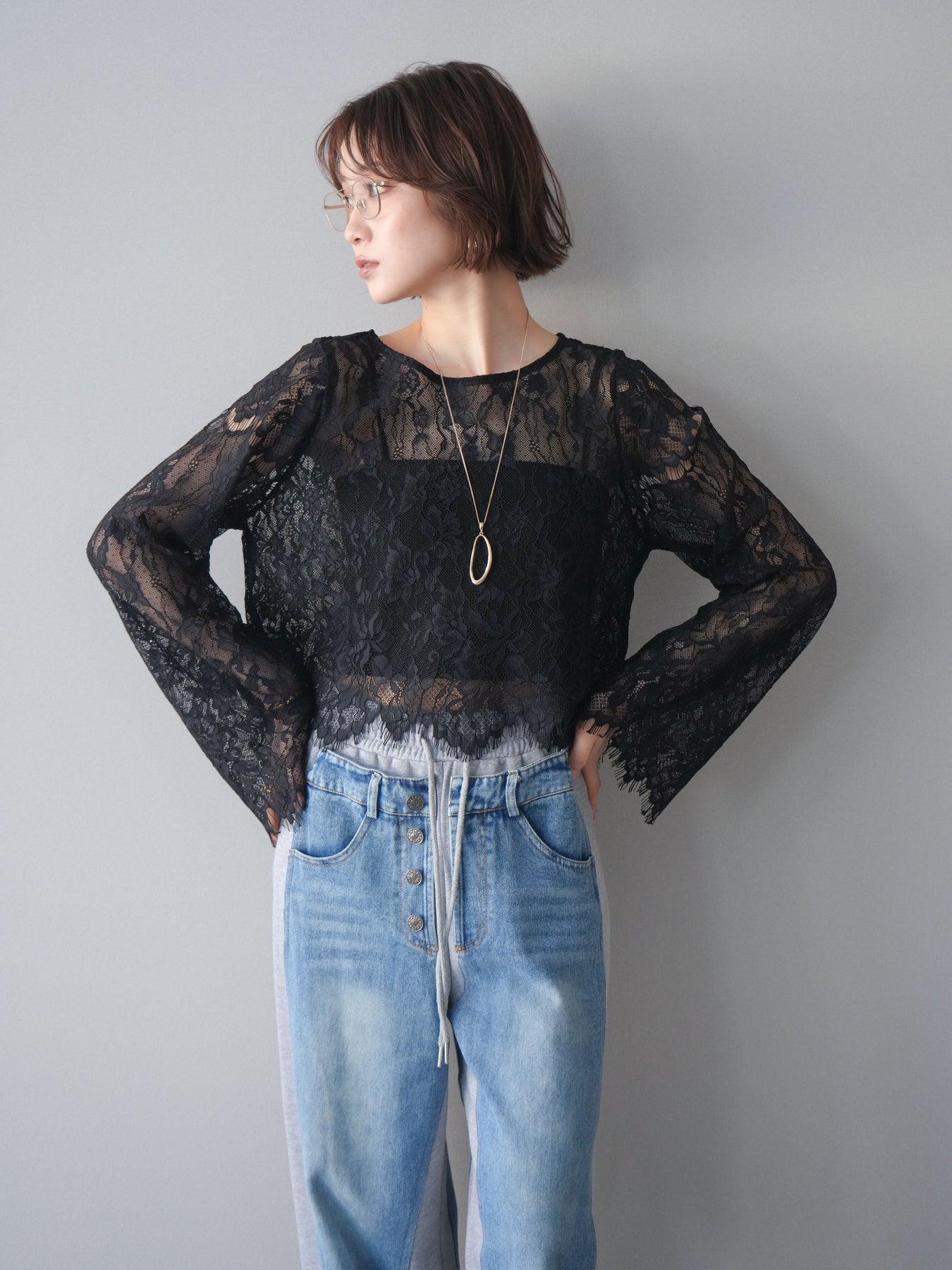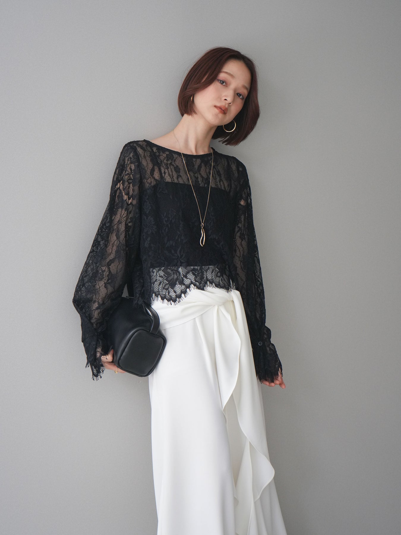 繊細な総レース素材が目を惹くロングスリーブトップス。透け感のある軽やかな風合いで、スタイリングに抜け感をプラスしてくれます。すっきりとしたシルエットでインナー使いにも重宝し、キャミソールやタンクトップを重ねてヘルシーに着こなすのもおすすめ。デニムやスラックス、ジャンパースカートのインナーなど、幅広いコーディネートに取り入れやすい一枚です。 ※ボトムス、キャミソール(インナー)以外の商品は一律でインナーは付属していません