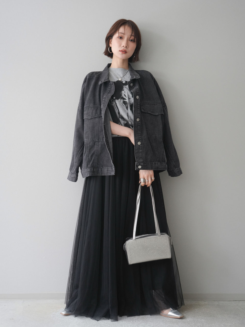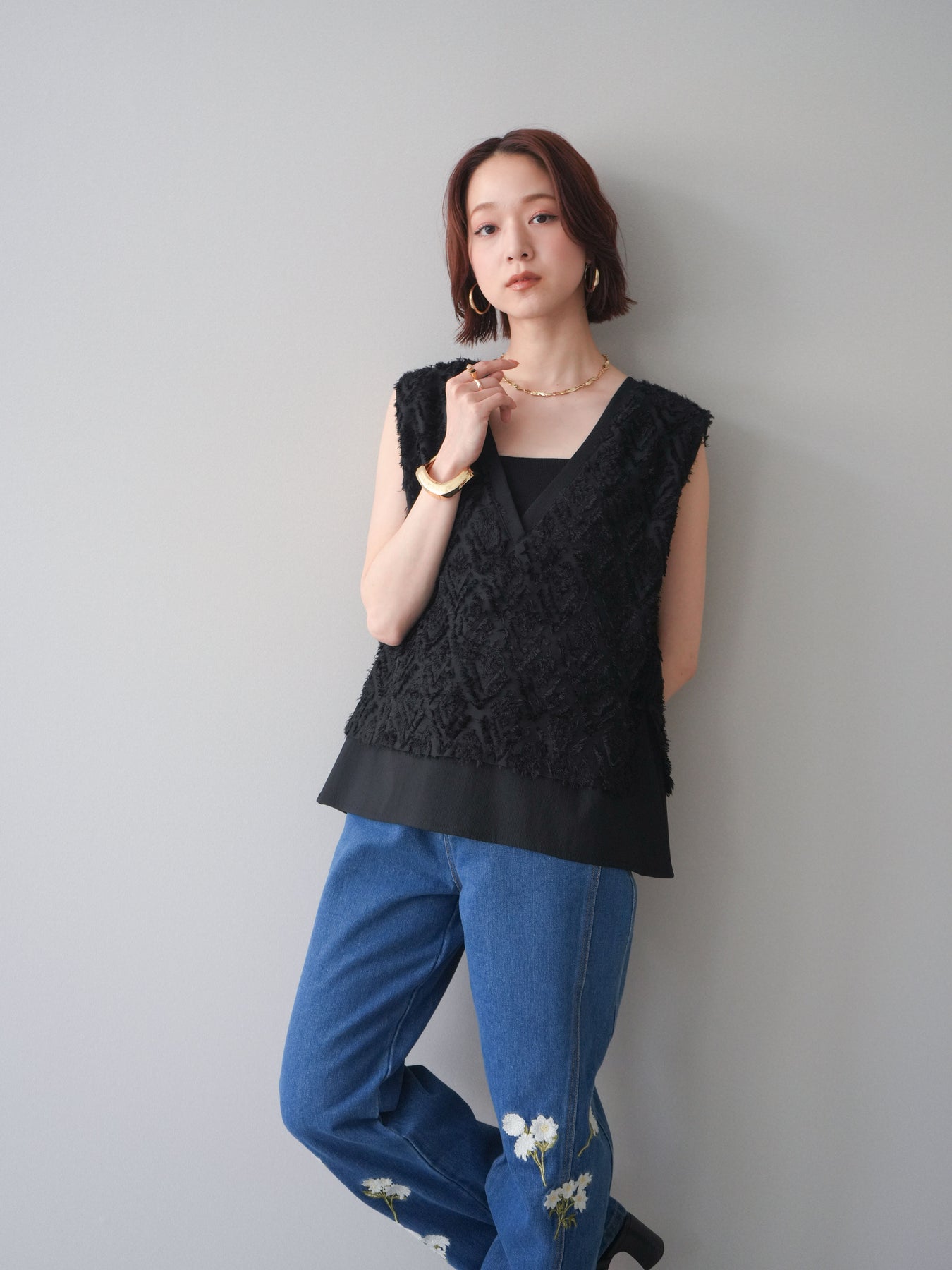 [SET]フリンジレイヤードVネックノースリーブ+フラワー刺繍ストレートデニム(2set)