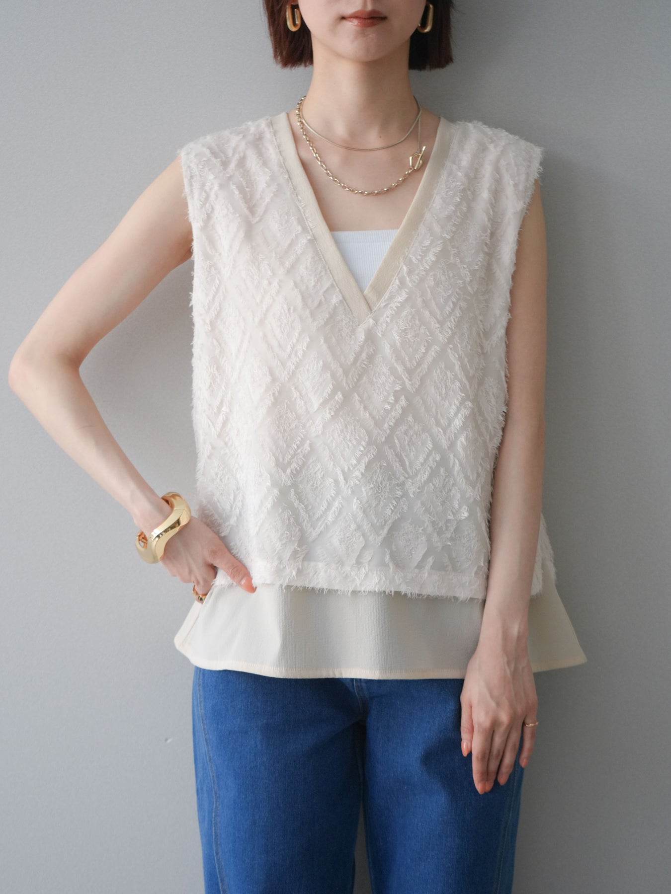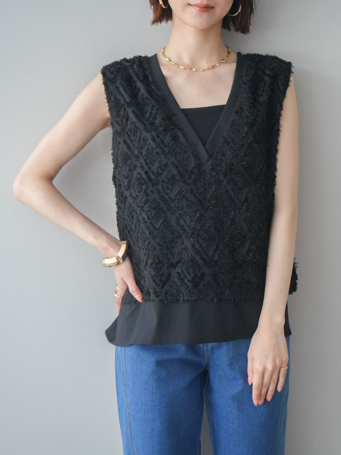 立体感のあるフリンジ素材が印象的なVネックノースリーブトップス。表情豊かなフリンジ生地と、裾から覗くレイヤードデザインが奥行きのあるスタイリングを演出します。深すぎないVネックが顔まわりをすっきりと見せ、シャツやシアートップスとのレイヤードはもちろん、1枚でもバランスよく着こなせるシルエットに仕上げました。シンプルなボトムスに合わせるだけでコーディネートが完成する、着回し力の高いアイテムです。 ※ボトムス、キャミソール(インナー)以外の商品は一律でインナーは付属していません