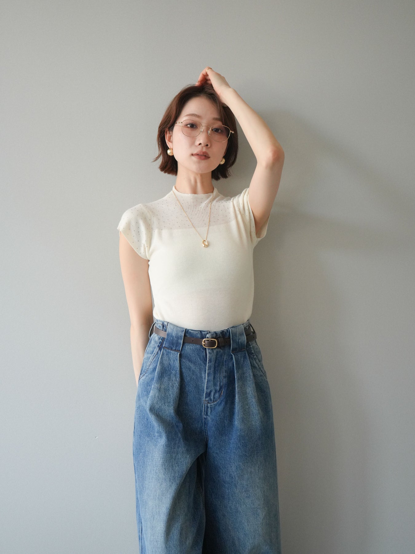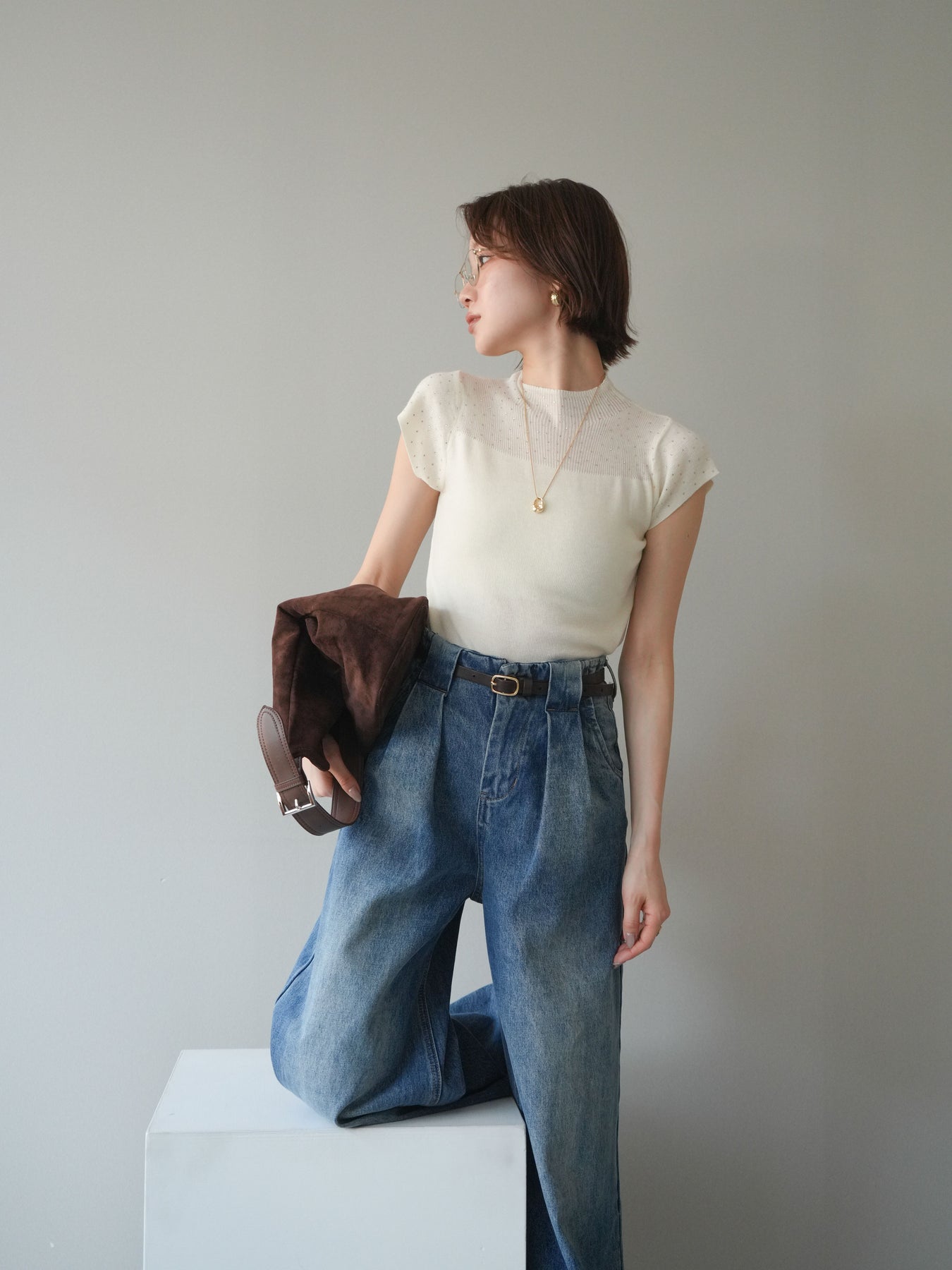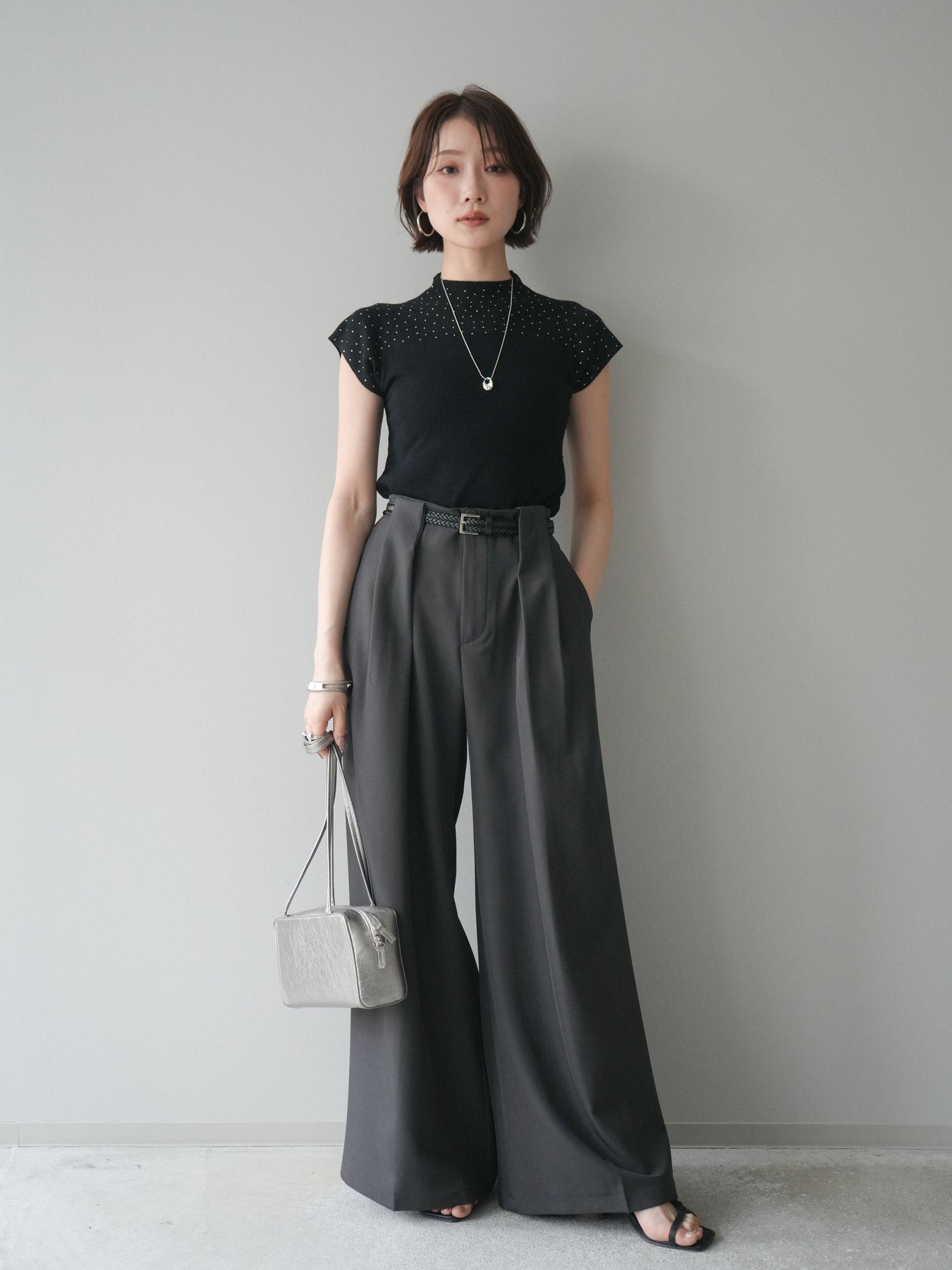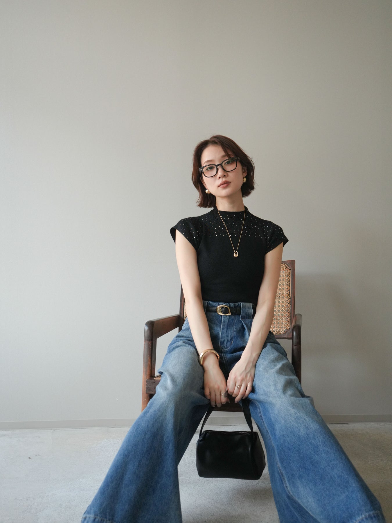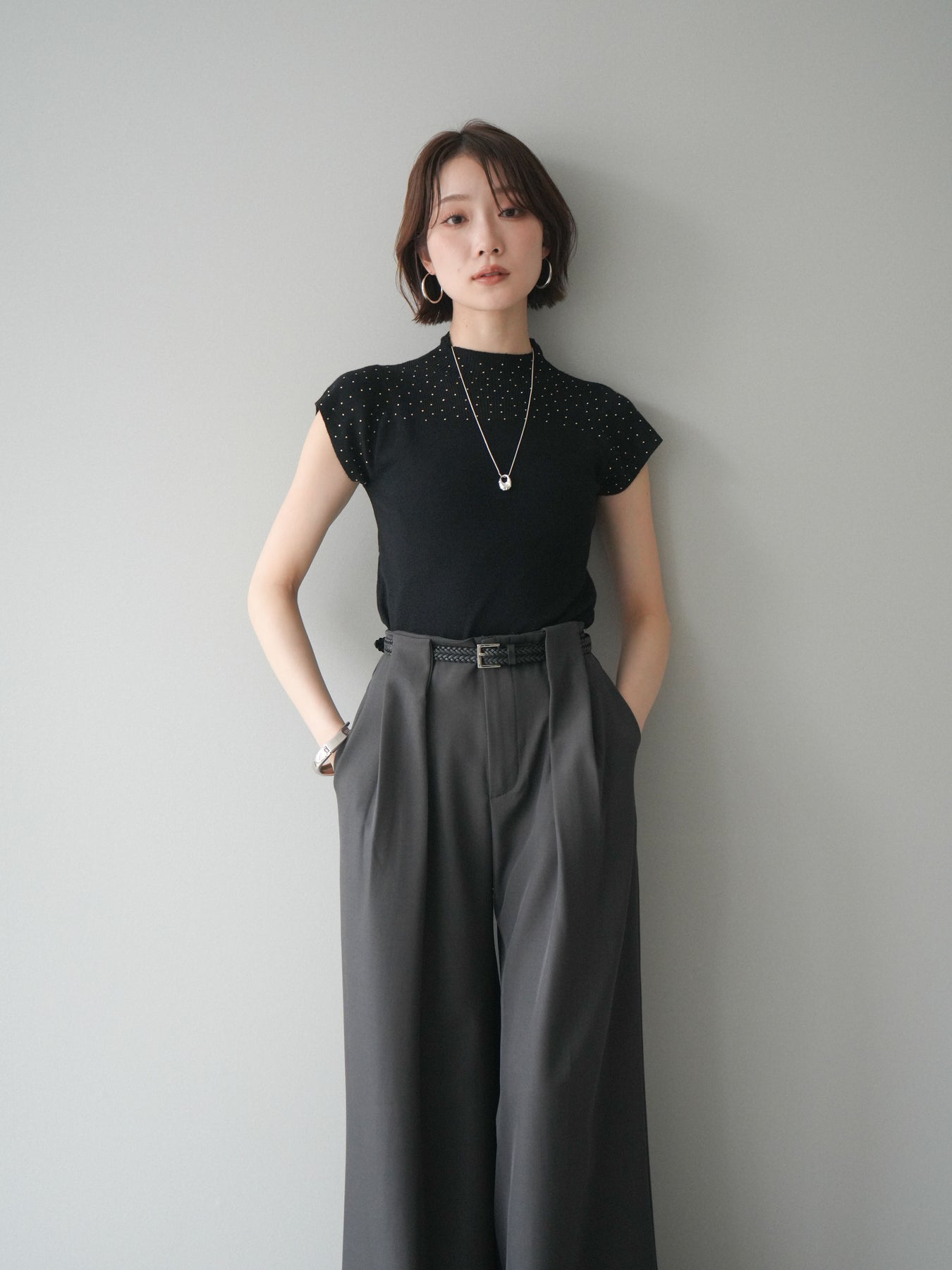 繊細なビジューがきらめくシアーフレンチニット。ネックラインから肩にかけてあしらわれたさりげない装飾が上品な華やかさをプラスし、シンプルな中にも特別感のある一着に仕上げています。程よい透け感のある編み地が軽やかな抜け感を演出し、女性らしい柔らかな印象に。肩をやさしく覆うフレンチスリーブがすっきりとしたシルエットを引き立て、バランスよく着用できます。デニムやスラックスと合わせたカジュアルスタイルはもちろん、きれいめなボトムスと合わせた上品なコーディネートにもおすすめのアイテムです。 ※ボトムス、キャミソール(インナー)以外の商品は一律でインナーは付属していません。