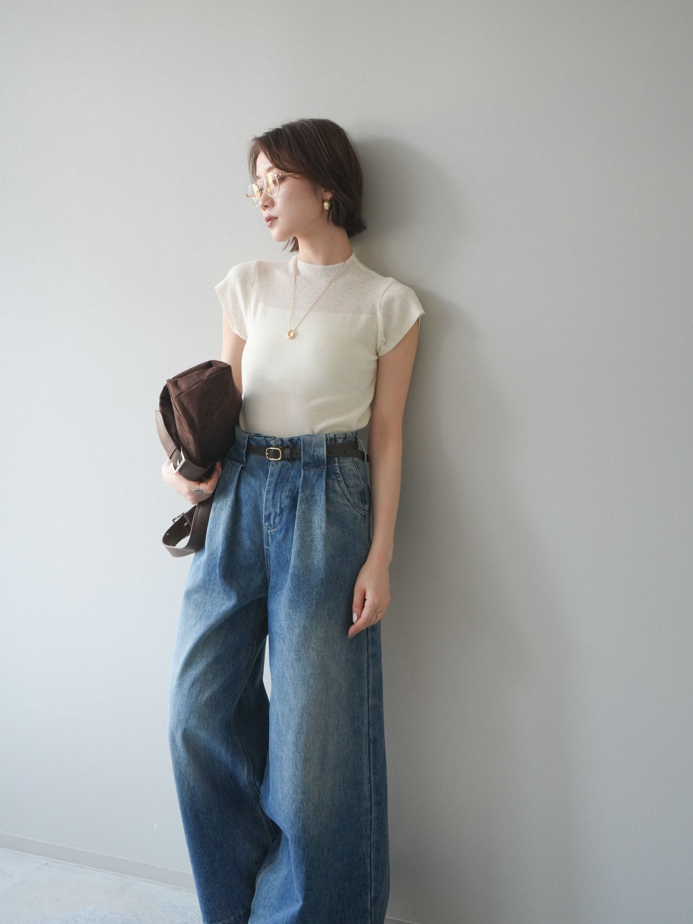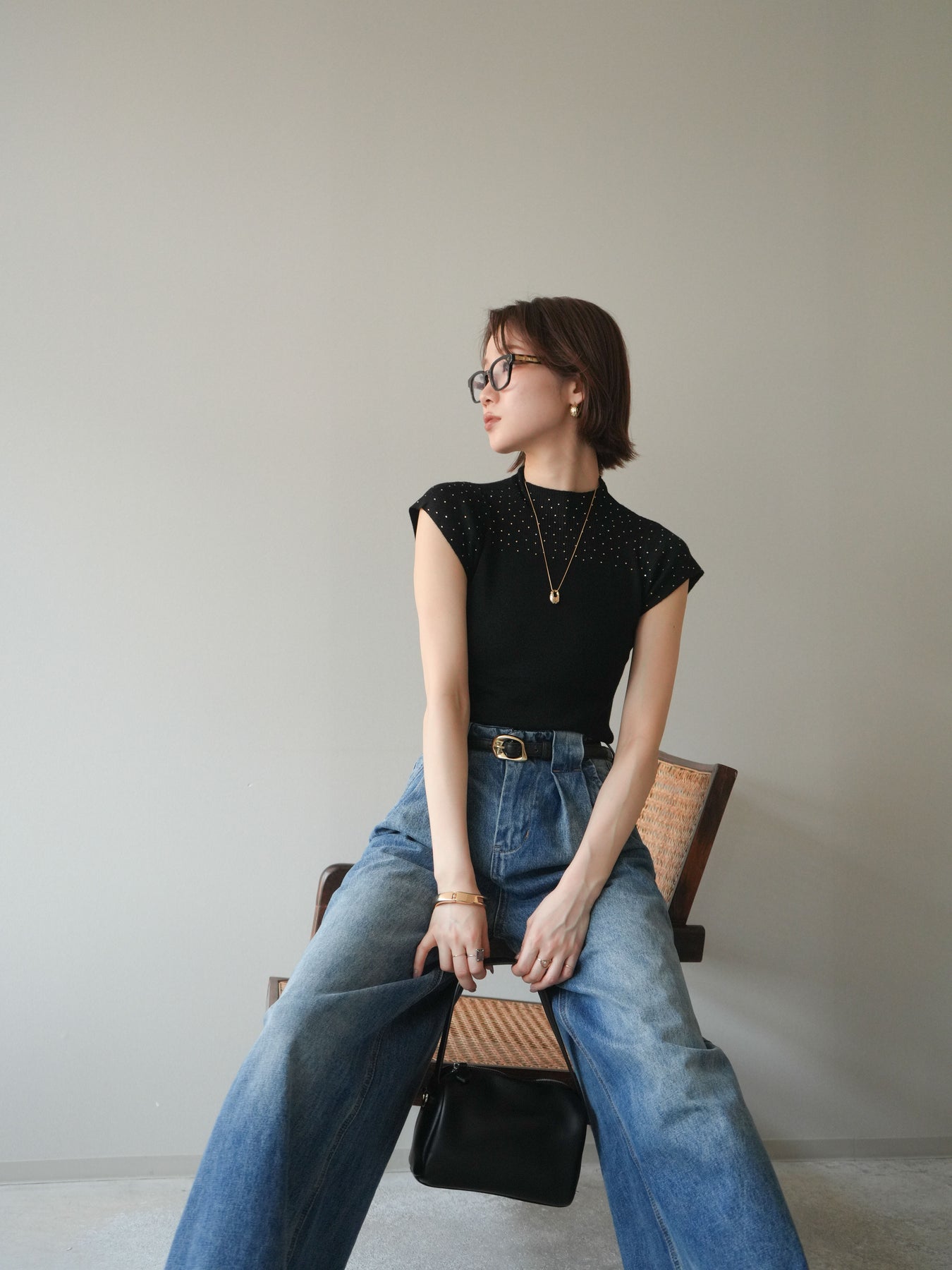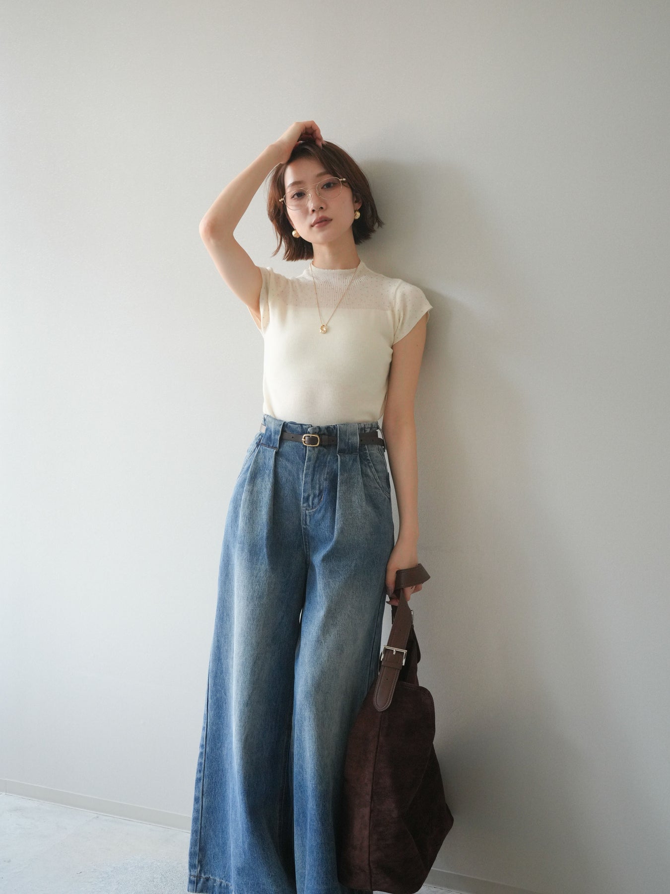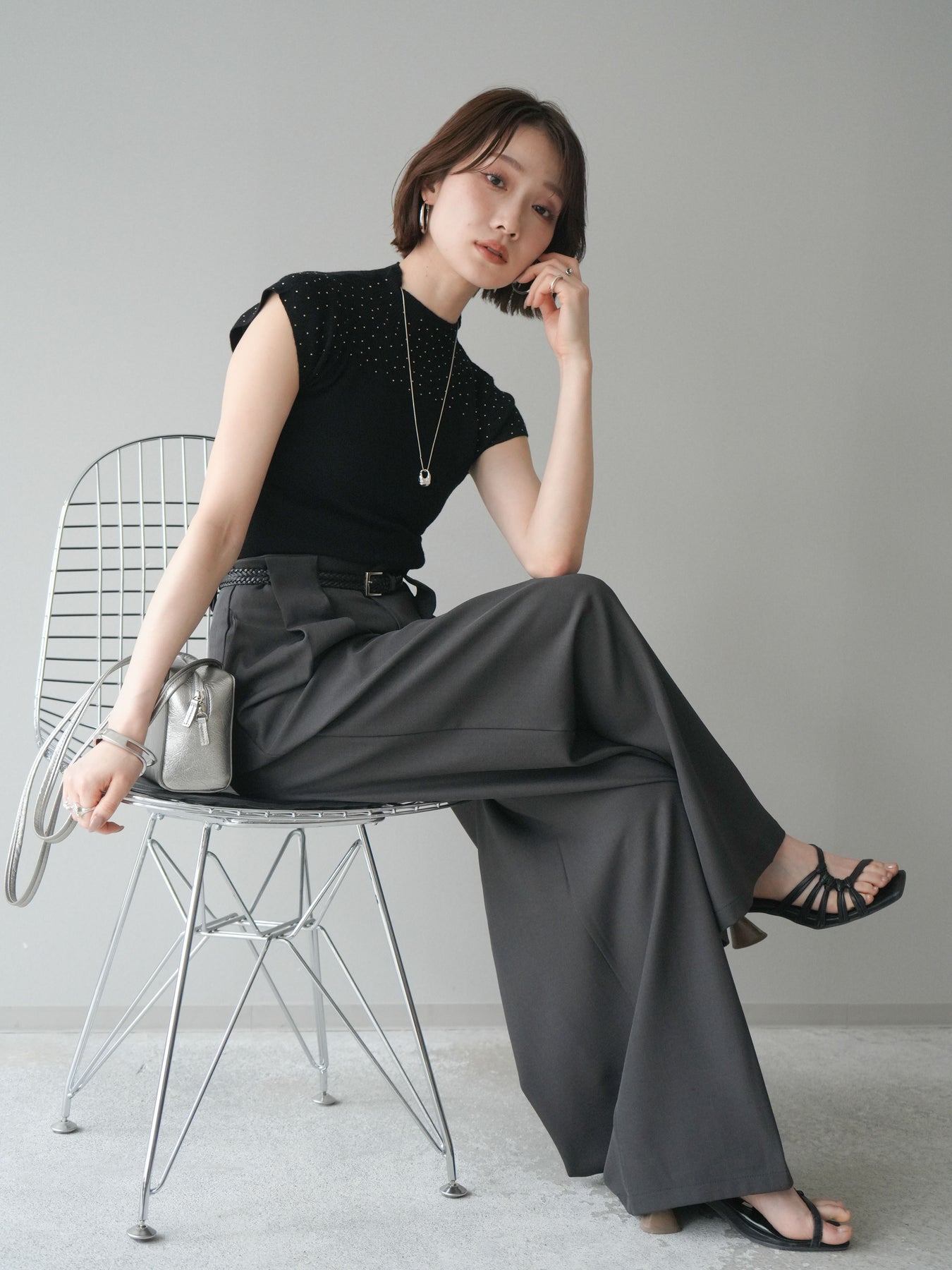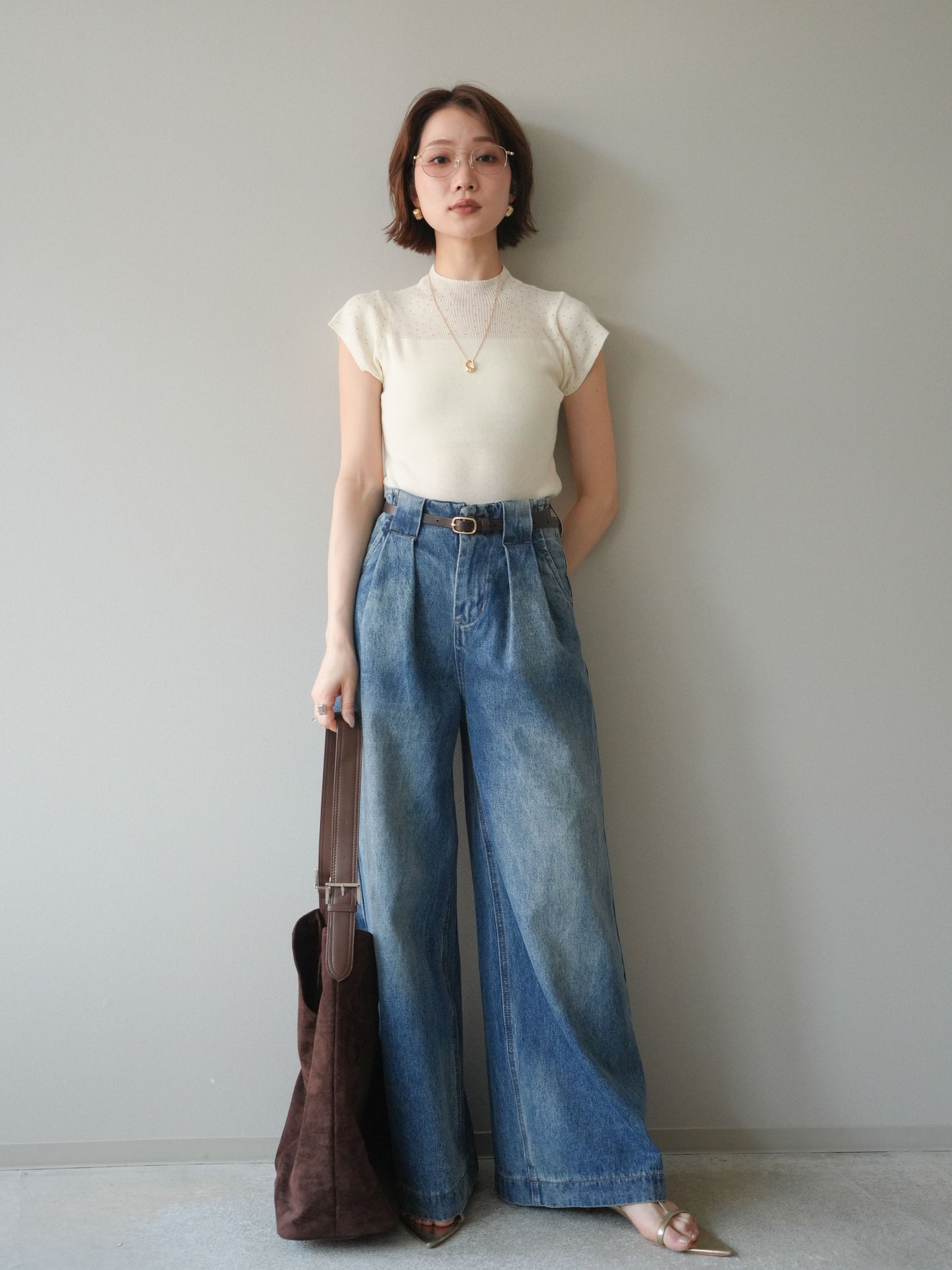 繊細なビジューがきらめくシアーフレンチニット。ネックラインから肩にかけてあしらわれたさりげない装飾が上品な華やかさをプラスし、シンプルな中にも特別感のある一着に仕上げています。程よい透け感のある編み地が軽やかな抜け感を演出し、女性らしい柔らかな印象に。肩をやさしく覆うフレンチスリーブがすっきりとしたシルエットを引き立て、バランスよく着用できます。デニムやスラックスと合わせたカジュアルスタイルはもちろん、きれいめなボトムスと合わせた上品なコーディネートにもおすすめのアイテムです。 ※ボトムス、キャミソール(インナー)以外の商品は一律でインナーは付属していません。