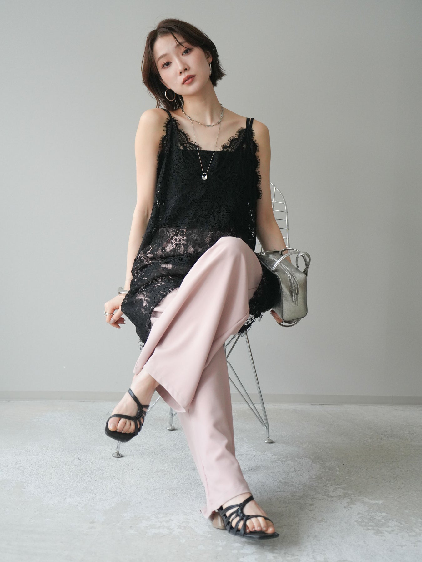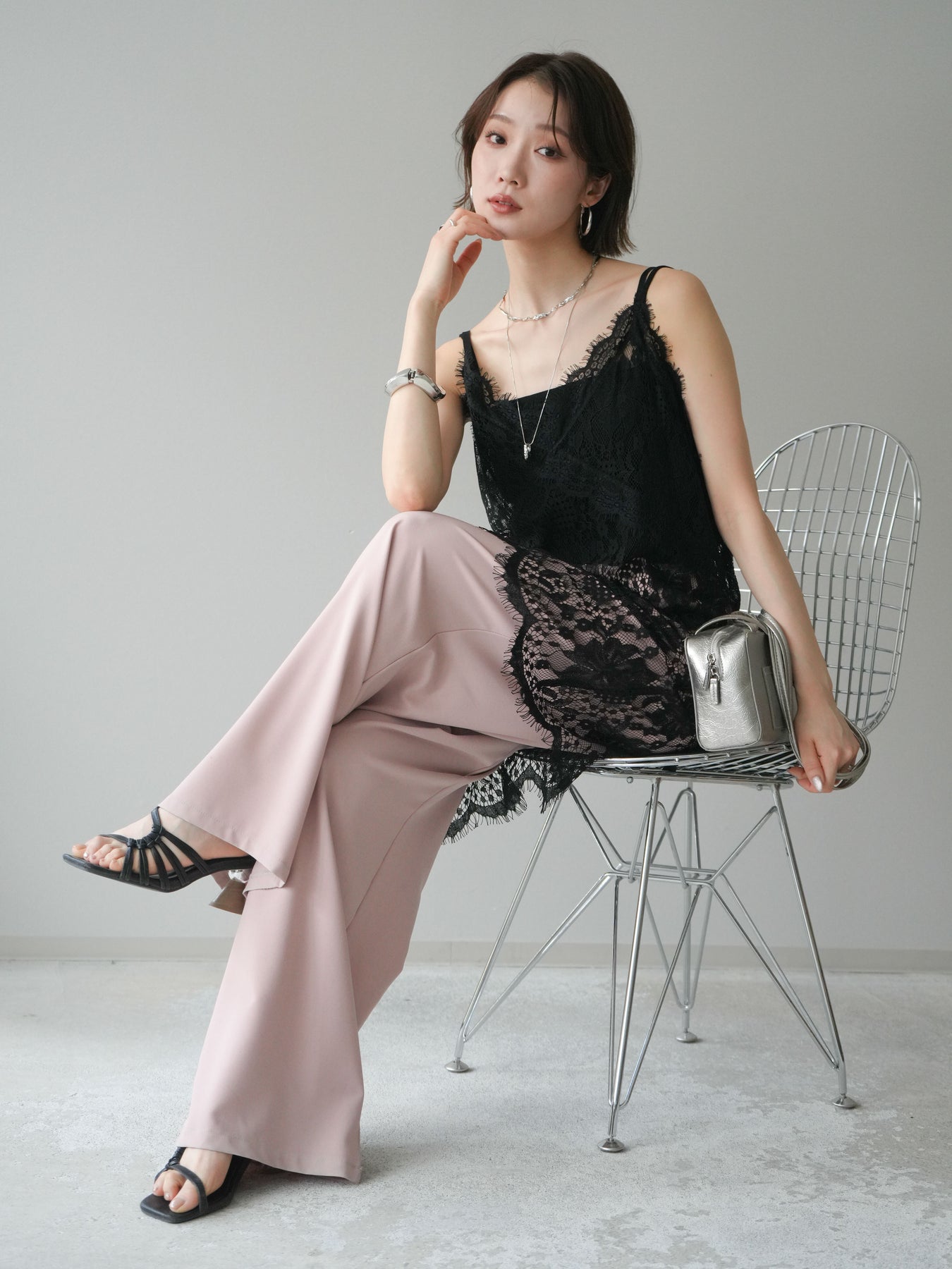 [SET]総レースチュニックキャミソール+ベルト付キーホルダーモチーフワイドパンツ(2set)