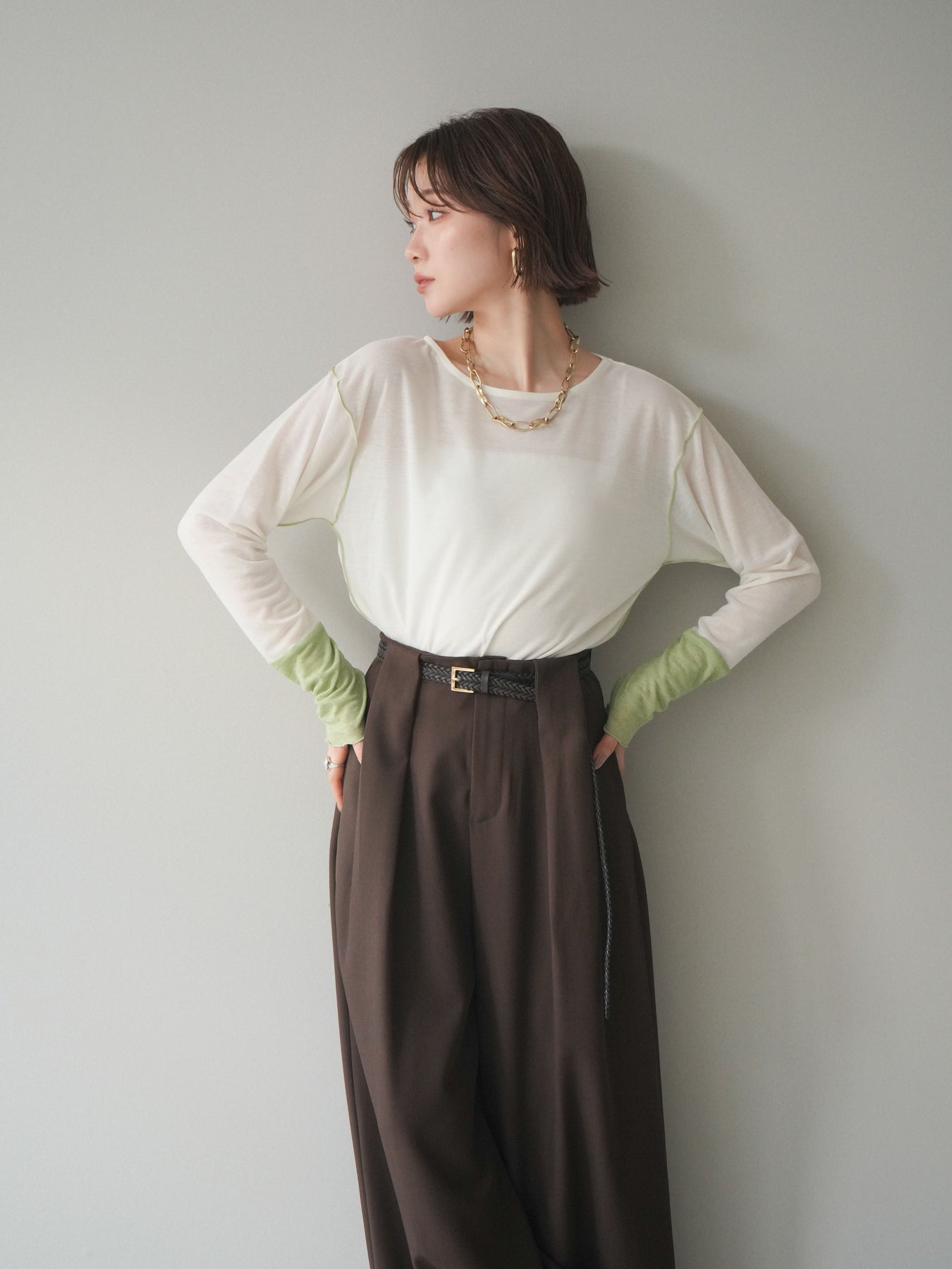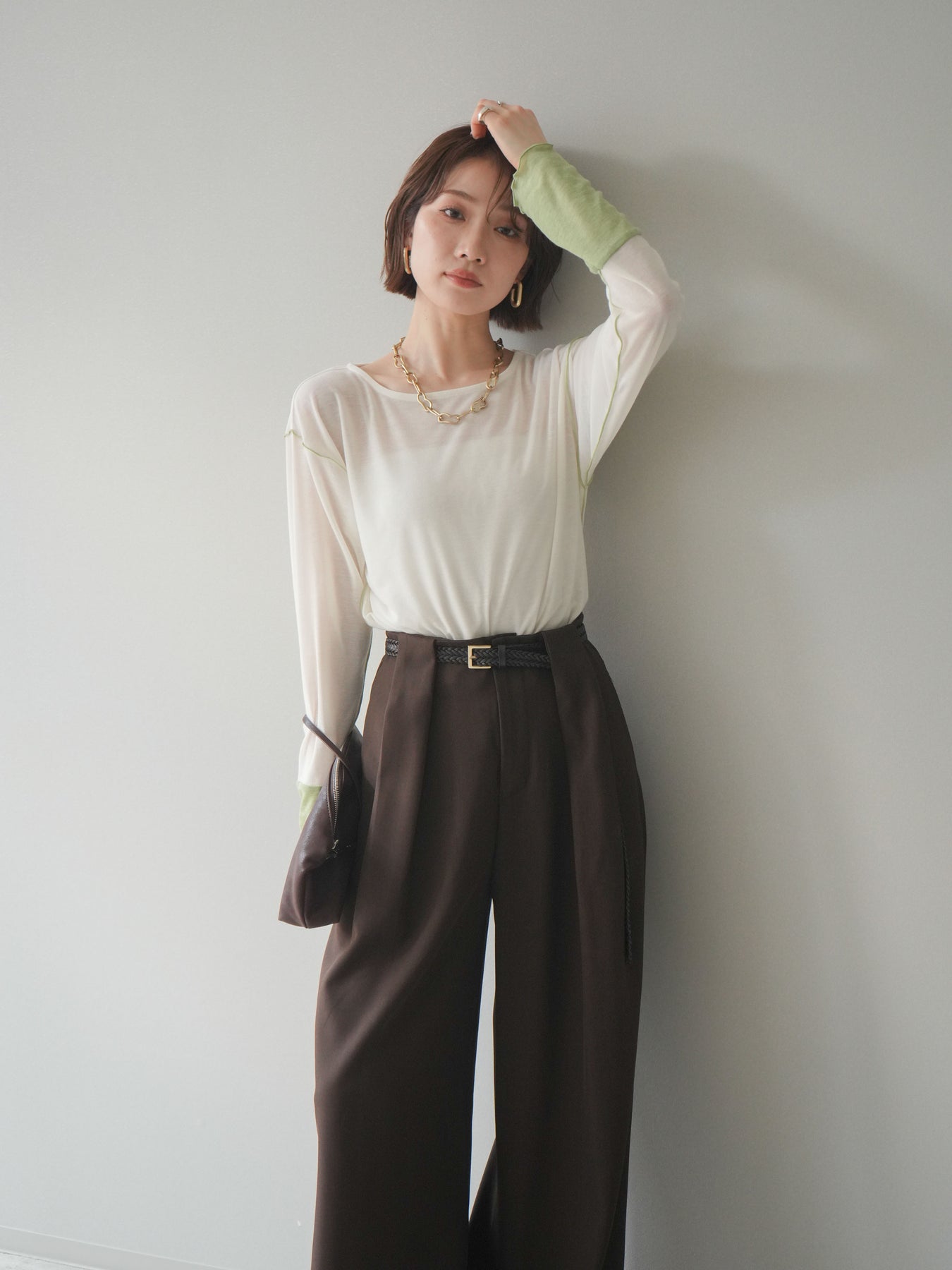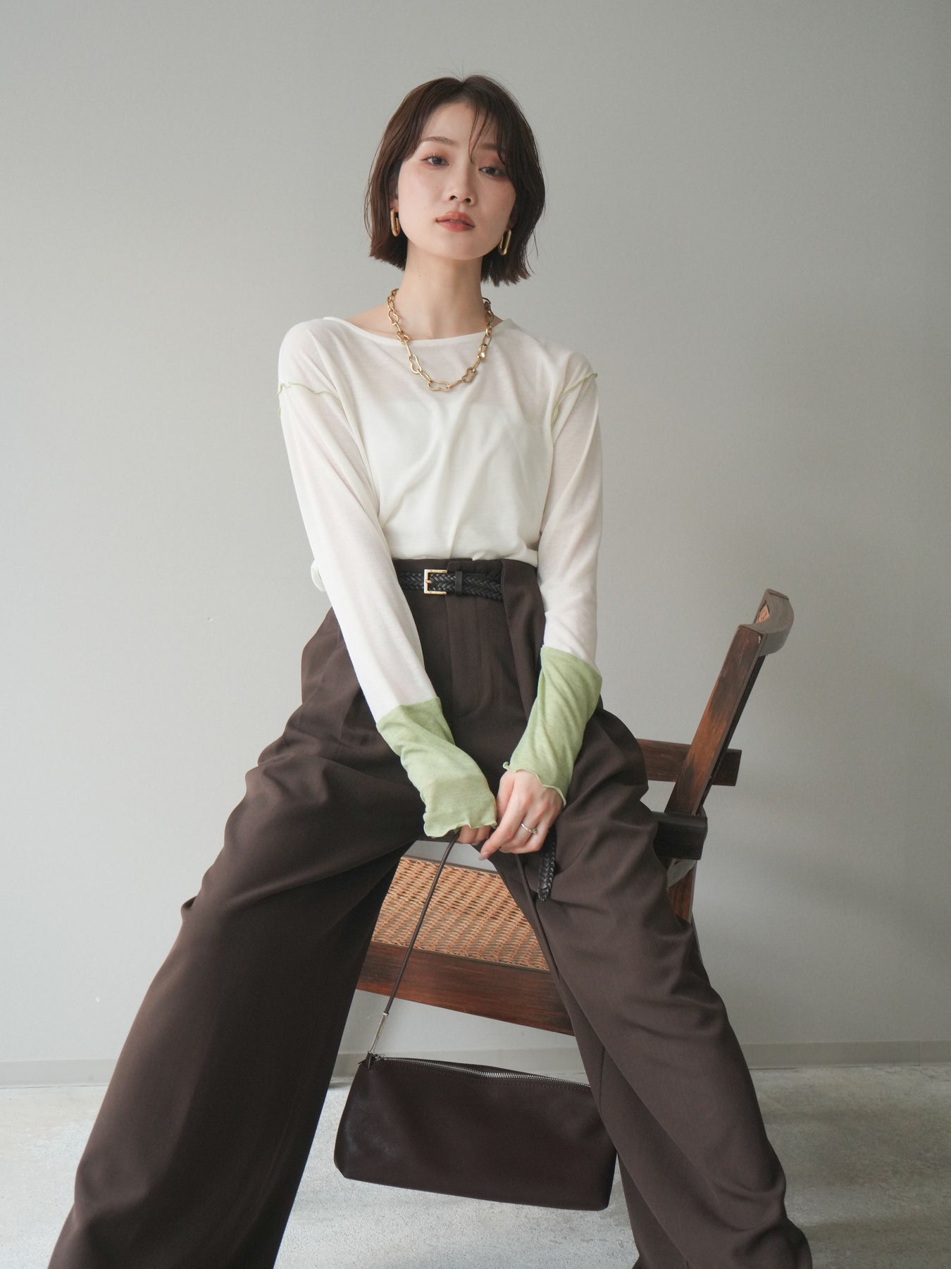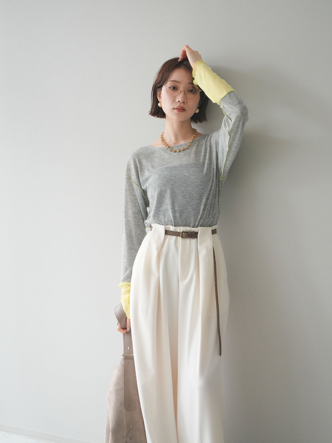配色のメローデザインがアクセントになったシアートップス。さりげないコントラストがスタイリングに動きを与え、シンプルながらも印象的な一着に仕上げています。程よい透け感のある軽やかな素材で、抜け感のある着こなしを演出。ボディに自然に沿うすっきりとしたシルエットで、女性らしいラインを引き立てつつ、レイヤードにも取り入れやすいデザインです。キャミソールやワンピースのインナーとしてはもちろん、1枚でさらっと着てもスタイリングが決まる、着回し力の高いアイテムです。 ※ボトムス、キャミソール(インナー)以外の商品は一律でインナーは付属していません。