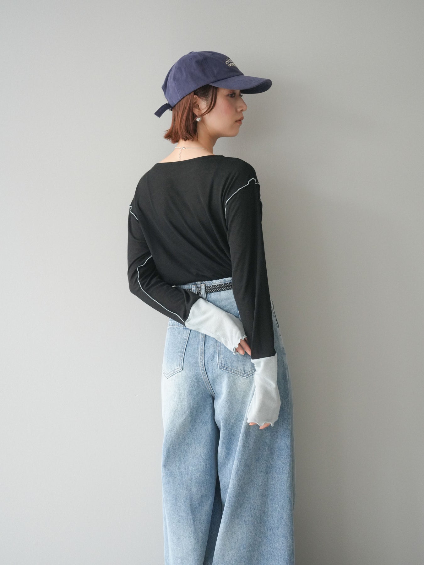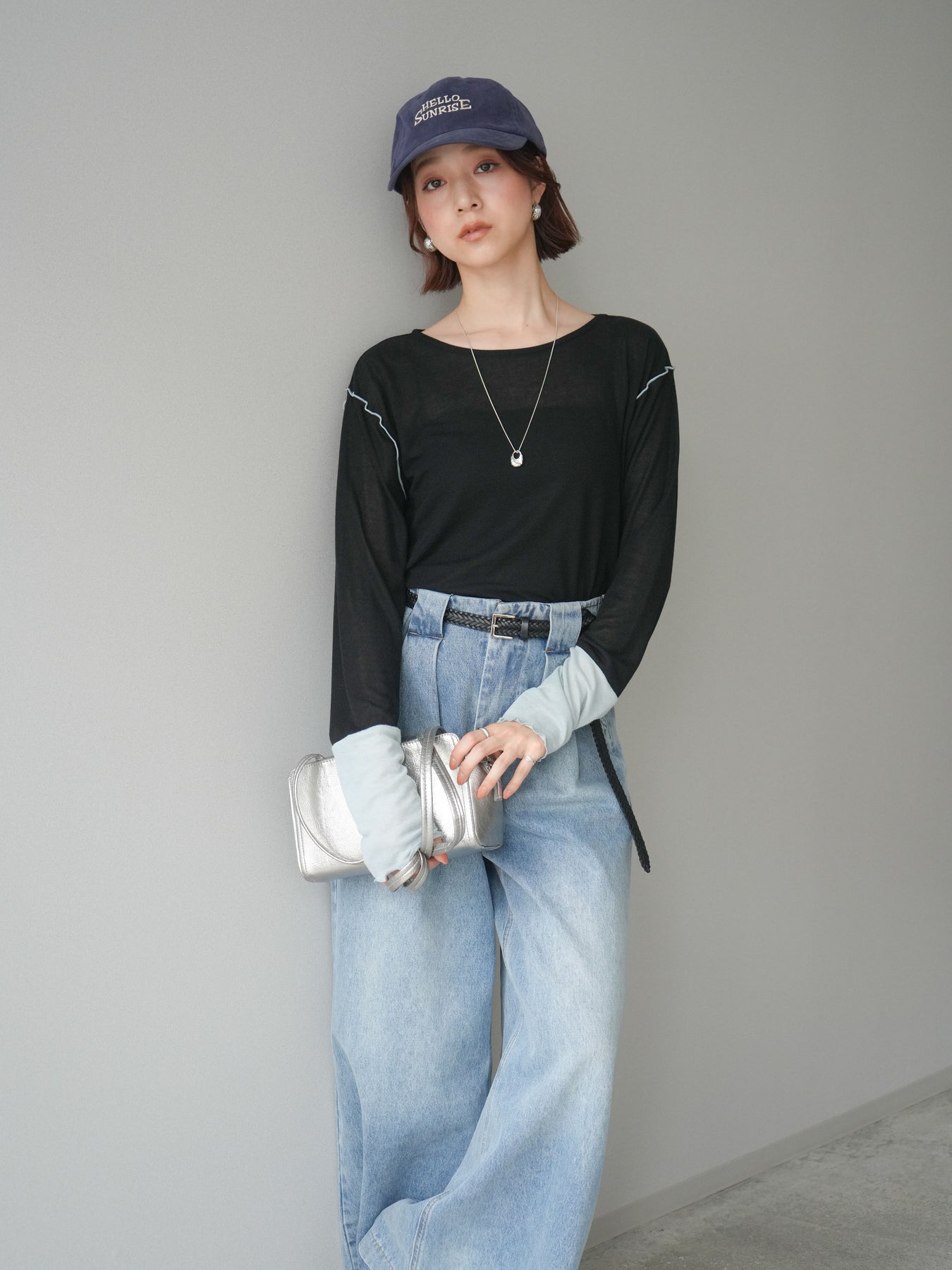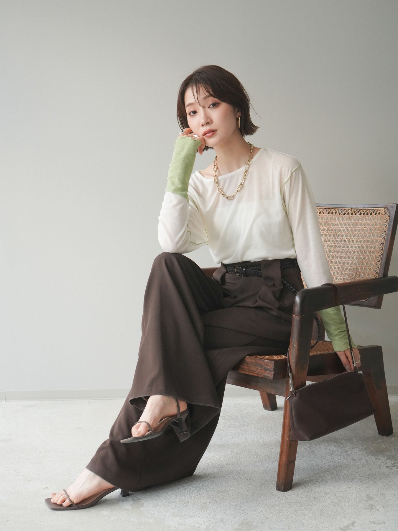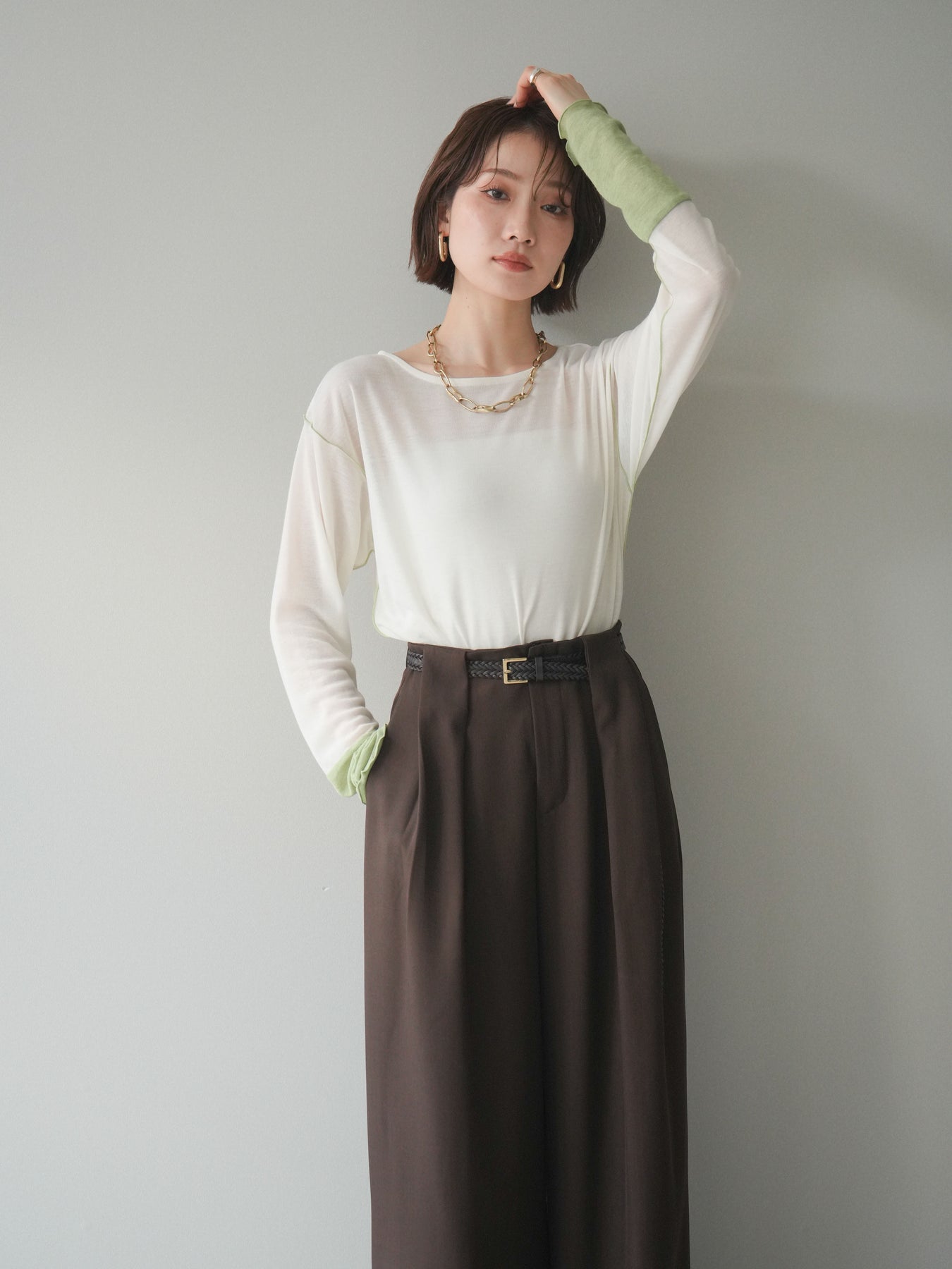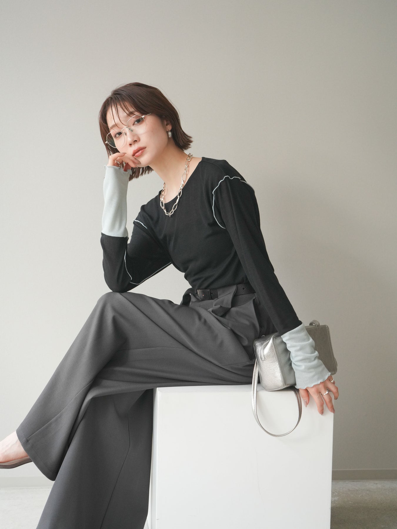 配色のメローデザインがアクセントになったシアートップス。さりげないコントラストがスタイリングに動きを与え、シンプルながらも印象的な一着に仕上げています。程よい透け感のある軽やかな素材で、抜け感のある着こなしを演出。ボディに自然に沿うすっきりとしたシルエットで、女性らしいラインを引き立てつつ、レイヤードにも取り入れやすいデザインです。キャミソールやワンピースのインナーとしてはもちろん、1枚でさらっと着てもスタイリングが決まる、着回し力の高いアイテムです。 ※ボトムス、キャミソール(インナー)以外の商品は一律でインナーは付属していません。