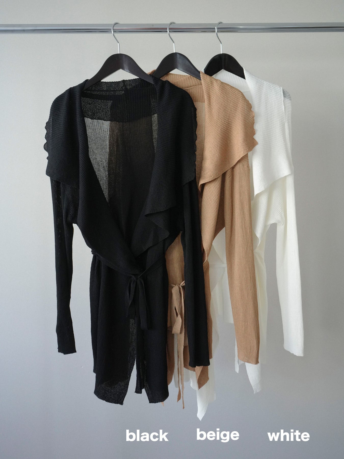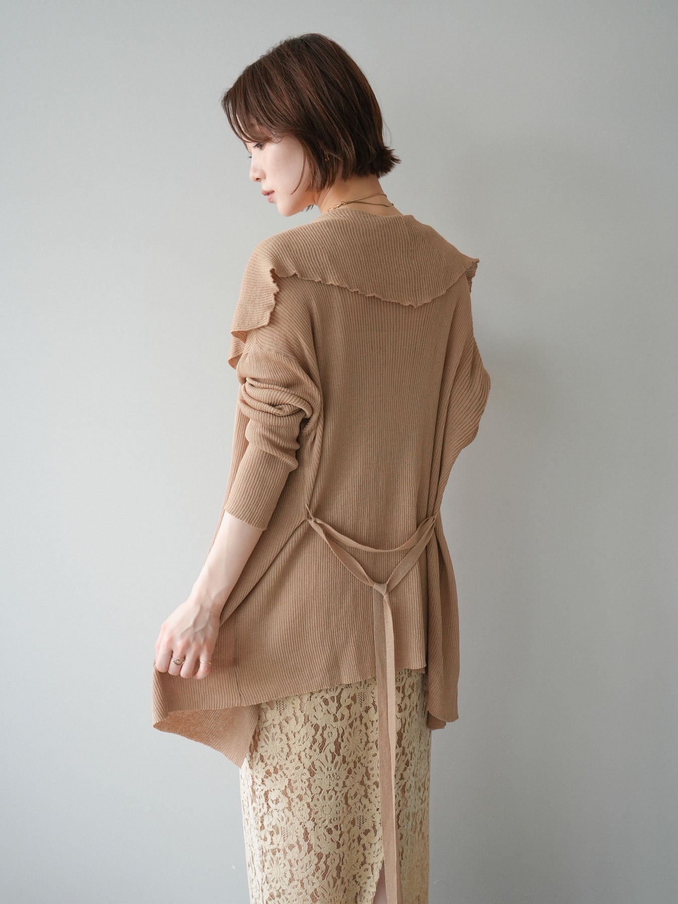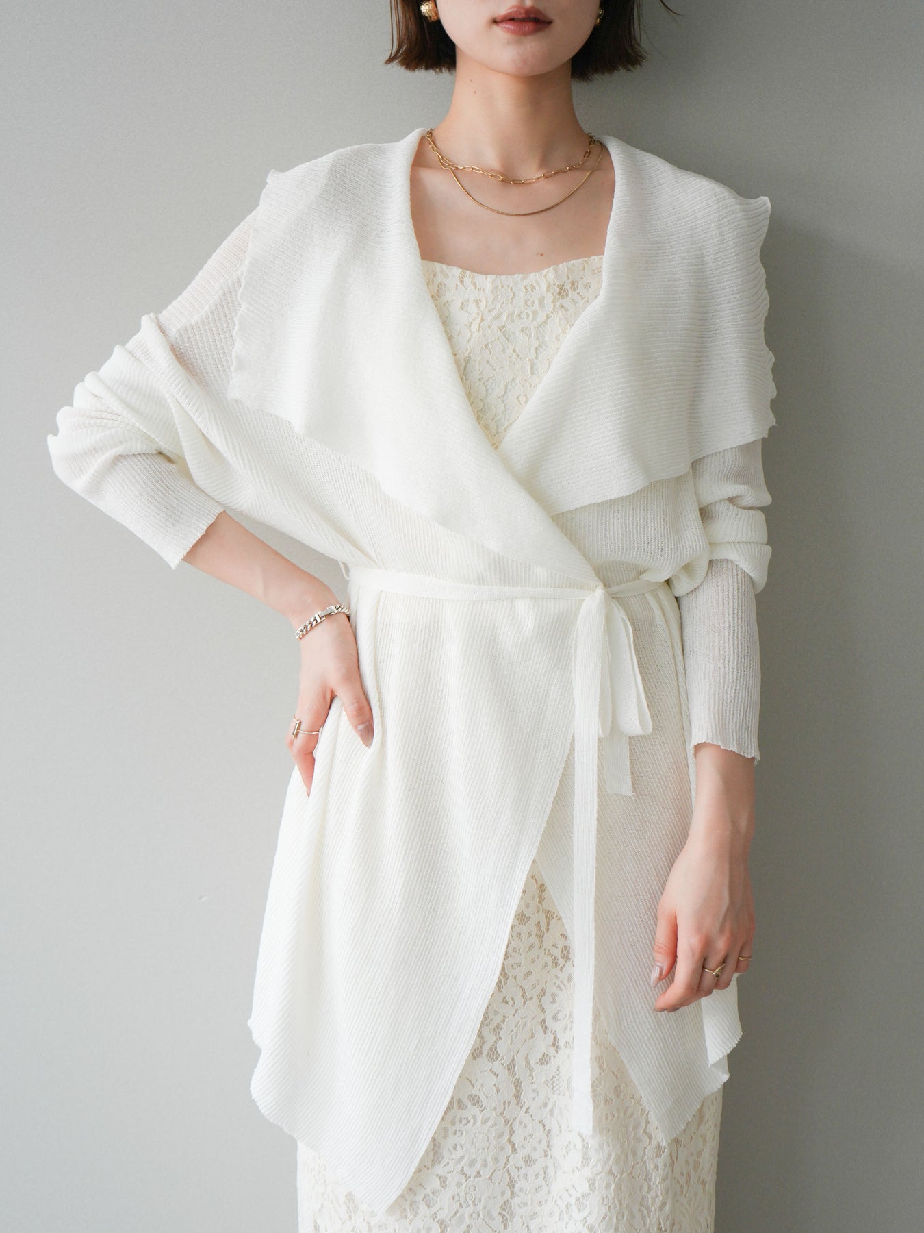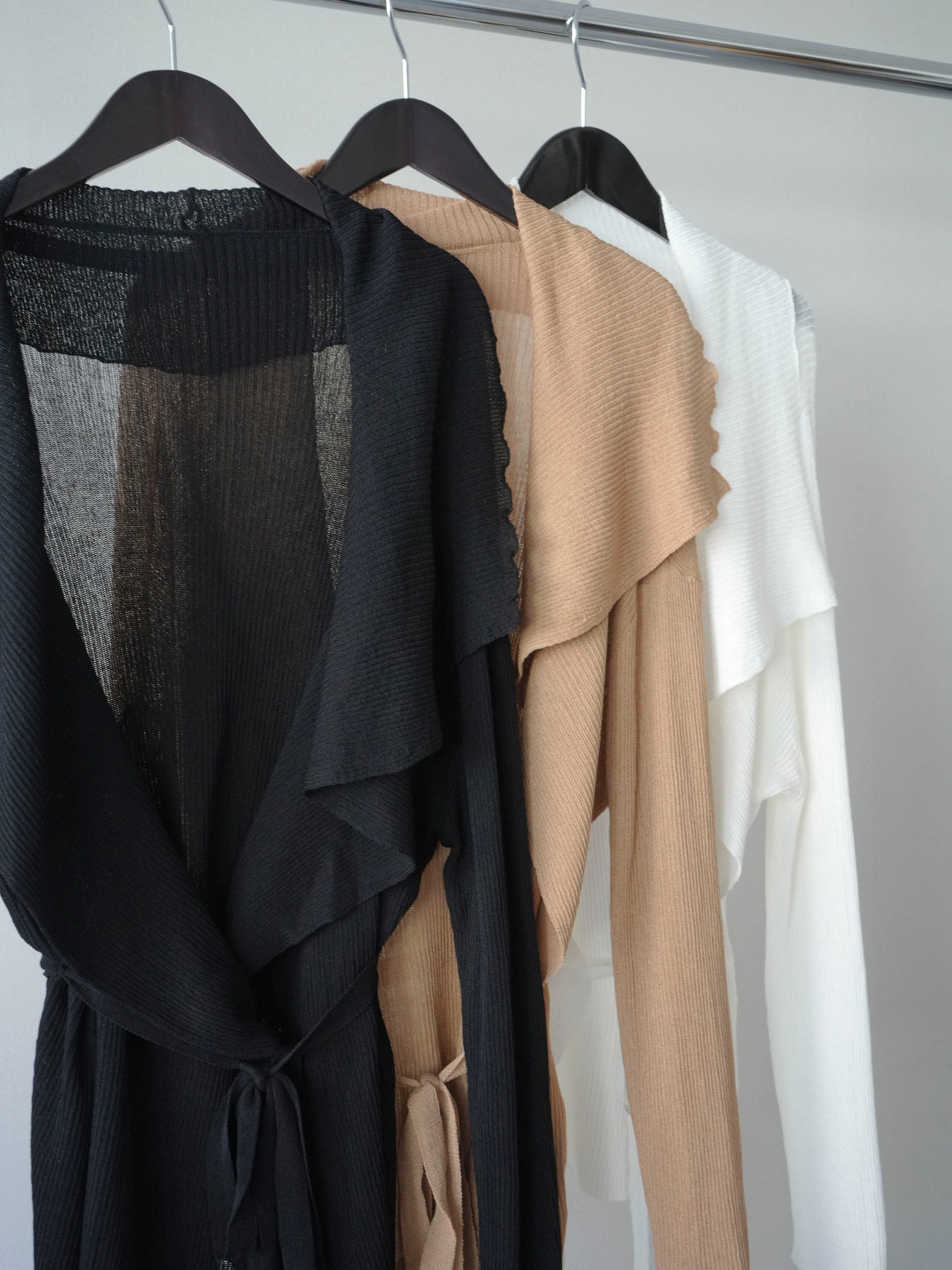 柔らかなリブニット素材が生み出す美しいドレープが魅力のガウン。肩から流れるように広がるシルエットが、上品で女性らしい印象を演出します。程よくボリュームのある襟元が顔まわりに華やかさをプラスし、羽織るだけでこなれたスタイリングに。ウエストベルト付きでシルエットのアレンジも楽しめ、メリハリのある着こなしも叶います。軽やかな着心地で季節の変わり目にも取り入れやすく、デイリーからきれいめなシーンまで幅広く活躍する一着です。