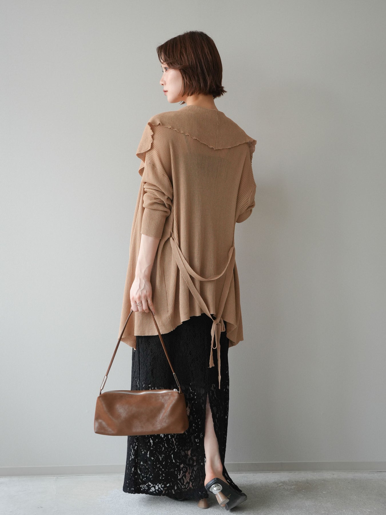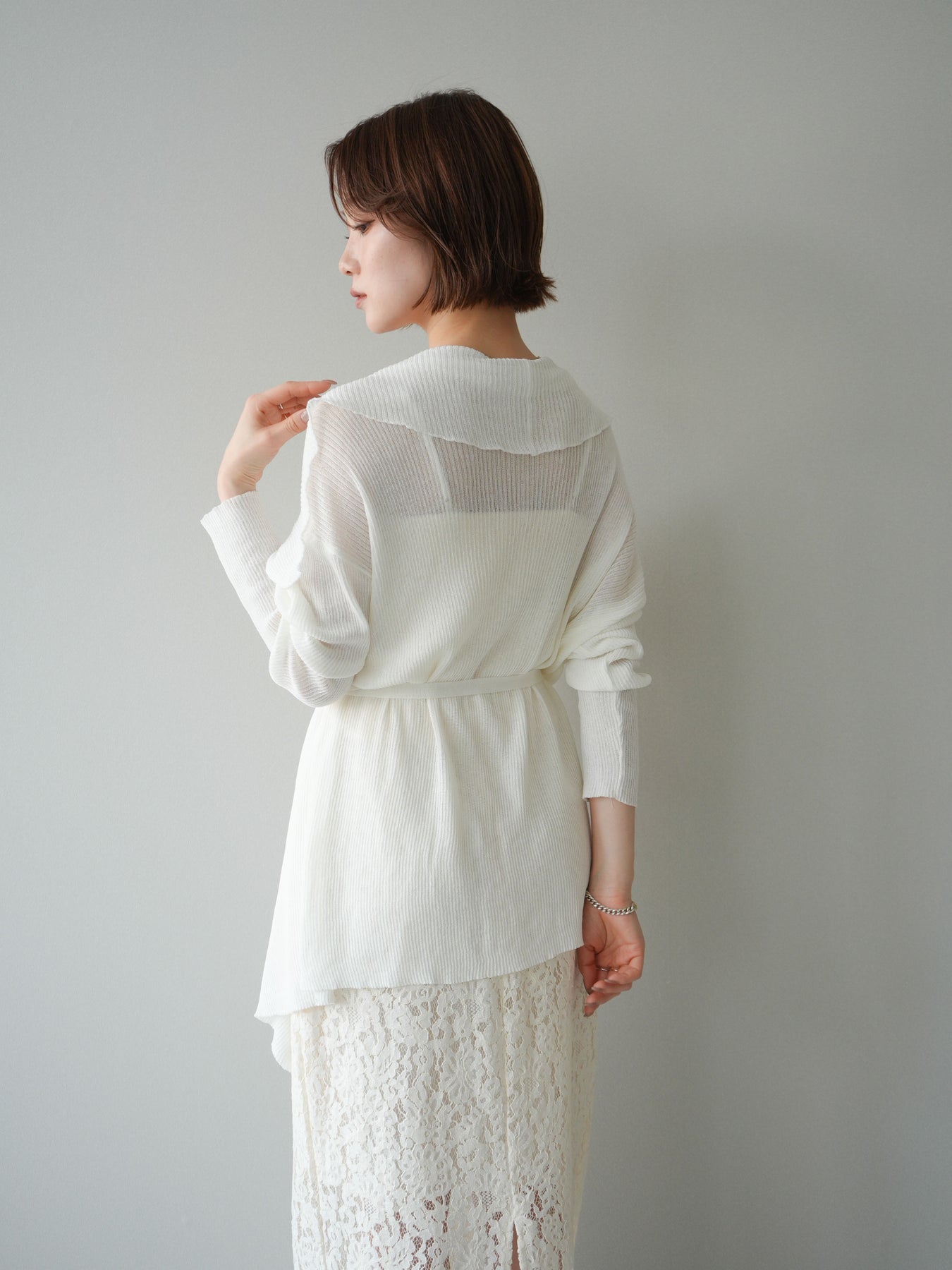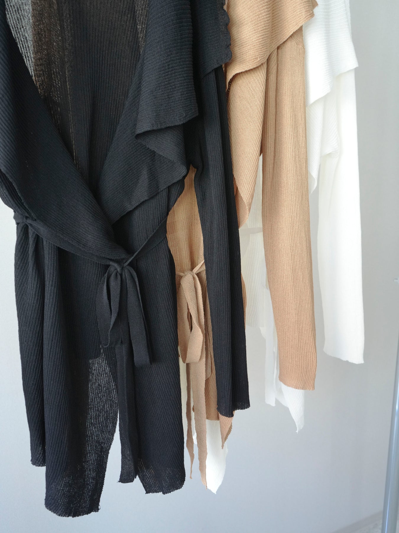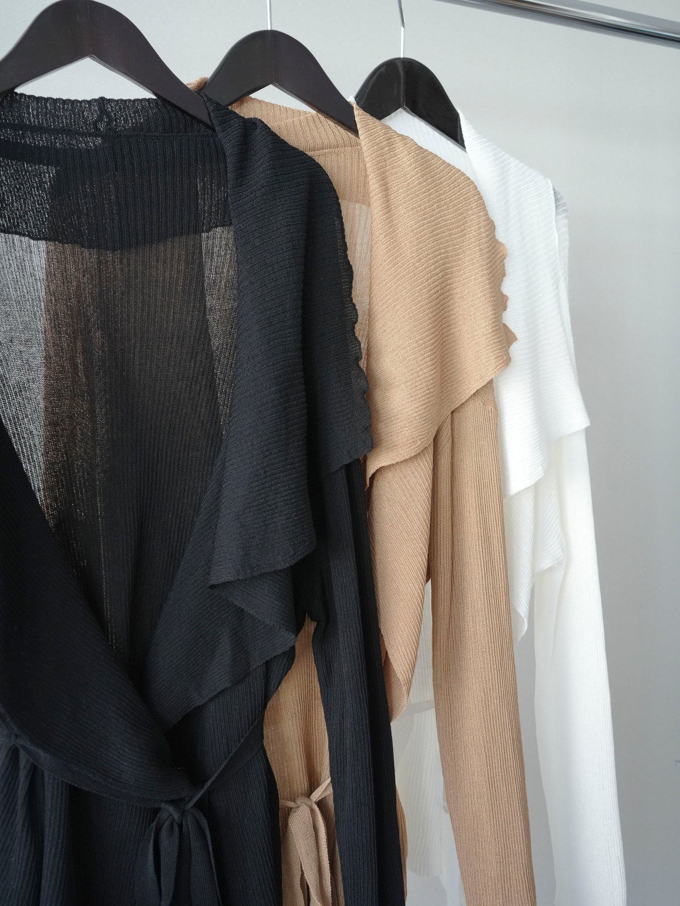 柔らかなリブニット素材が生み出す美しいドレープが魅力のガウン。肩から流れるように広がるシルエットが、上品で女性らしい印象を演出します。程よくボリュームのある襟元が顔まわりに華やかさをプラスし、羽織るだけでこなれたスタイリングに。ウエストベルト付きでシルエットのアレンジも楽しめ、メリハリのある着こなしも叶います。軽やかな着心地で季節の変わり目にも取り入れやすく、デイリーからきれいめなシーンまで幅広く活躍する一着です。