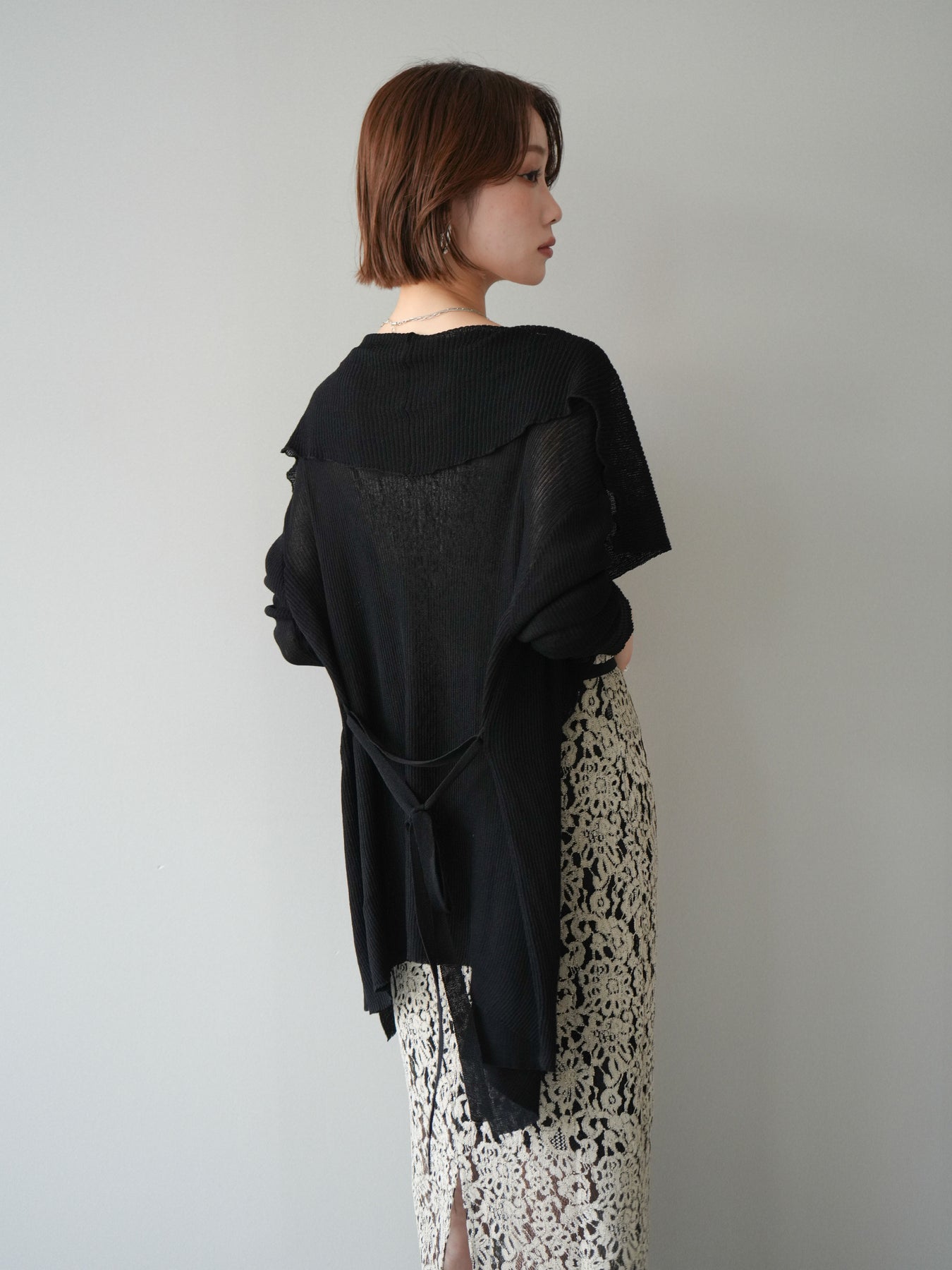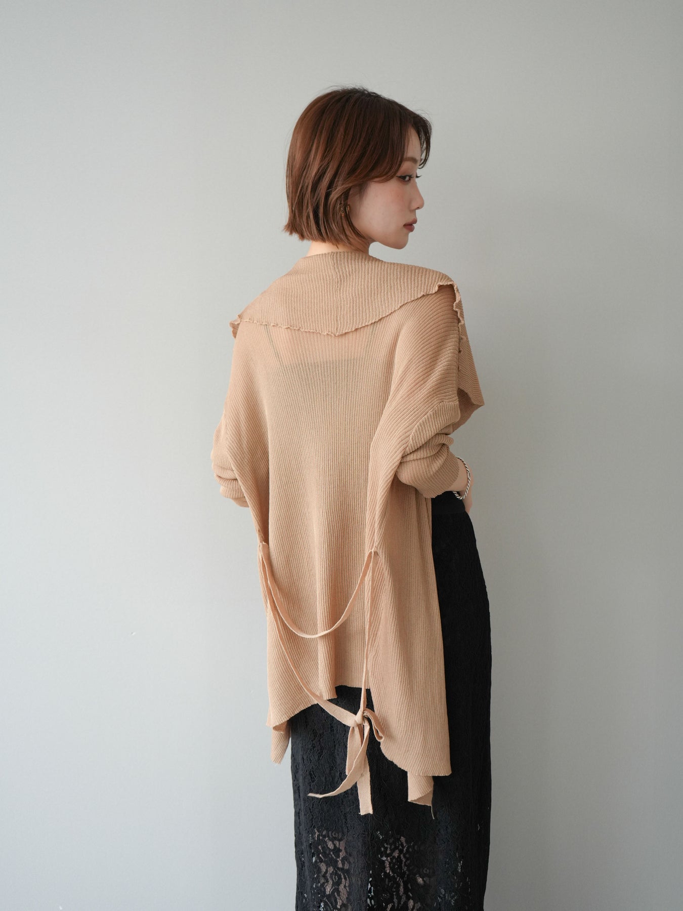 肩幅50cm バスト110cm アームホール36cm 袖丈49cm 袖口16cm 着丈73cm 透け感あり 伸縮性あり リボン紐約178cm