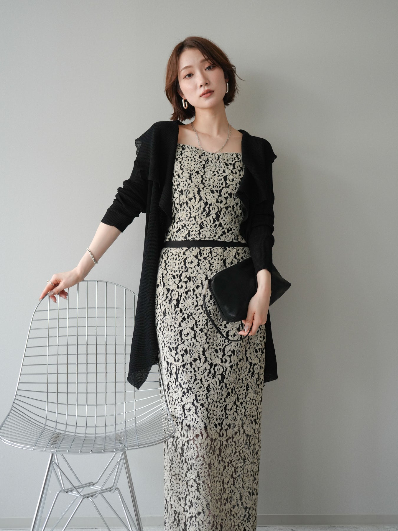 繊細なフルレースが上品な華やかさを演出するキャミトップスとIラインスカートのセットアップ。コンパクトなシルエットのキャミトップスが女性らしいラインを引き立て、華奢なストラップが抜け感をプラスします。スカートはすっきりとしたIラインシルエットで縦のラインを強調し、スタイルアップ効果も期待できる一着。全体に施されたレースが軽やかな印象を与え、エレガントな雰囲気を纏います。セットでの着用はもちろん、それぞれ単体でも着回しができ、デイリーから特別なシーンまで幅広く活躍するアイテムです。