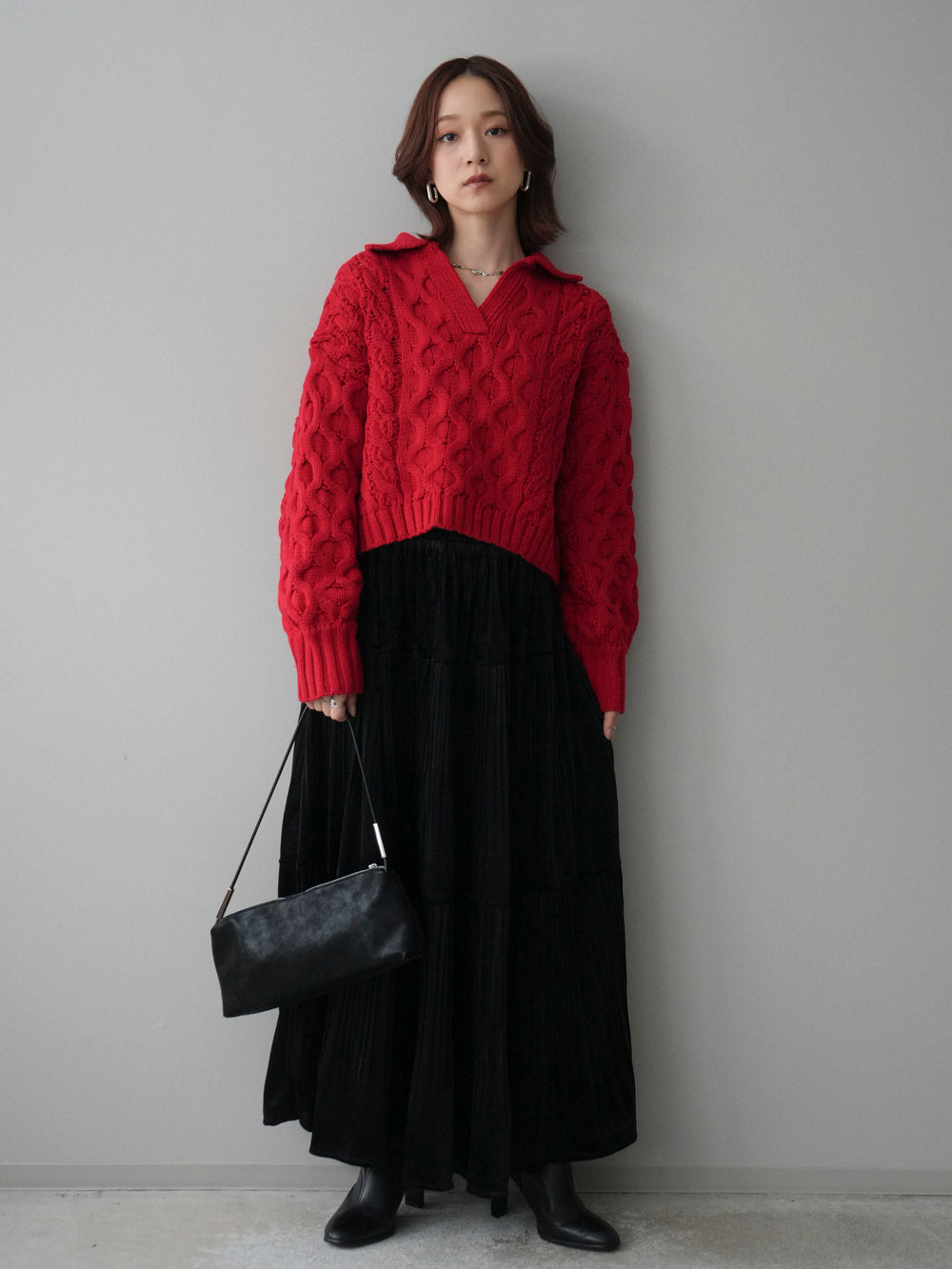 [SET]バルキーケーブルクロップド開襟プルオーバー+ベロアティアードワッシャースカート(2set)