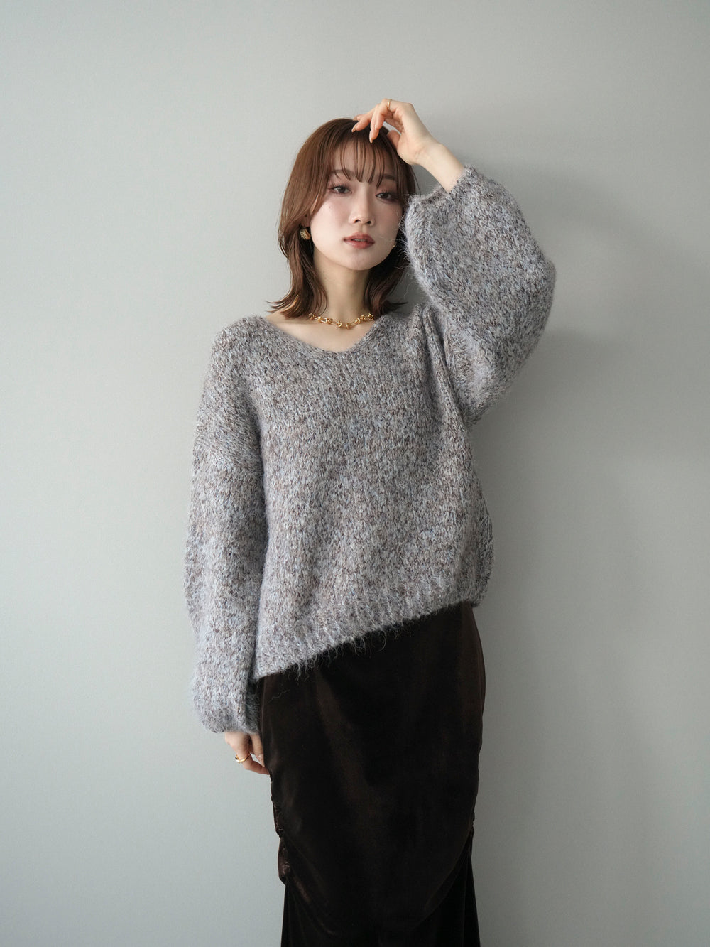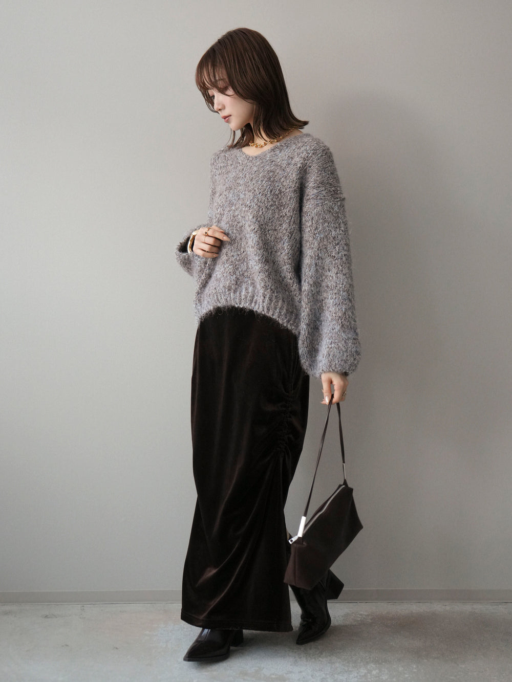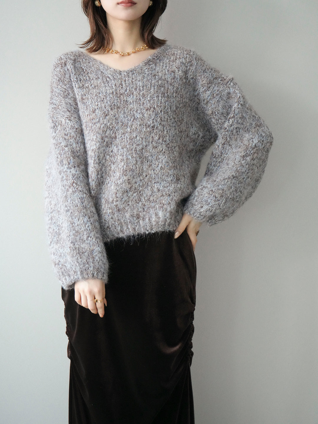 [SET]Vネックミックスヤーンニットプルオーバー+ギャザーベロアスカート(2set)