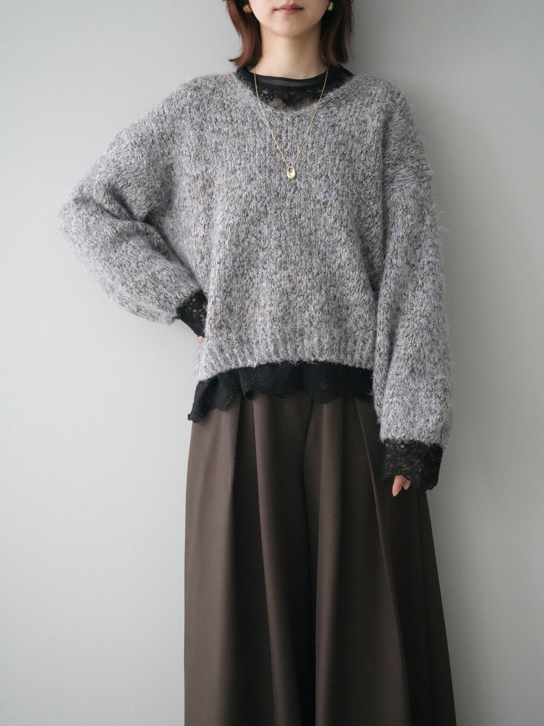 [SET]Vネックミックスヤーンニットプルオーバー+チュールレーストップス(2set)