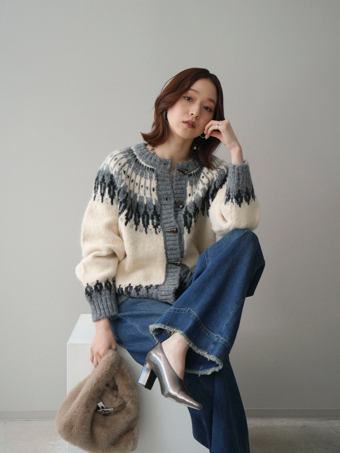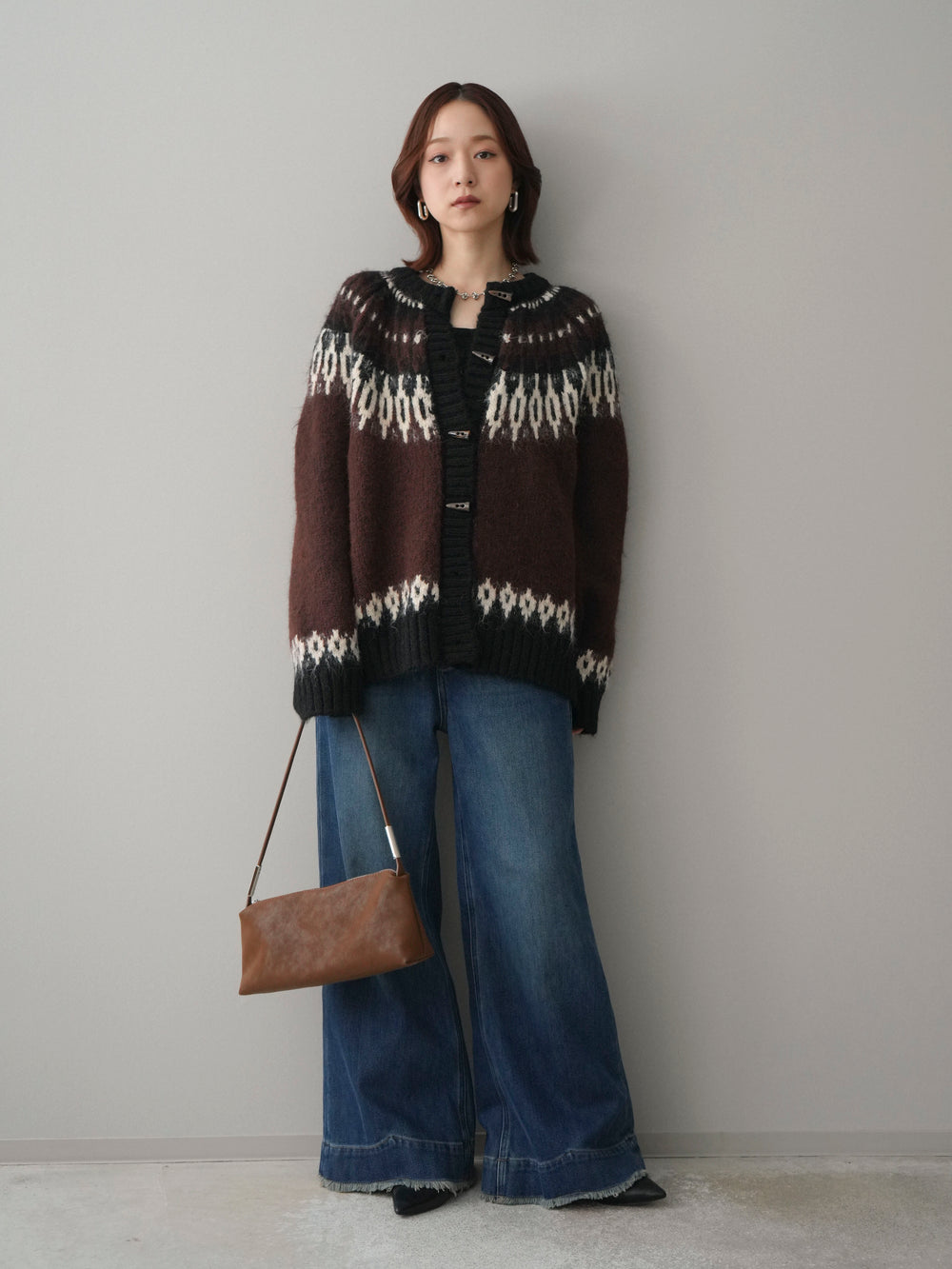 [SET]トグルボタン求心柄ニットカーディガン+裏起毛裾フリンジワイドデニムパンツ(2set)