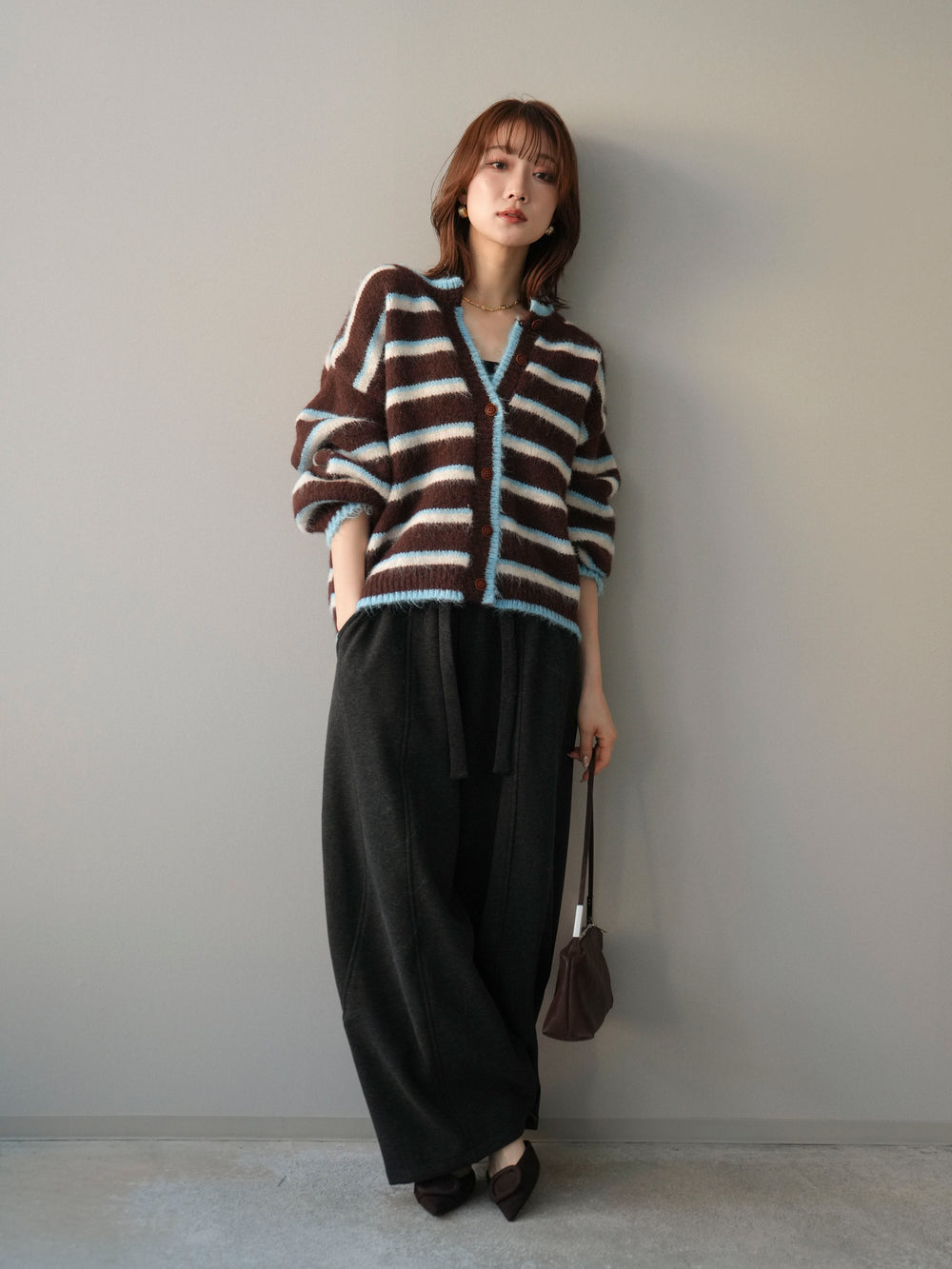 [SET]ウールタッチ配色ボーダーニットカーディガン+ウエストベルトカーブラインスエットパンツ(2set)