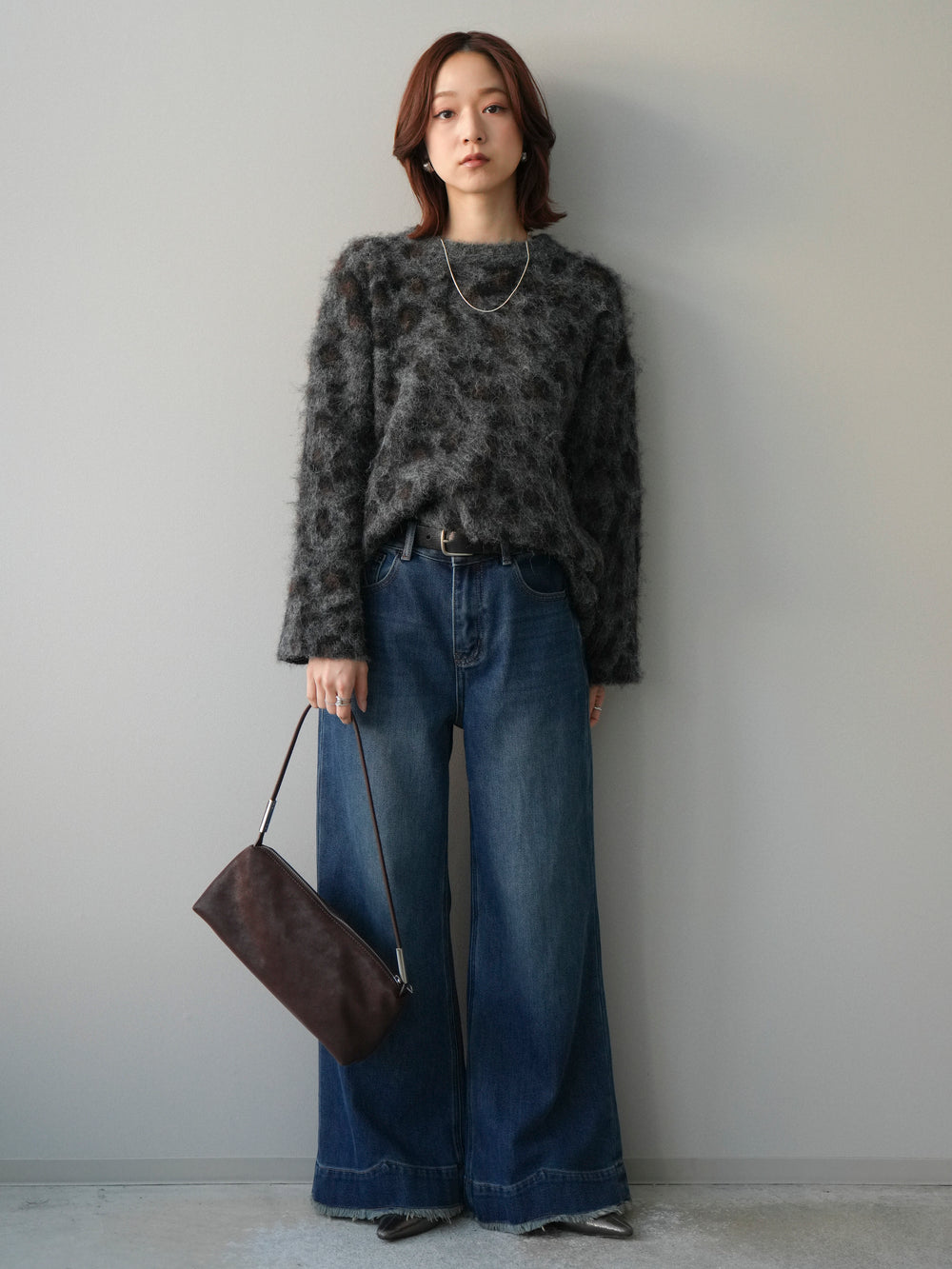 [SET]レオパードシャギーニットプルオーバー+裏起毛裾フリンジワイドデニムパンツ(2set)