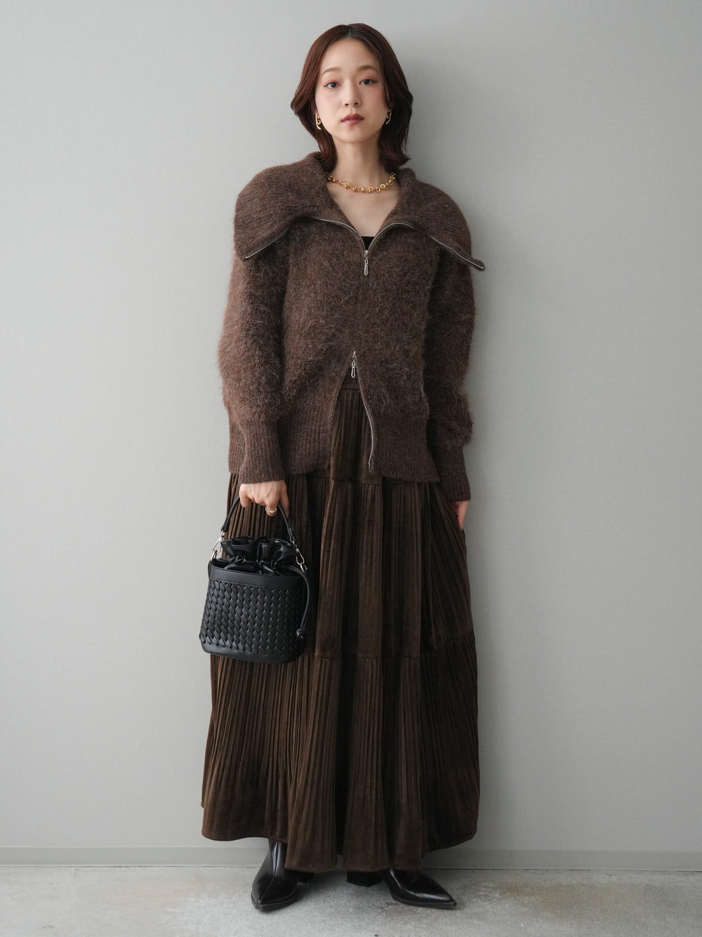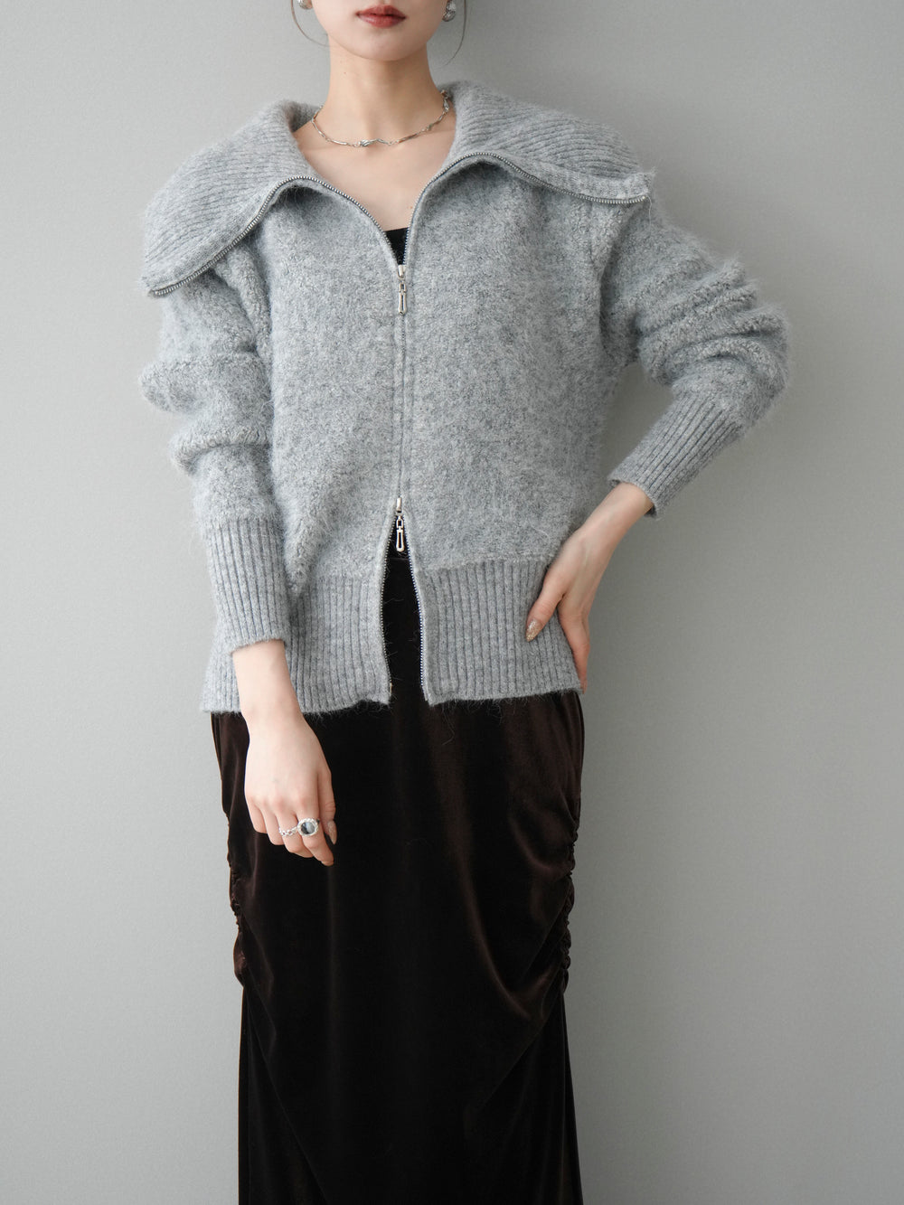 [SET]リブ襟ブークレZIPニットカーディガン+ギャザーベロアスカート(2set)