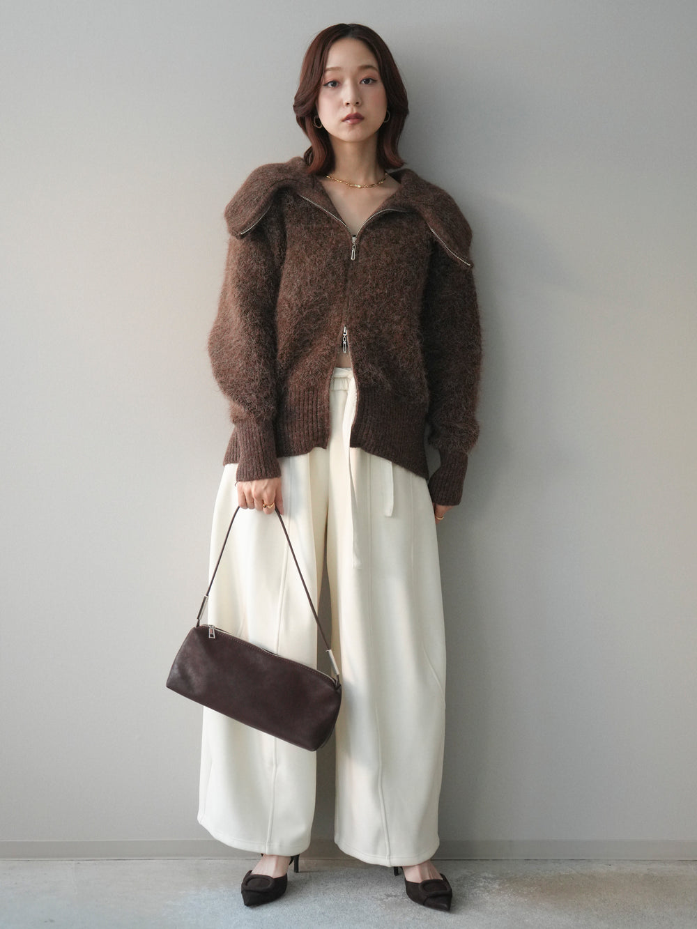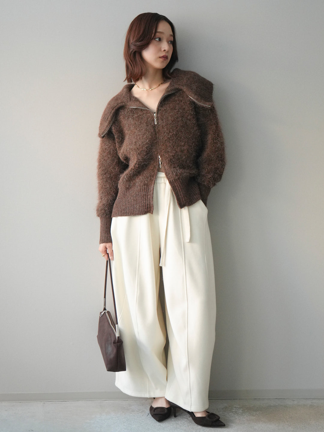 [SET]リブ襟ブークレZIPニットカーディガン+ウエストベルトカーブラインスエットパンツ(2set)