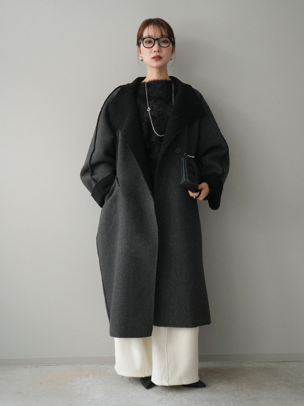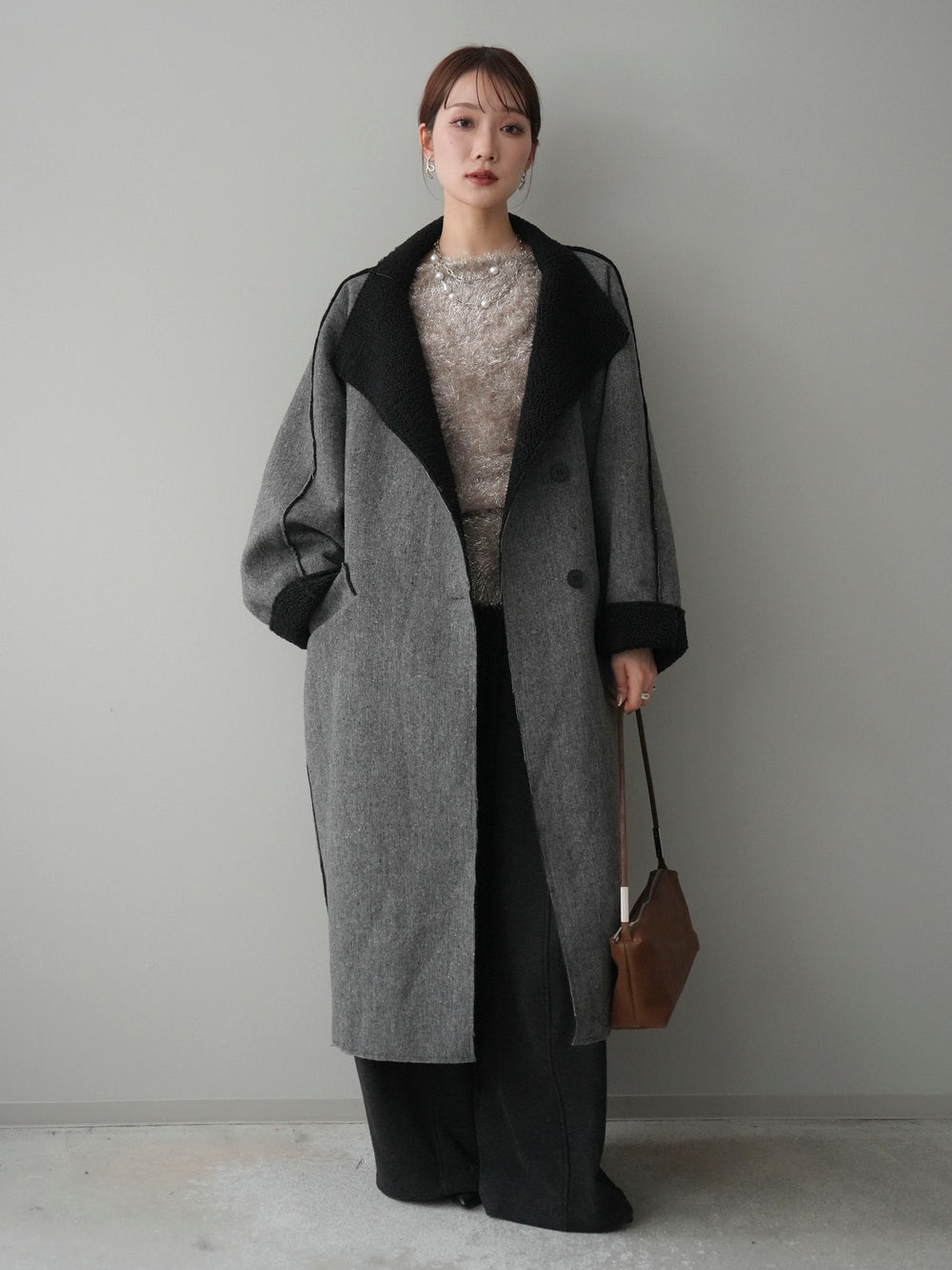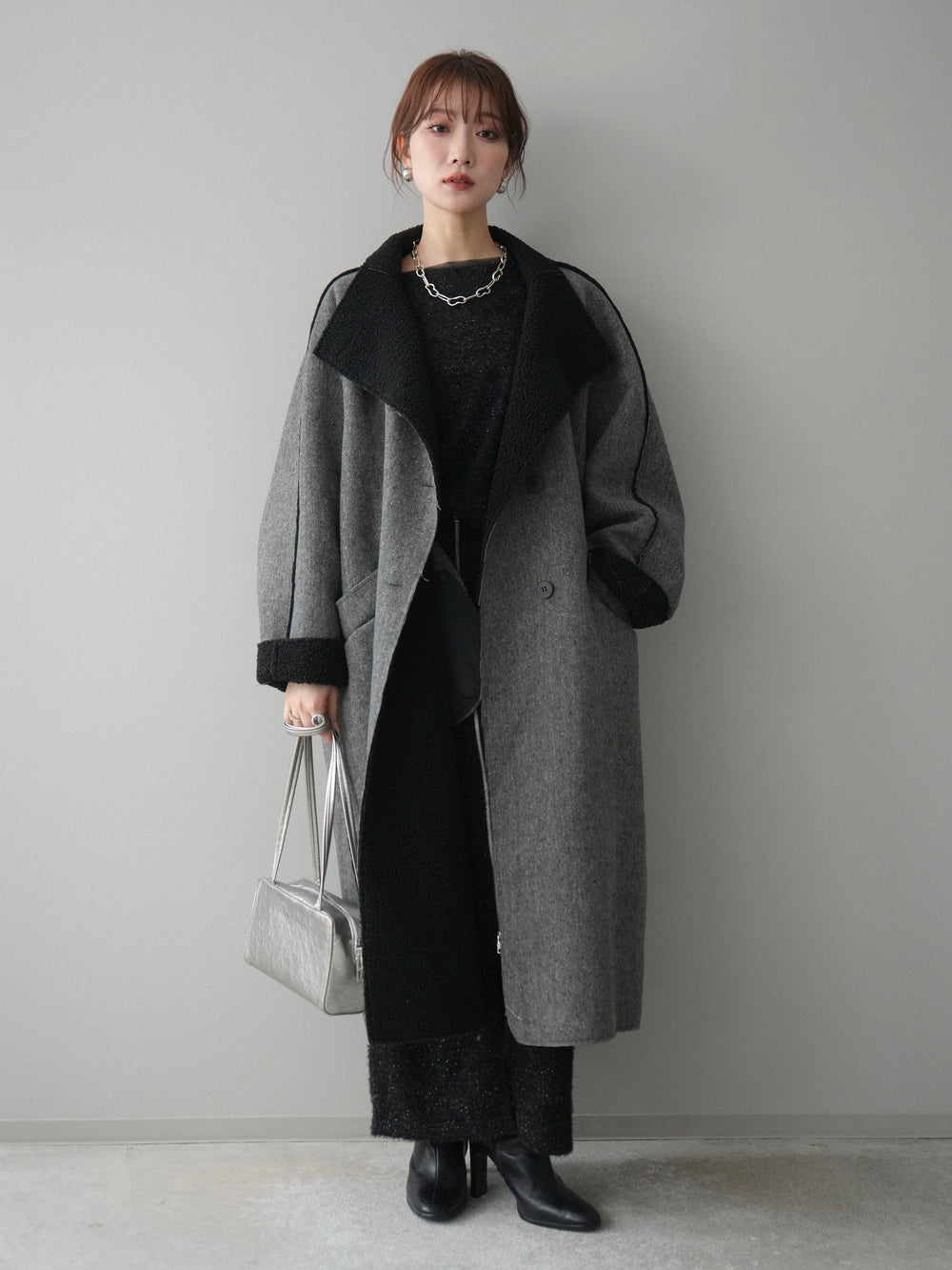 [SET]ハンドステッチ裏中綿ロングコート+ツイストネックラメネップヤーンニットプルオーバー(2set)