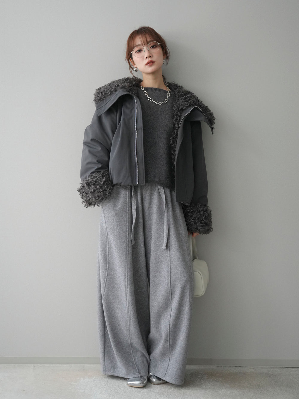 [SET]アウトシーム裏ボアコート+ラメシャギードルマンニットプルオーバー+ウエストベルトカーブラインスエットパンツ(3set)