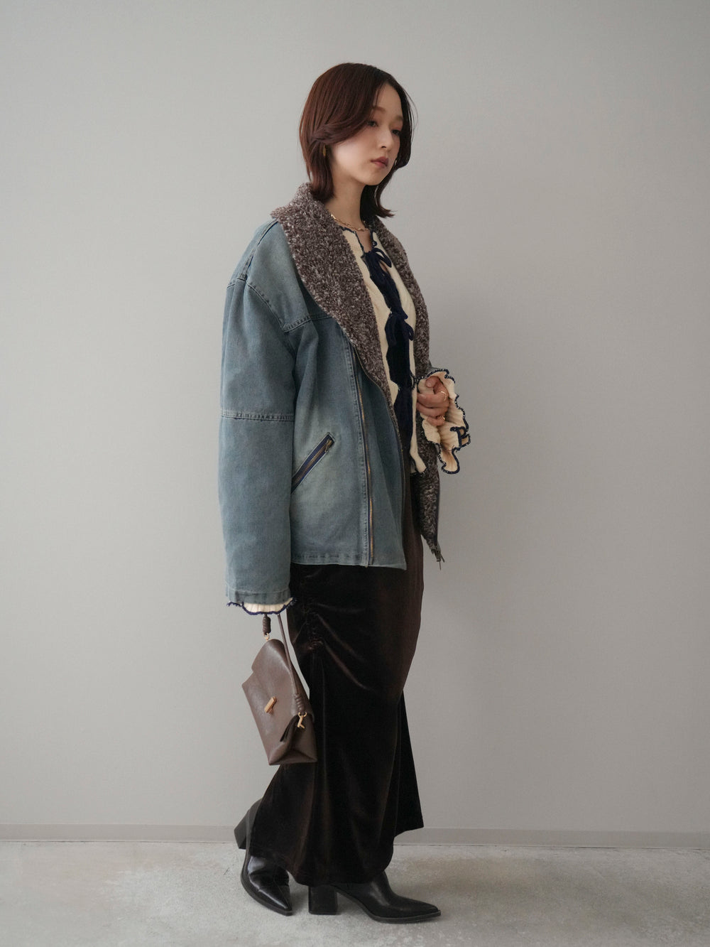 [SET]ミックスボアデニムジャケット+ギャザーベロアスカート(2set)