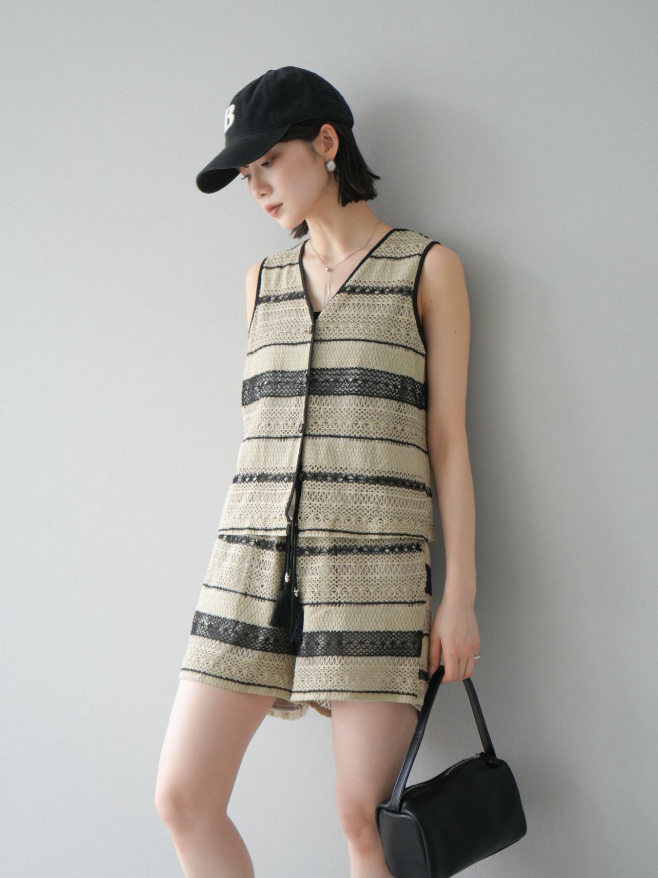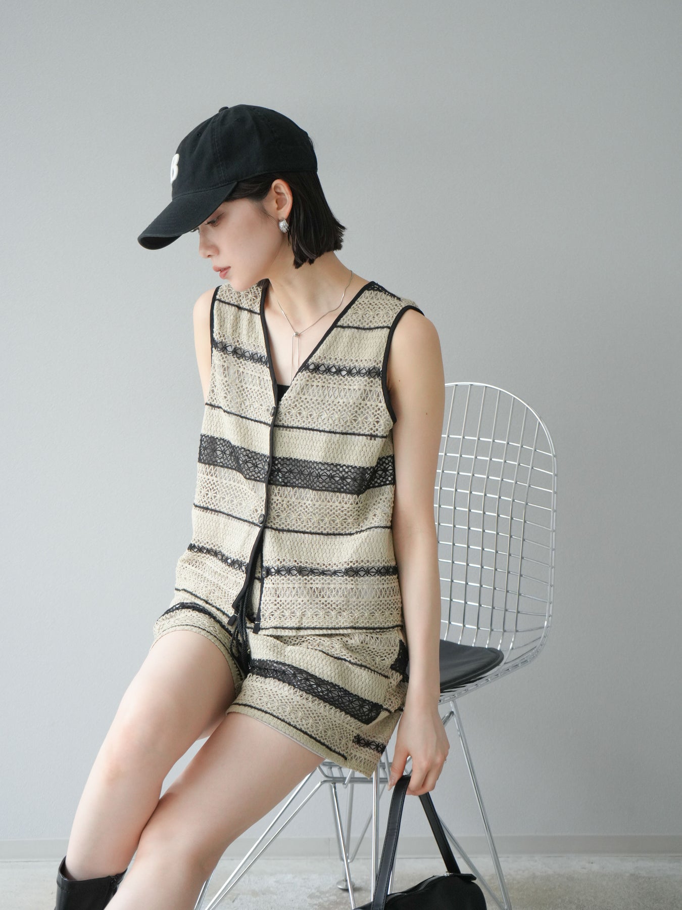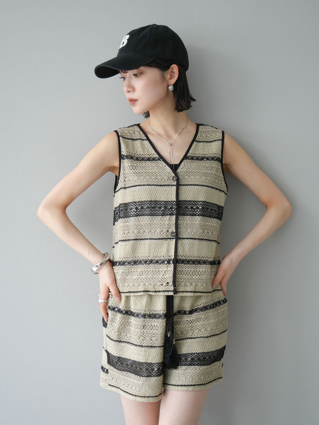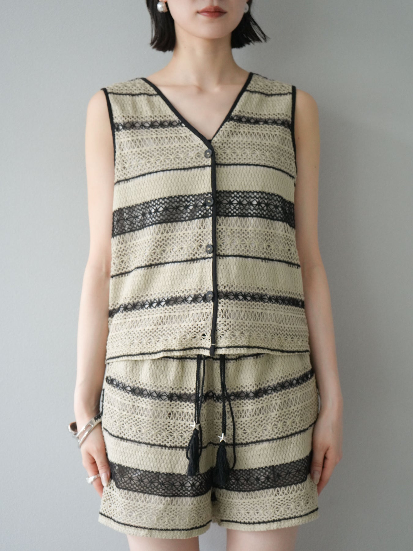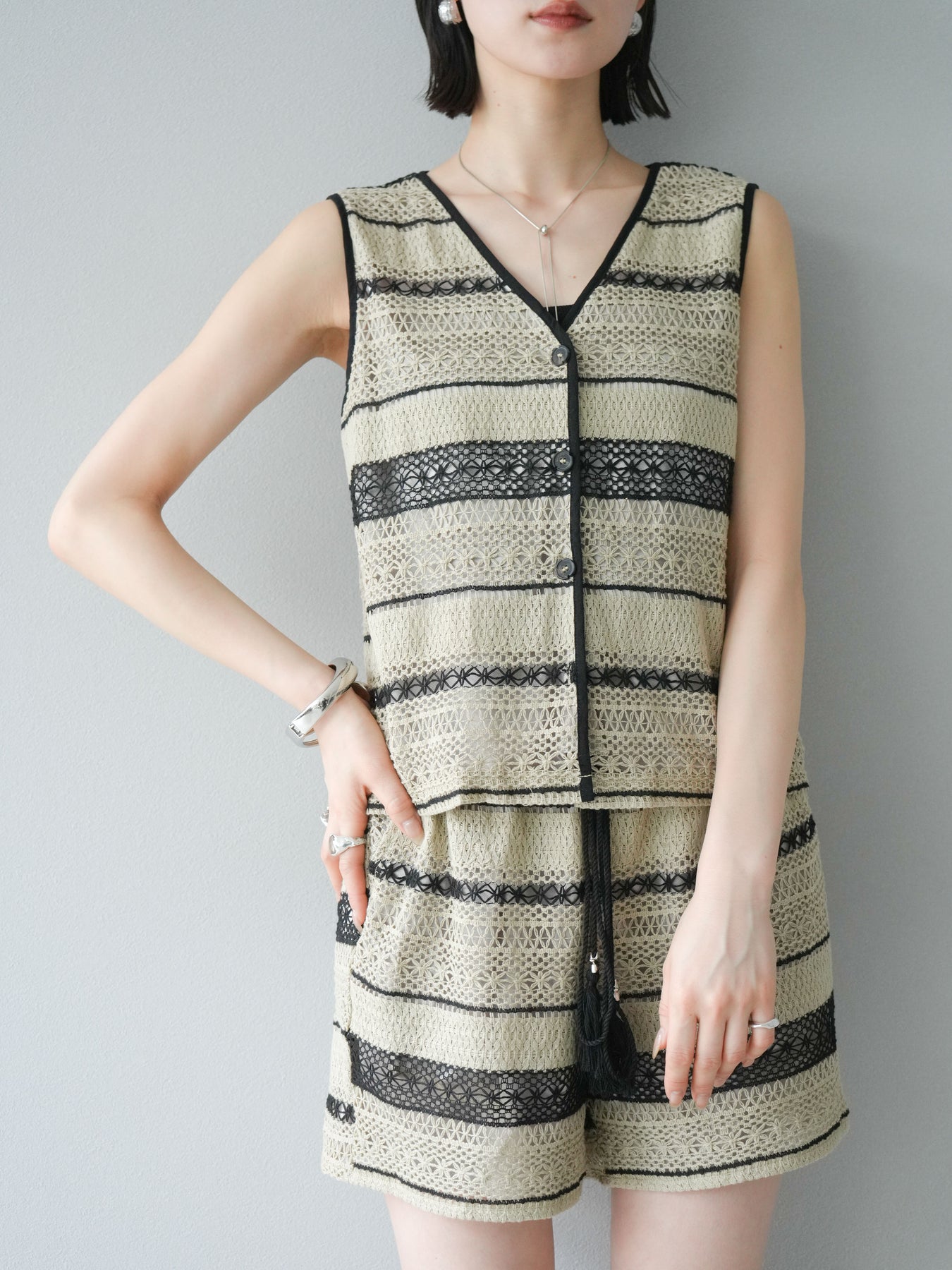 クロシェレースの繊細なデザインが特徴的なベストとショートパンツのセットアップ。軽やかで涼しげな素材感が、夏にぴったりのアイテムです。ストライプ状のレースがシンプルながらも個性的で、デザイン性が光ります。ウエスト部分はドローストリングで調整可能で、快適な履き心地を提供します。カジュアルでありながら、リゾート感を楽しめる一枚です。 ※ボトムス、キャミソール(インナー)以外の商品は一律でインナーは付属していません