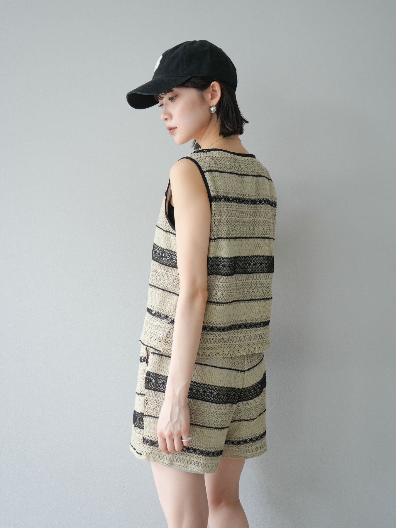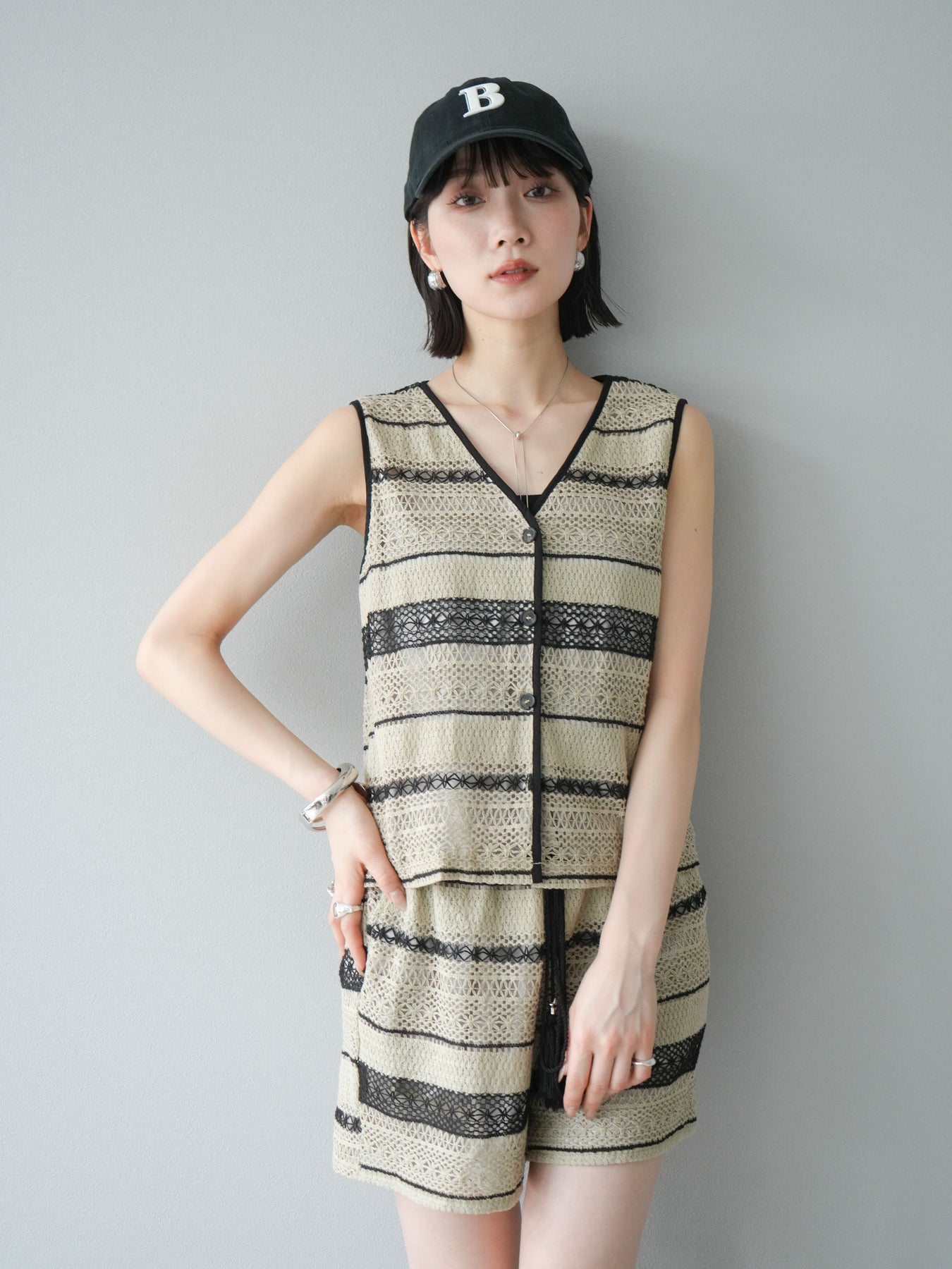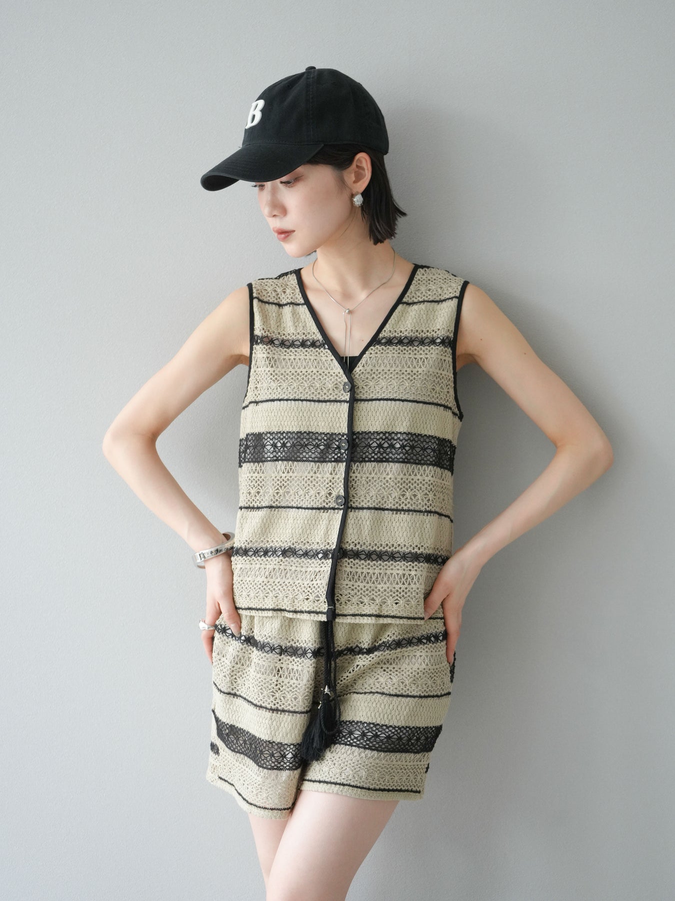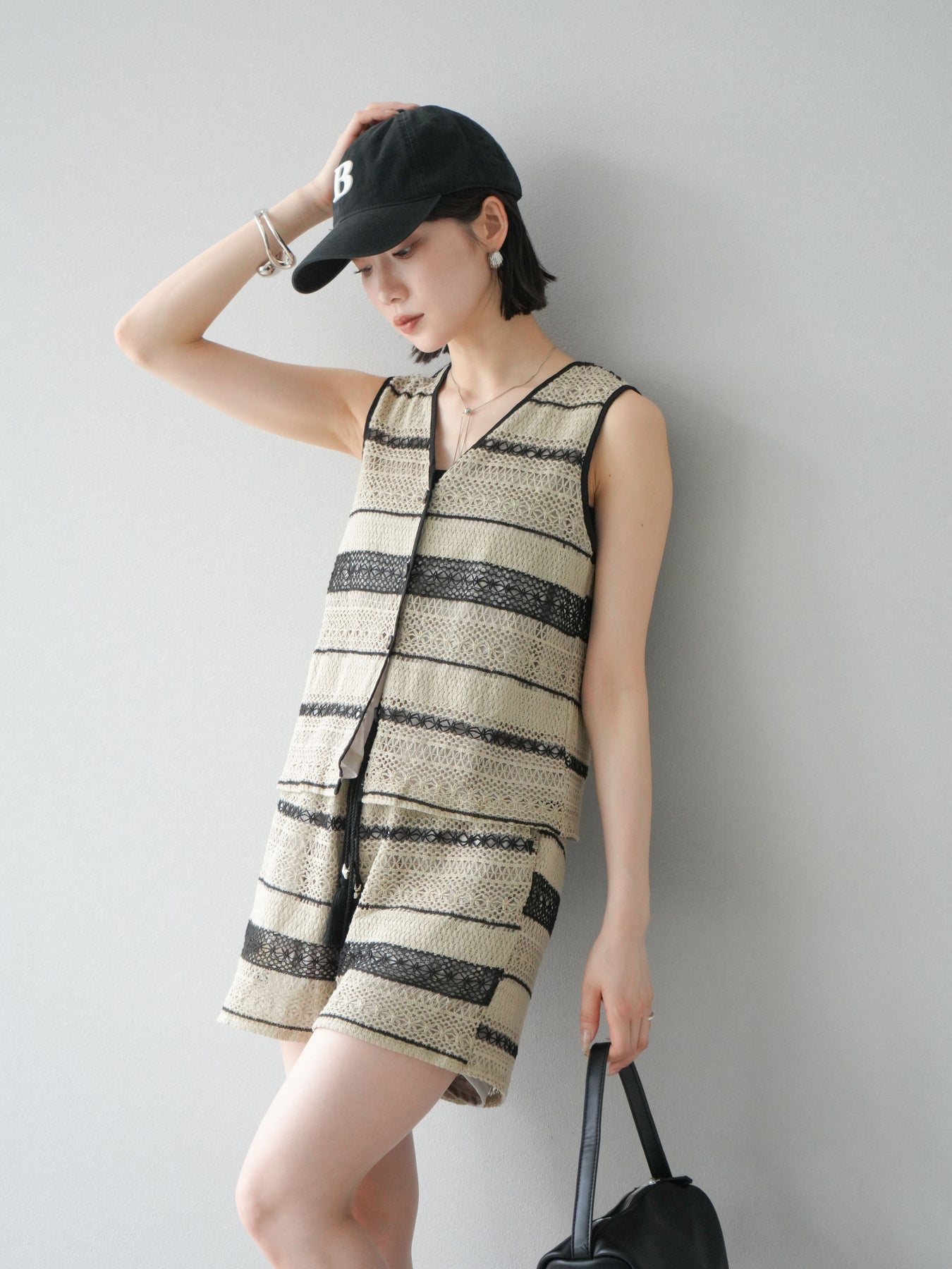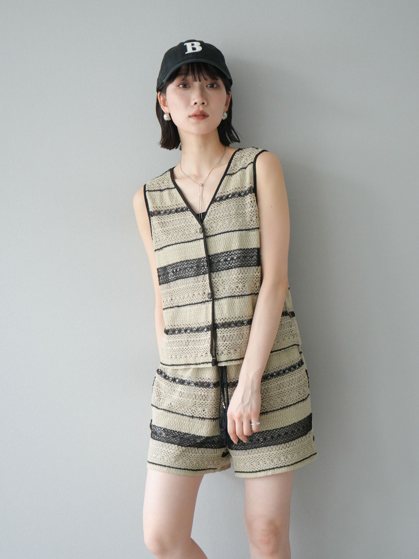 クロシェレースの繊細なデザインが特徴的なベストとショートパンツのセットアップ。軽やかで涼しげな素材感が、夏にぴったりのアイテムです。ストライプ状のレースがシンプルながらも個性的で、デザイン性が光ります。ウエスト部分はドローストリングで調整可能で、快適な履き心地を提供します。カジュアルでありながら、リゾート感を楽しめる一枚です。 ※ボトムス、キャミソール(インナー)以外の商品は一律でインナーは付属していません
