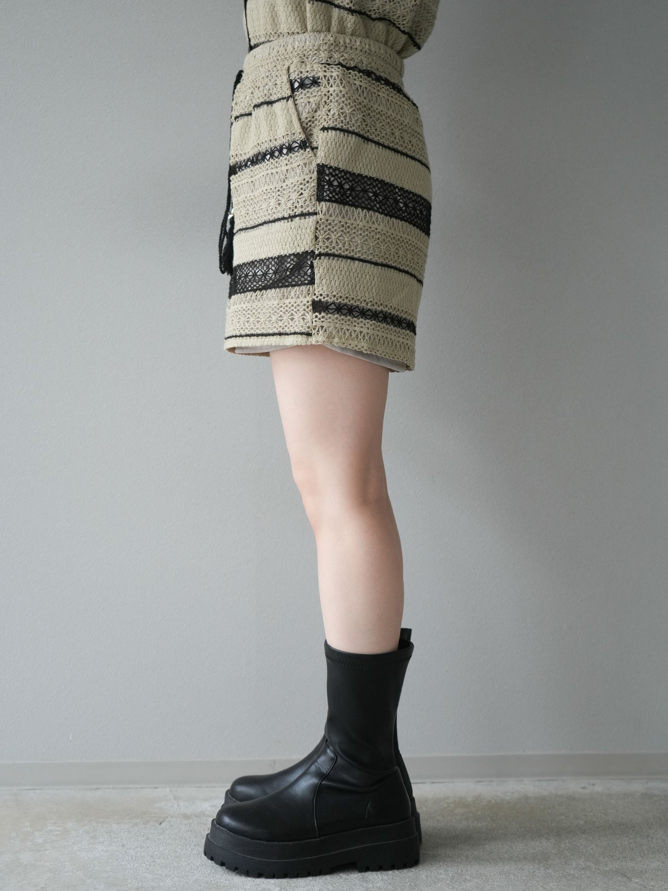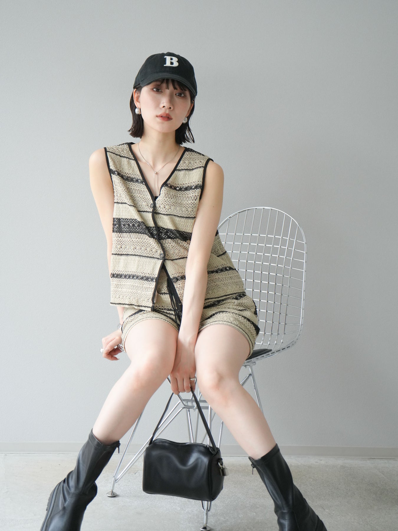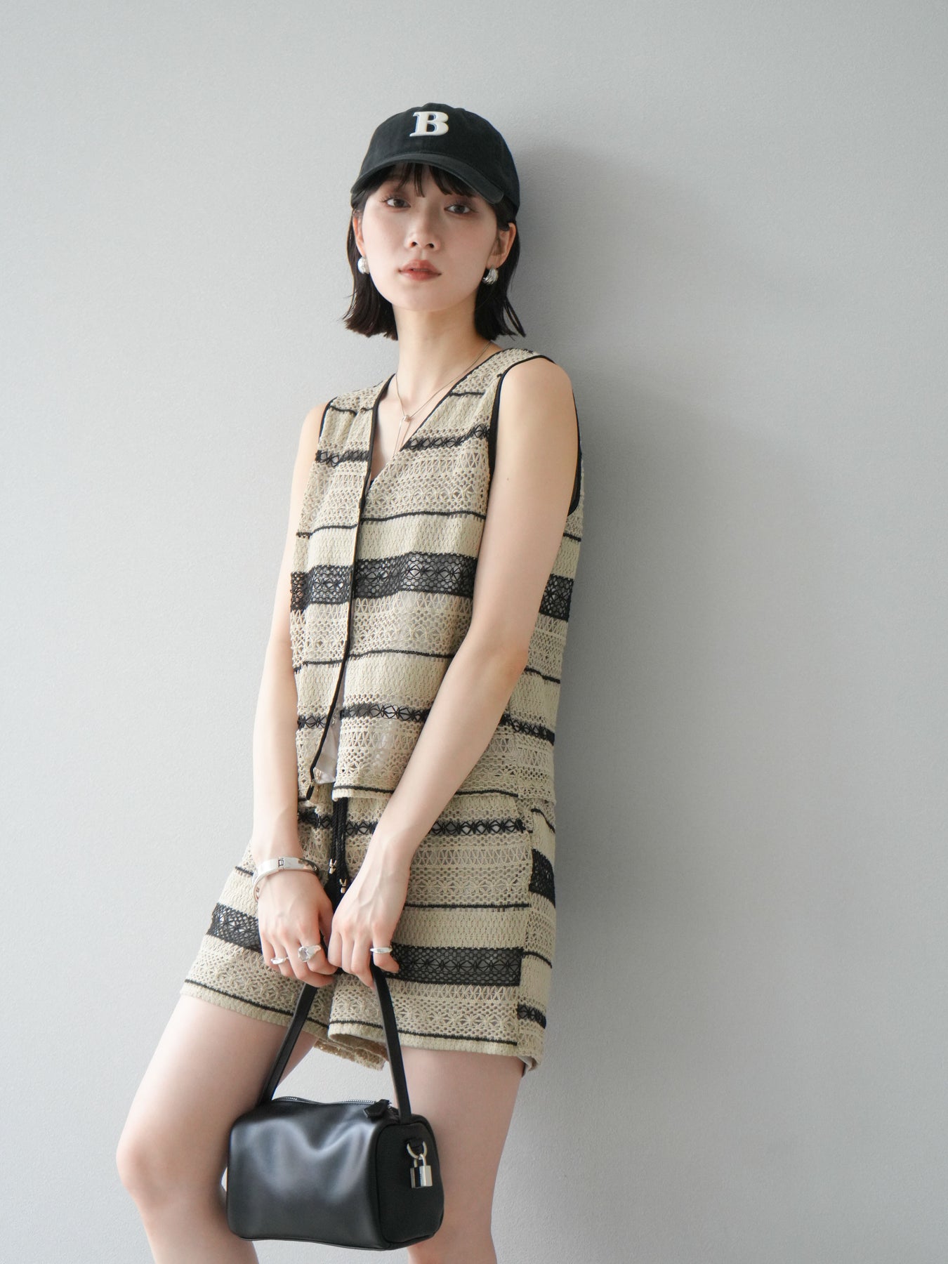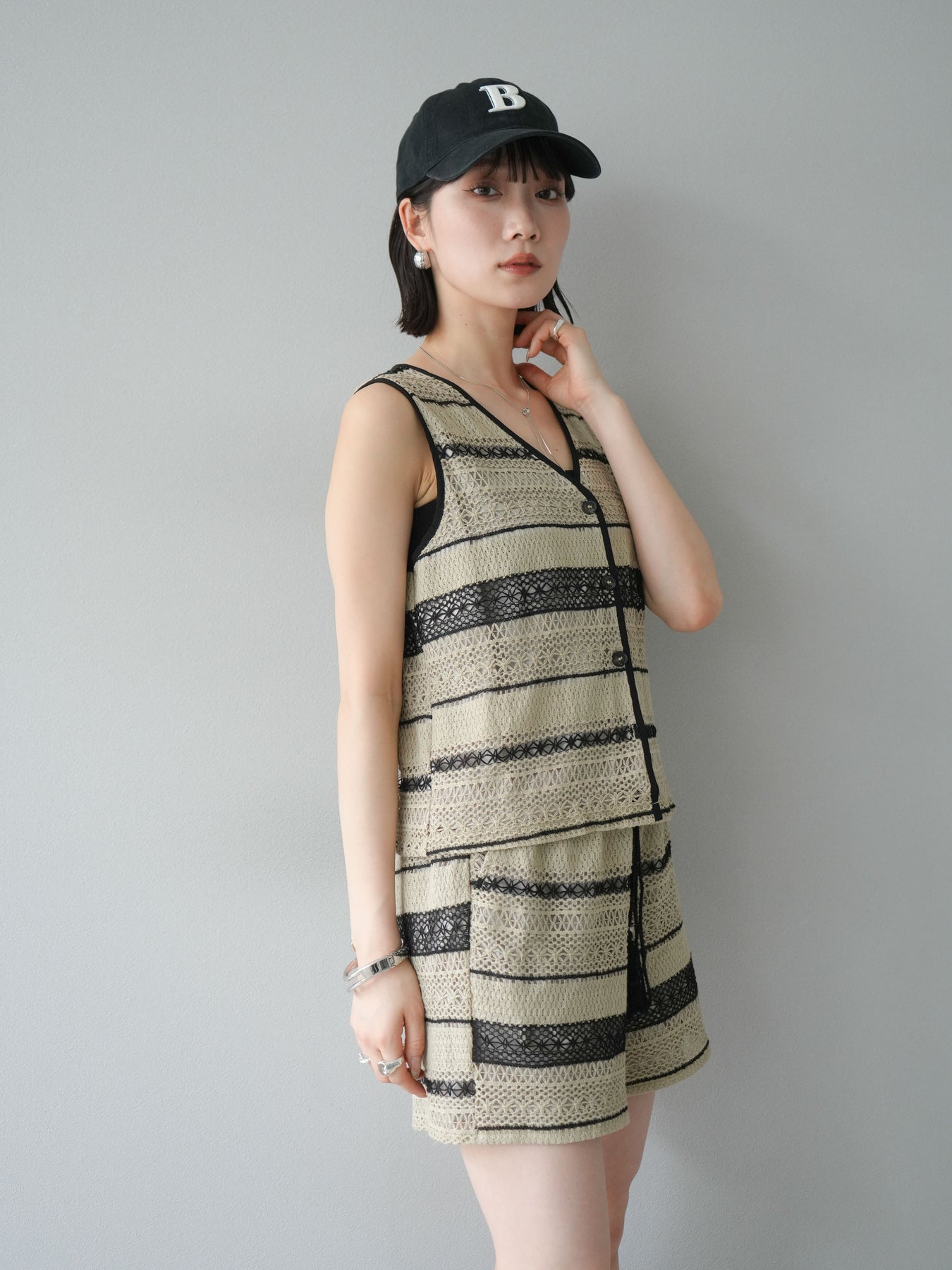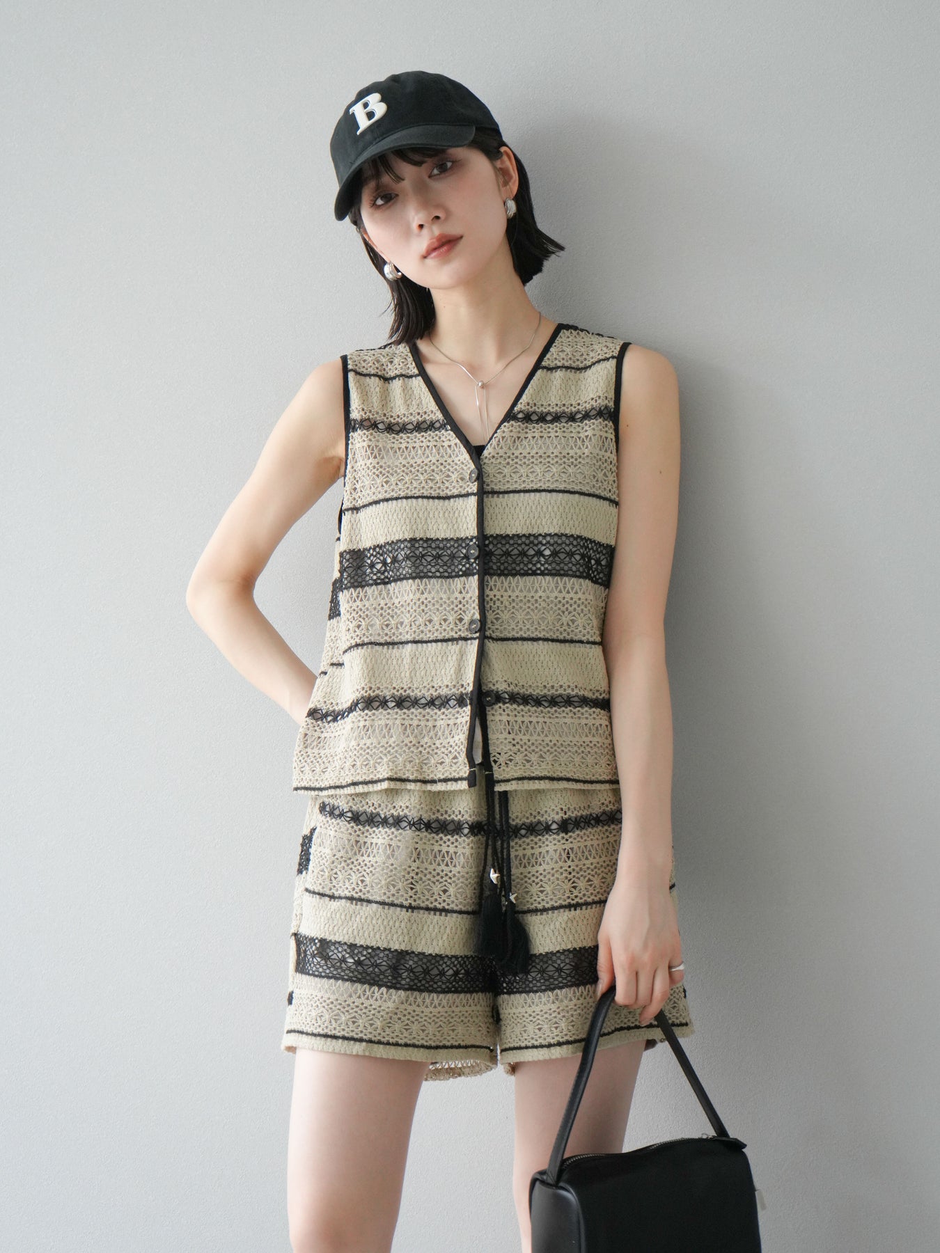 クロシェレースの繊細なデザインが特徴的なベストとショートパンツのセットアップ。軽やかで涼しげな素材感が、夏にぴったりのアイテムです。ストライプ状のレースがシンプルながらも個性的で、デザイン性が光ります。ウエスト部分はドローストリングで調整可能で、快適な履き心地を提供します。カジュアルでありながら、リゾート感を楽しめる一枚です。 ※ボトムス、キャミソール(インナー)以外の商品は一律でインナーは付属していません