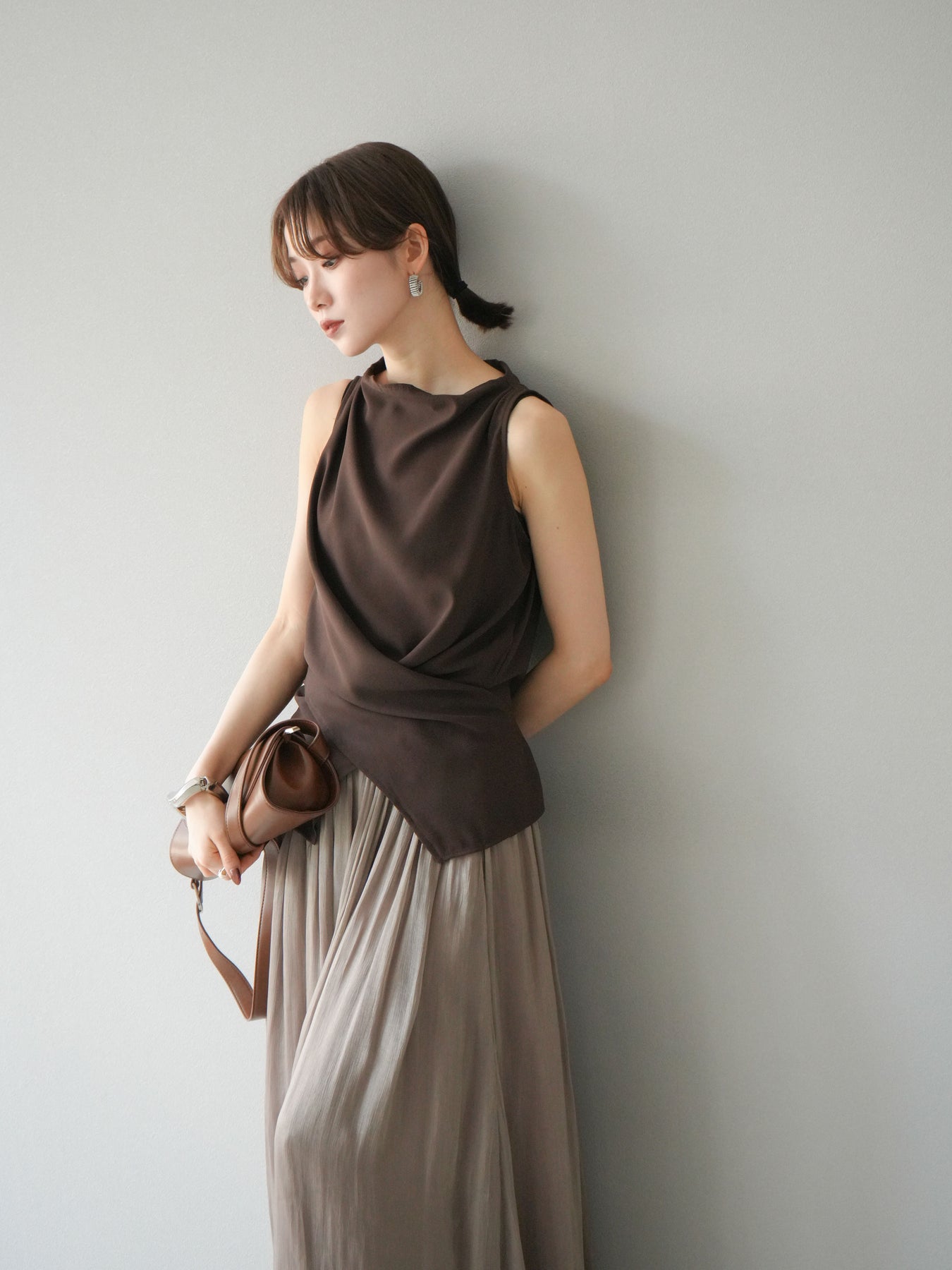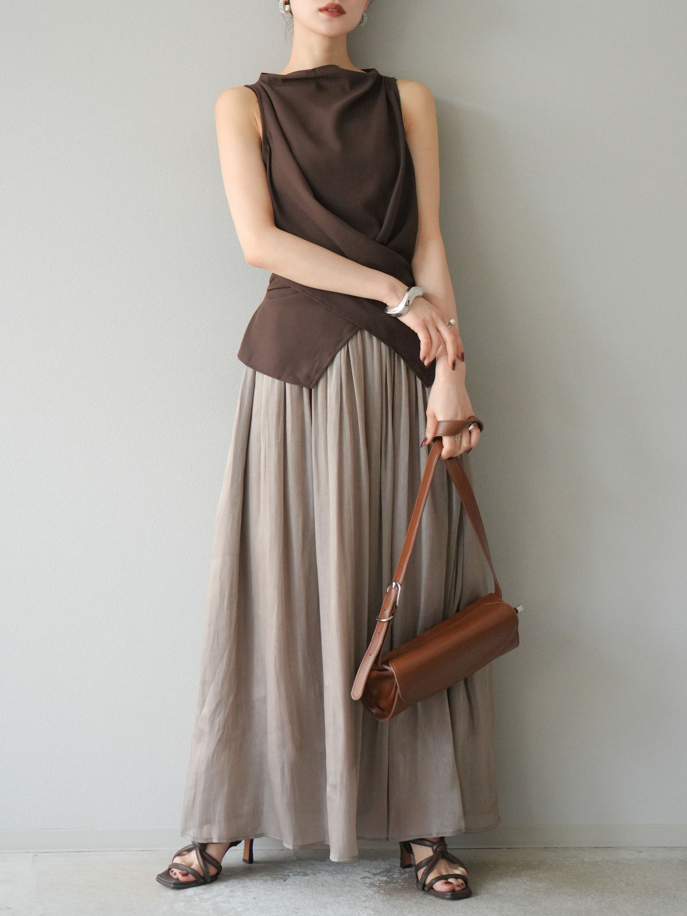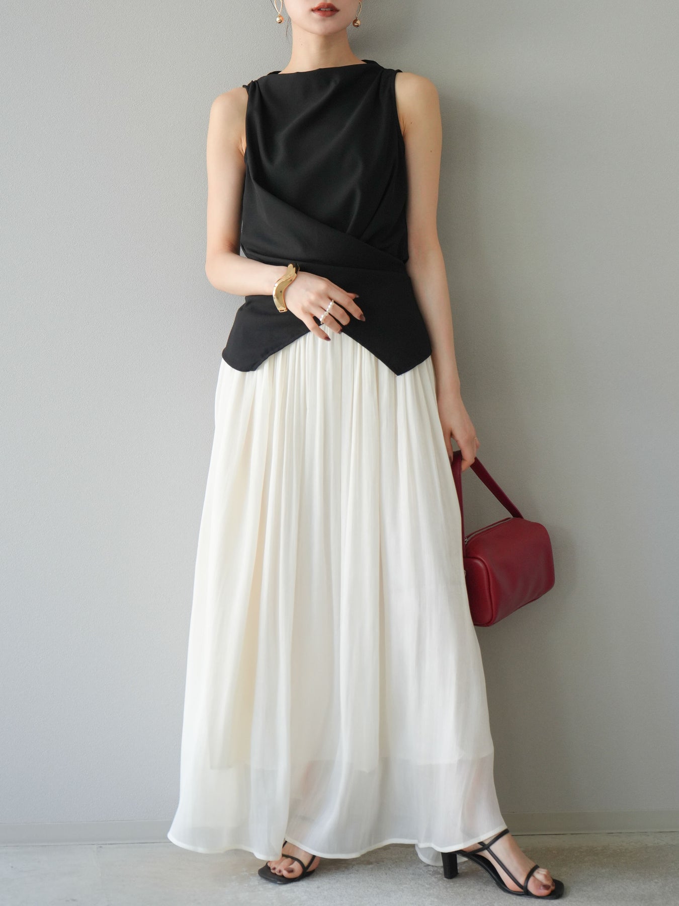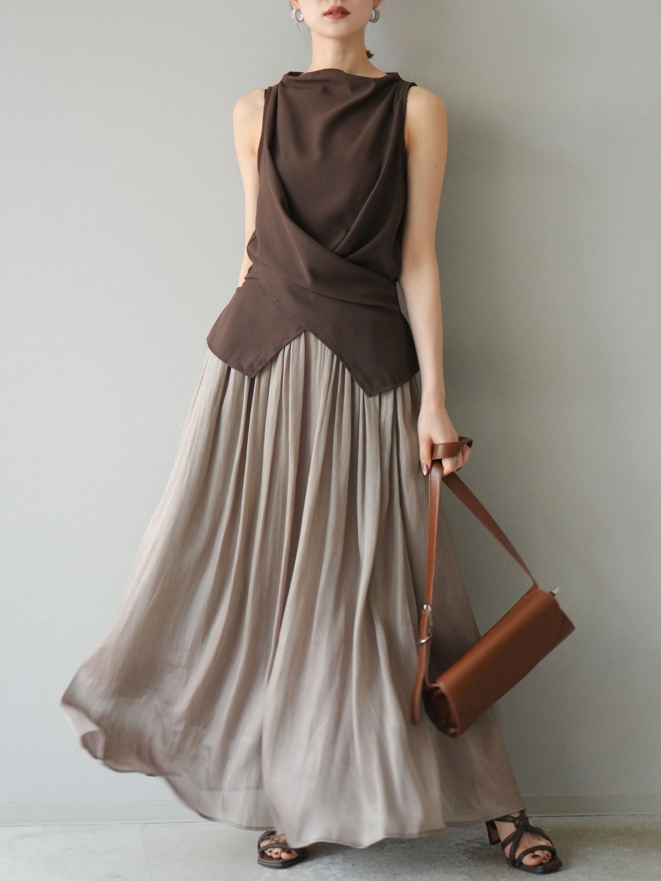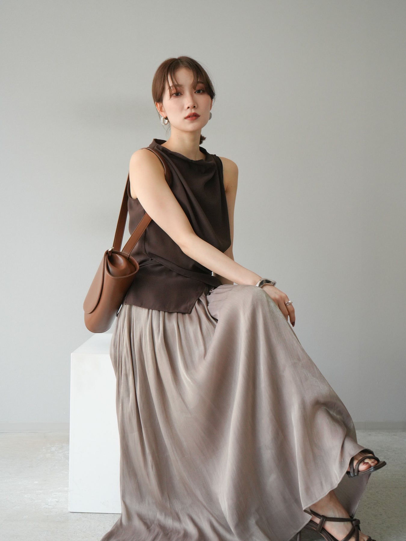 柔らかく上品な光沢感が魅力のシャイニーフレアスカートと、ウエストラインを美しく見せるカッティングのノースリーブトップスをセットにしたコーデセット。 トップスは程よく体にフィットしながらもタックデザインが立体感をプラスし、単品使いでも着映える1枚に。 スカートはふわりと揺れるエアリーな素材感で、シンプルながらもドラマティックな印象を演出してくれます。 セットアップとしてはもちろん、それぞれ単品で着回してもスタイリングの幅が広がります。 ※ボトムス、キャミソール(インナー)以外の商品は一律でインナーは付属していません。