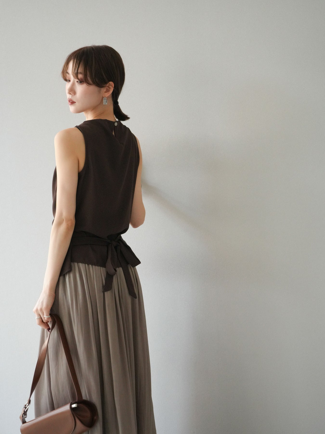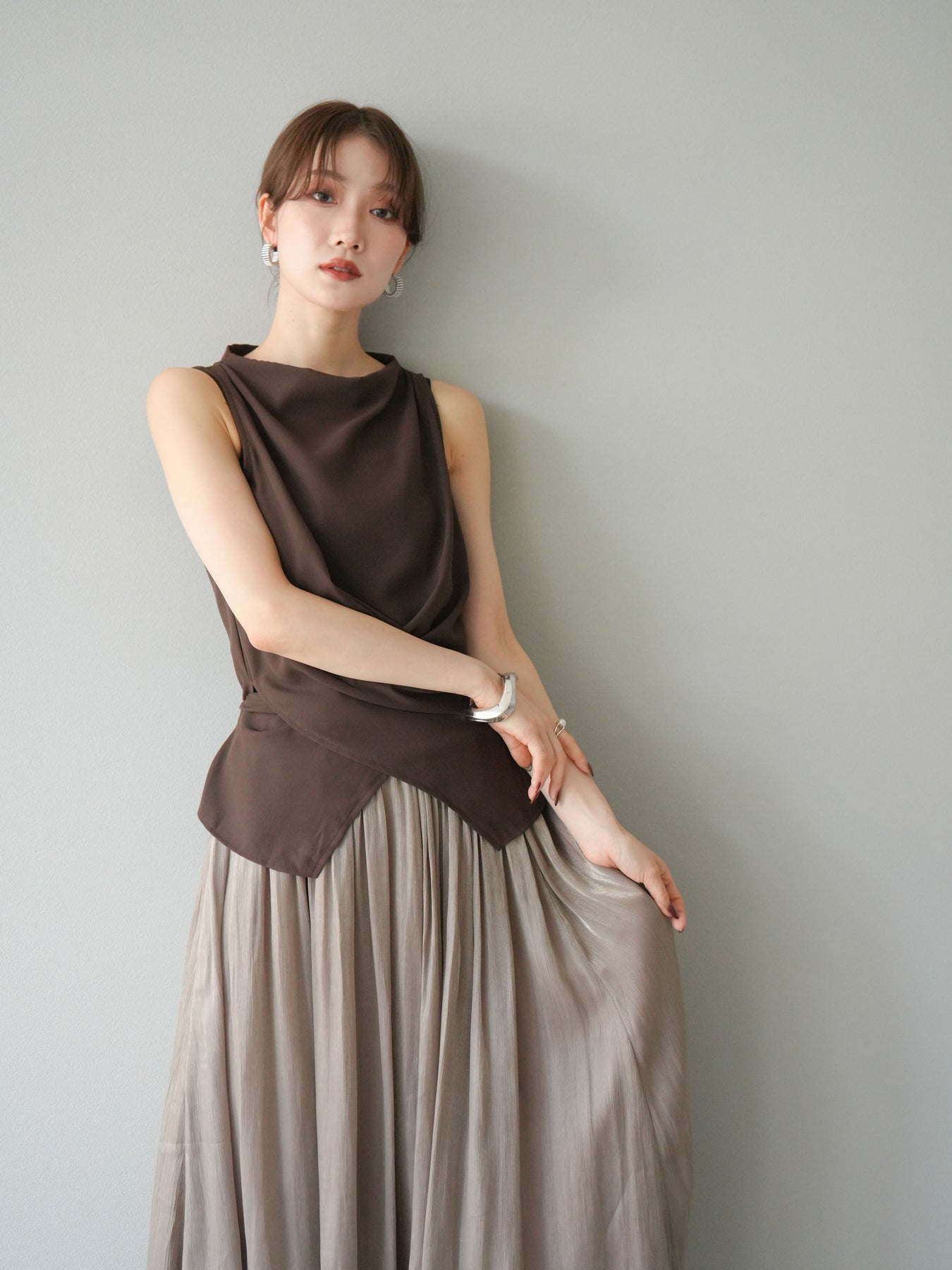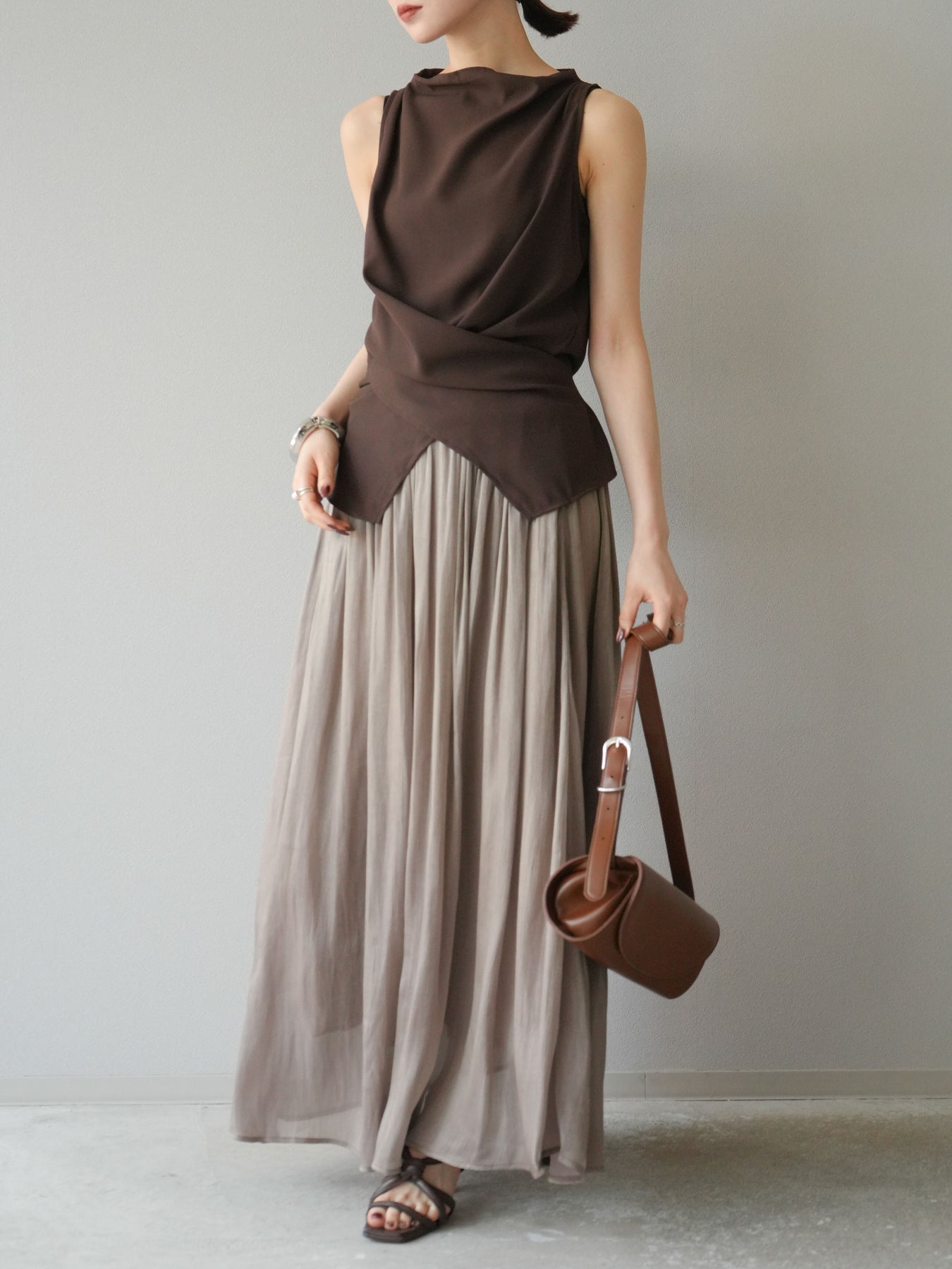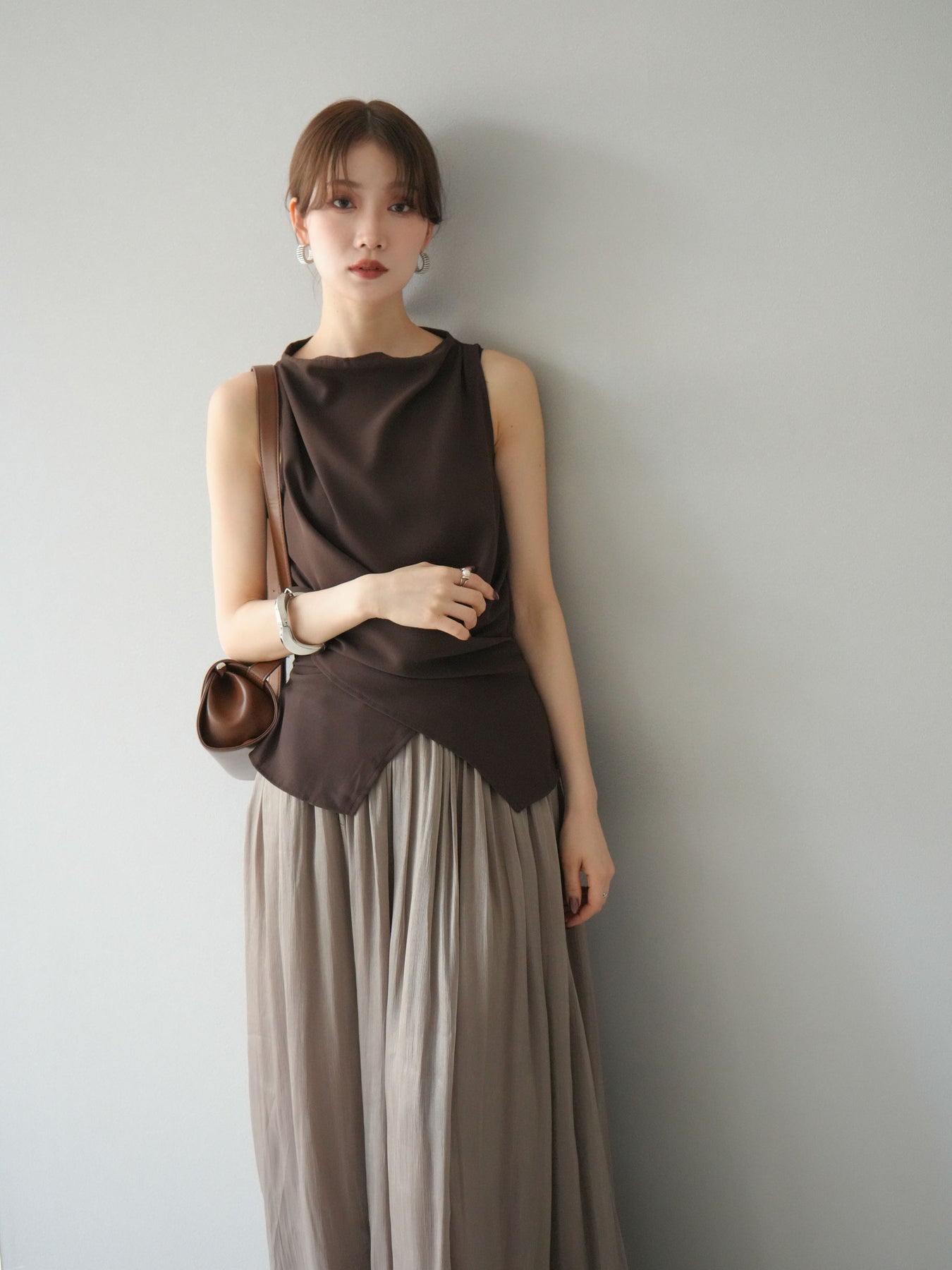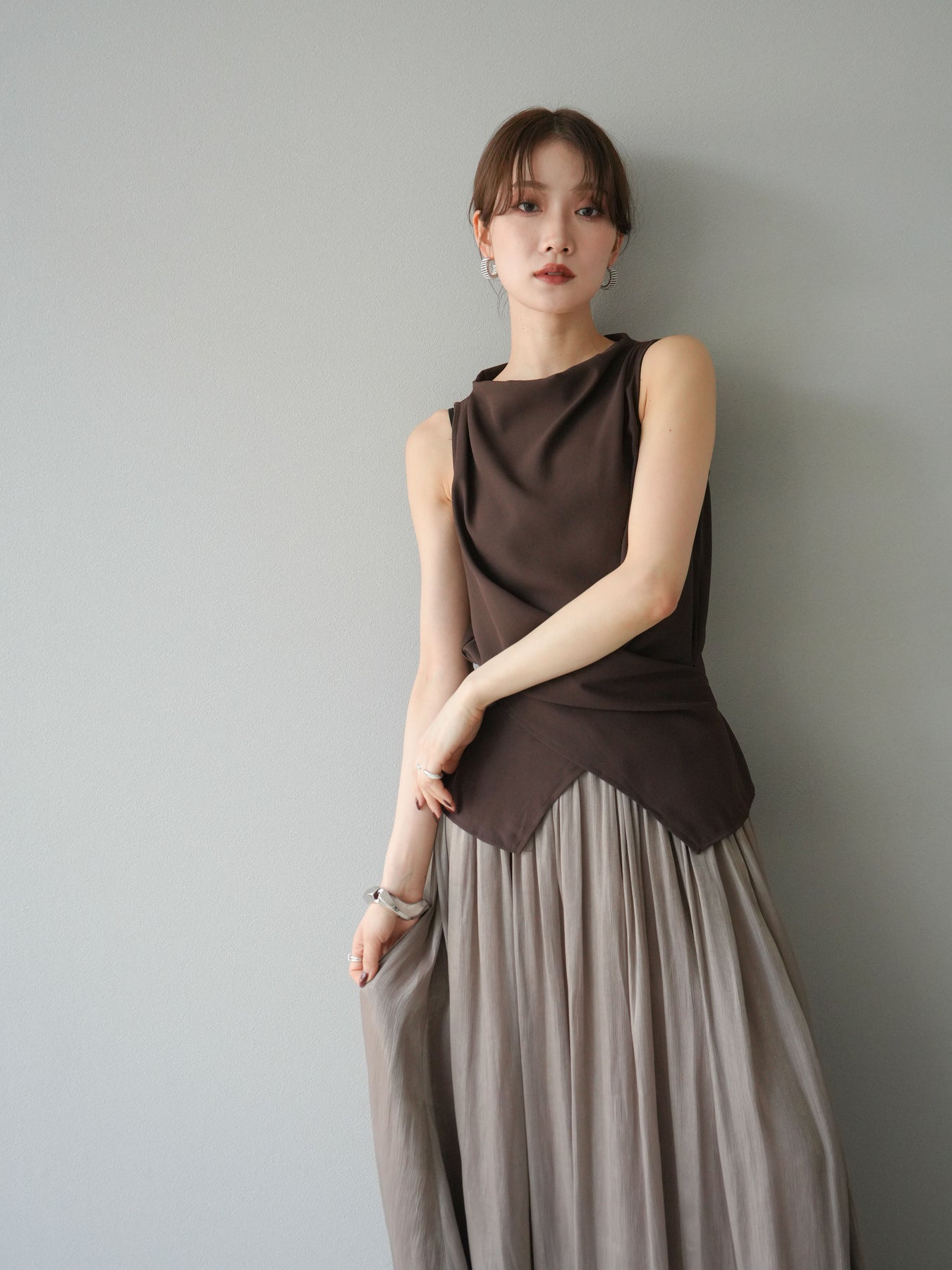 柔らかく上品な光沢感が魅力のシャイニーフレアスカートと、ウエストラインを美しく見せるカッティングのノースリーブトップスをセットにしたコーデセット。 トップスは程よく体にフィットしながらもタックデザインが立体感をプラスし、単品使いでも着映える1枚に。 スカートはふわりと揺れるエアリーな素材感で、シンプルながらもドラマティックな印象を演出してくれます。 セットアップとしてはもちろん、それぞれ単品で着回してもスタイリングの幅が広がります。 ※ボトムス、キャミソール(インナー)以外の商品は一律でインナーは付属していません。