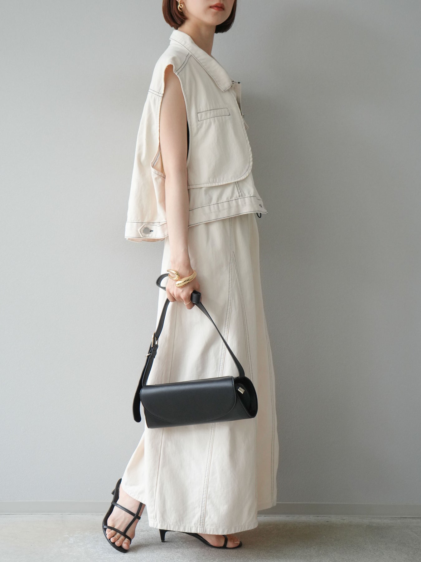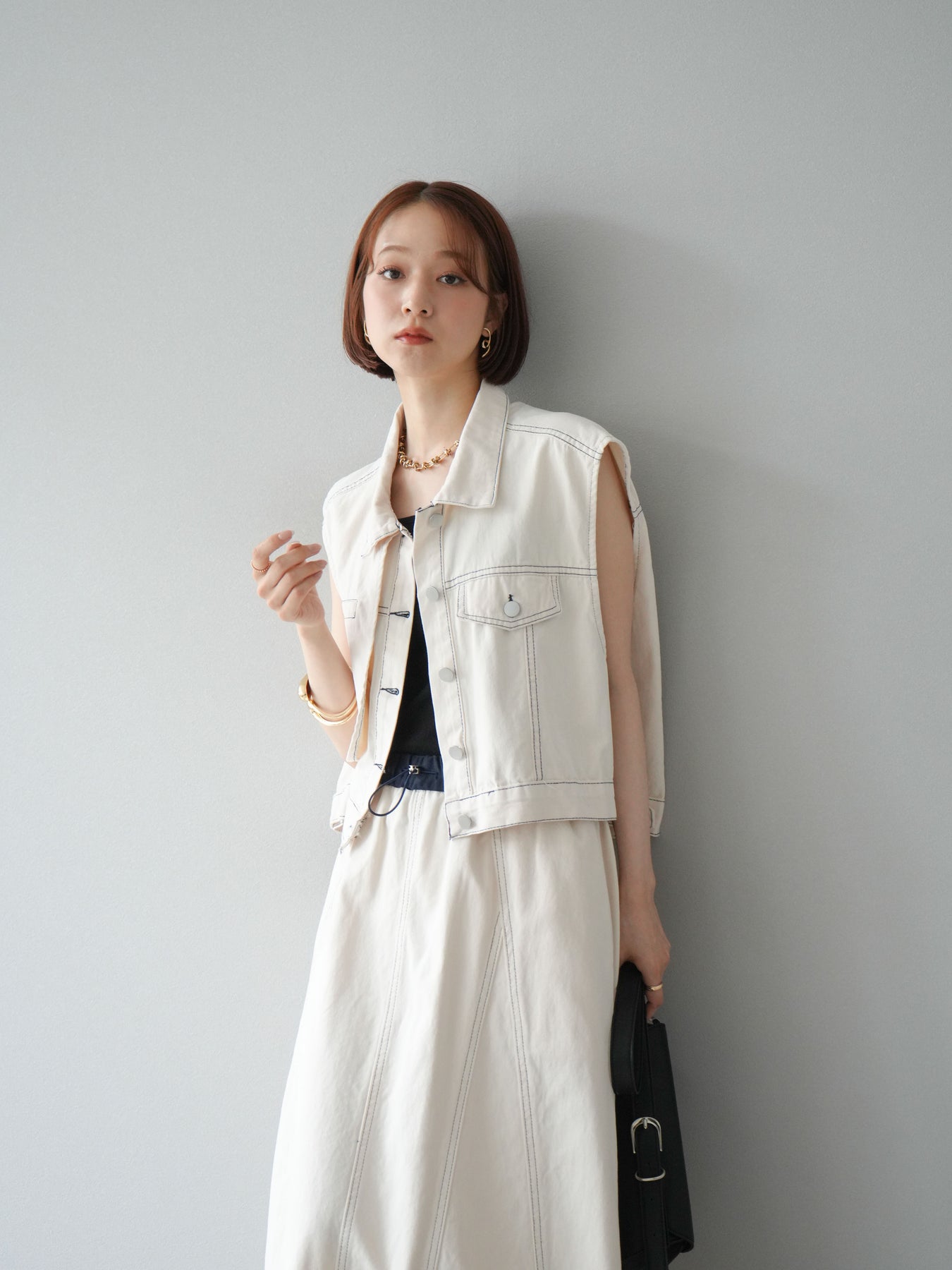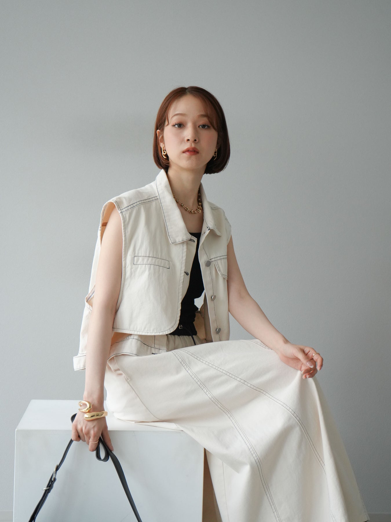 表情豊かなコットンツイル素材に配色ステッチが映える、ベストとスカートのセットアップ。ベストはコンパクトな丈感とミニマルなデザインに、丸みのあるフラップディテールがモードなアクセントを添えています。 スカートはハイウエストデザインでスタイルアップ効果があり、ウエストのドロスト仕様がカジュアルさと調整性を両立。縦に走るステッチラインが縦長効果を生み、すっきりとした印象に仕上がります。 セットでの着用はもちろん、それぞれ単品でも着回し力抜群の、デイリーに映える都会的なアイテムです。 ※ボトムス、キャミソール(インナー)以外の商品は一律でインナーは付属していません。