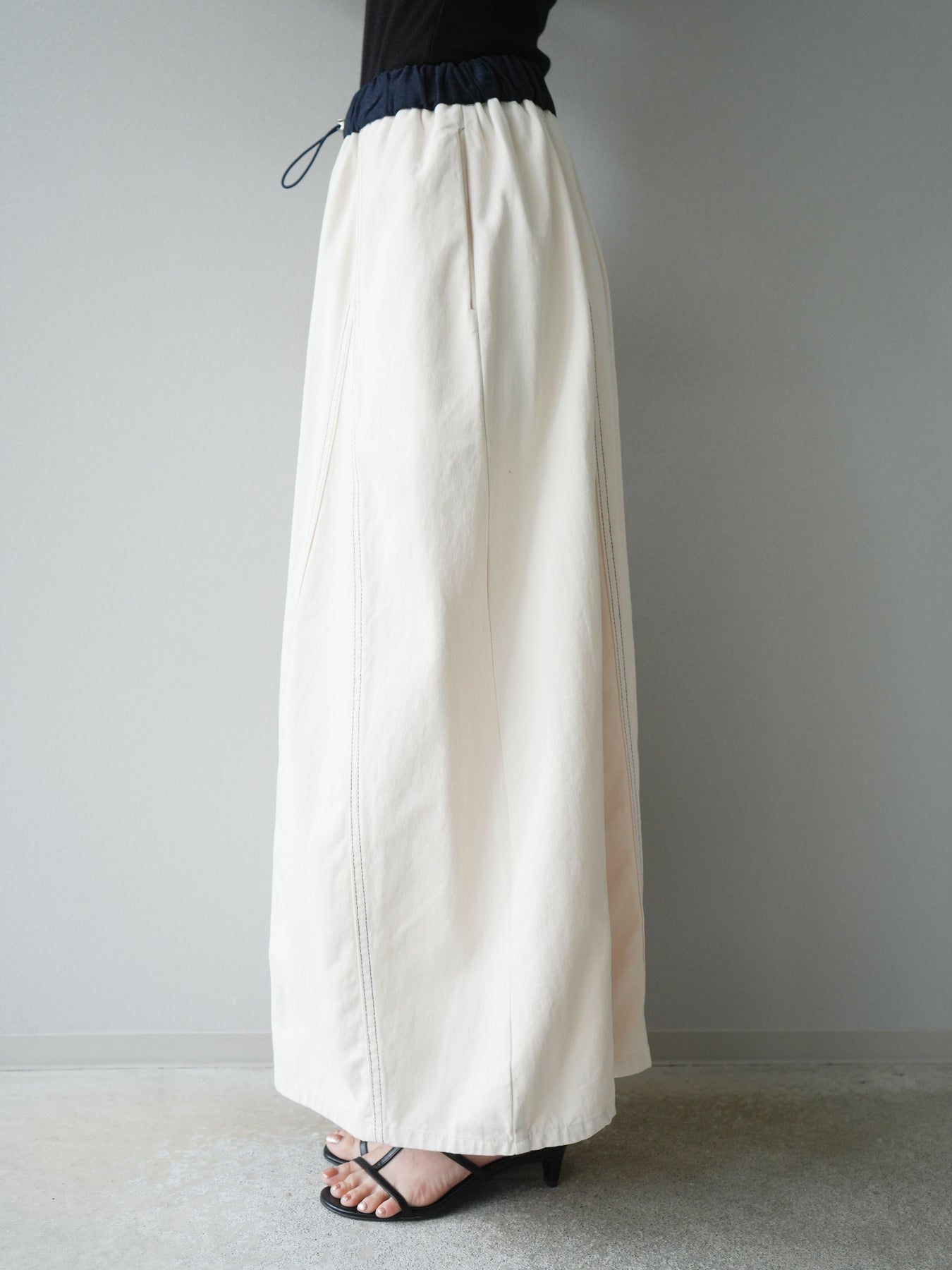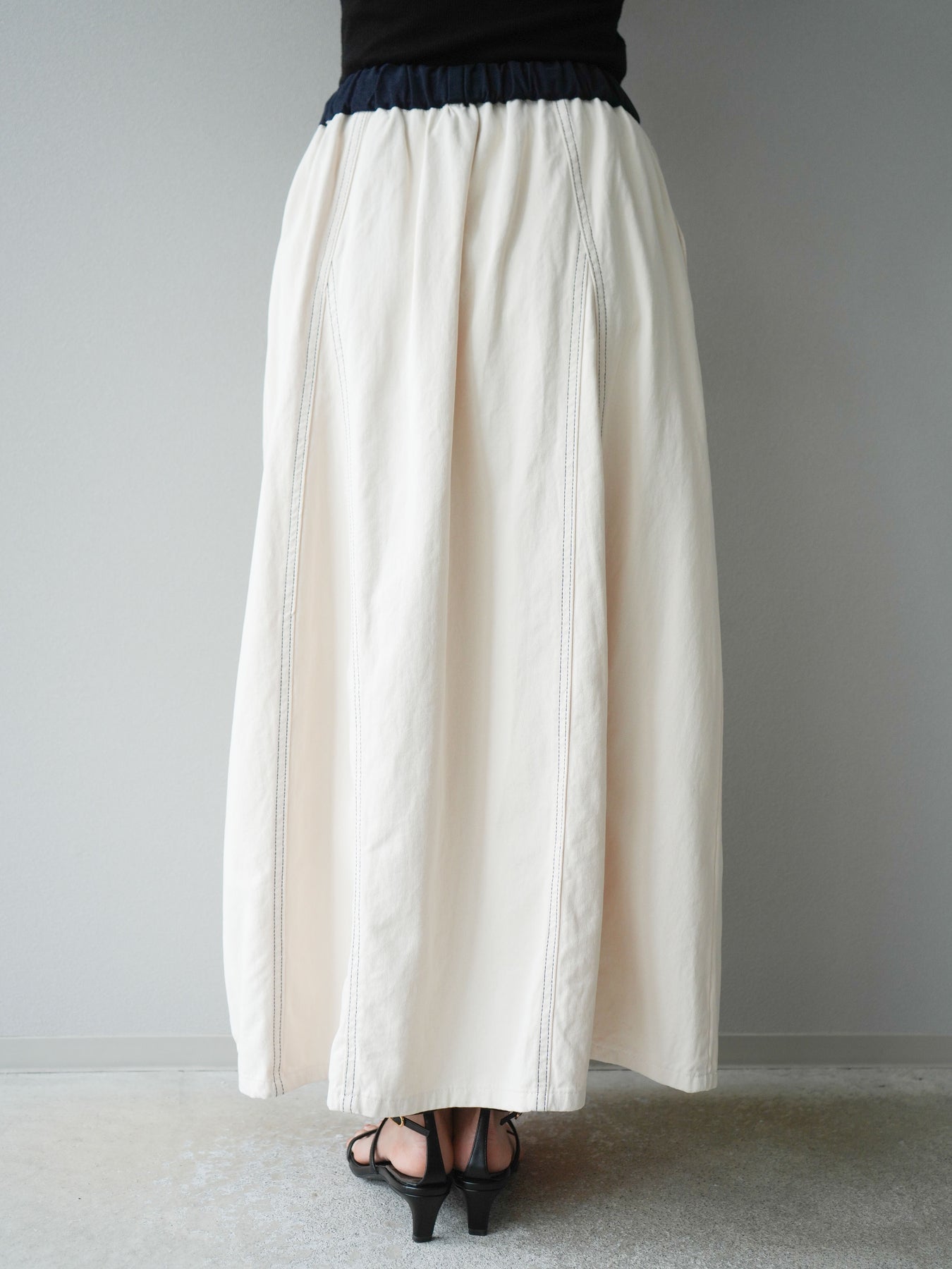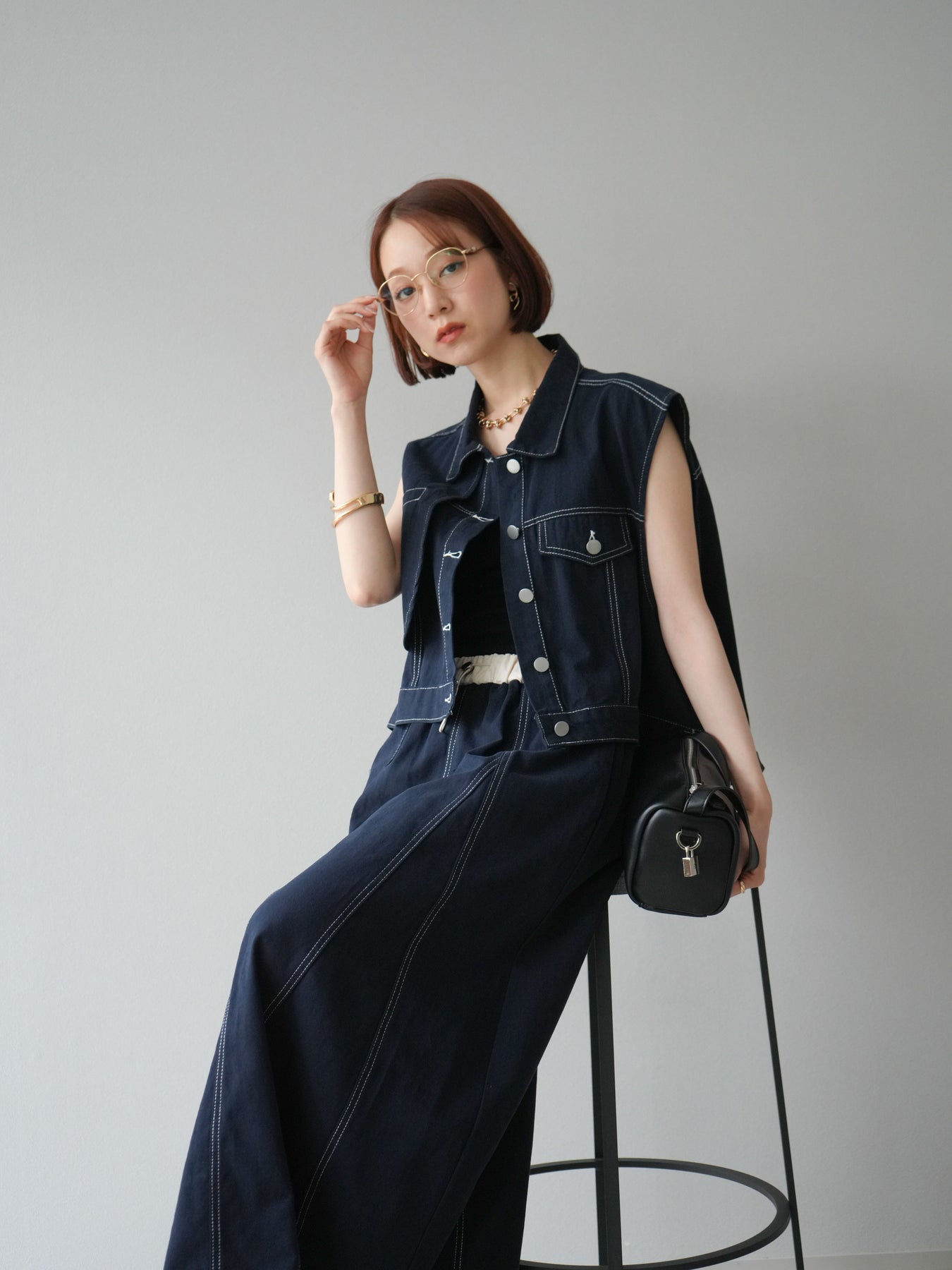 表情豊かなコットンツイル素材に配色ステッチが映える、ベストとスカートのセットアップ。ベストはコンパクトな丈感とミニマルなデザインに、丸みのあるフラップディテールがモードなアクセントを添えています。 スカートはハイウエストデザインでスタイルアップ効果があり、ウエストのドロスト仕様がカジュアルさと調整性を両立。縦に走るステッチラインが縦長効果を生み、すっきりとした印象に仕上がります。 セットでの着用はもちろん、それぞれ単品でも着回し力抜群の、デイリーに映える都会的なアイテムです。 ※ボトムス、キャミソール(インナー)以外の商品は一律でインナーは付属していません。