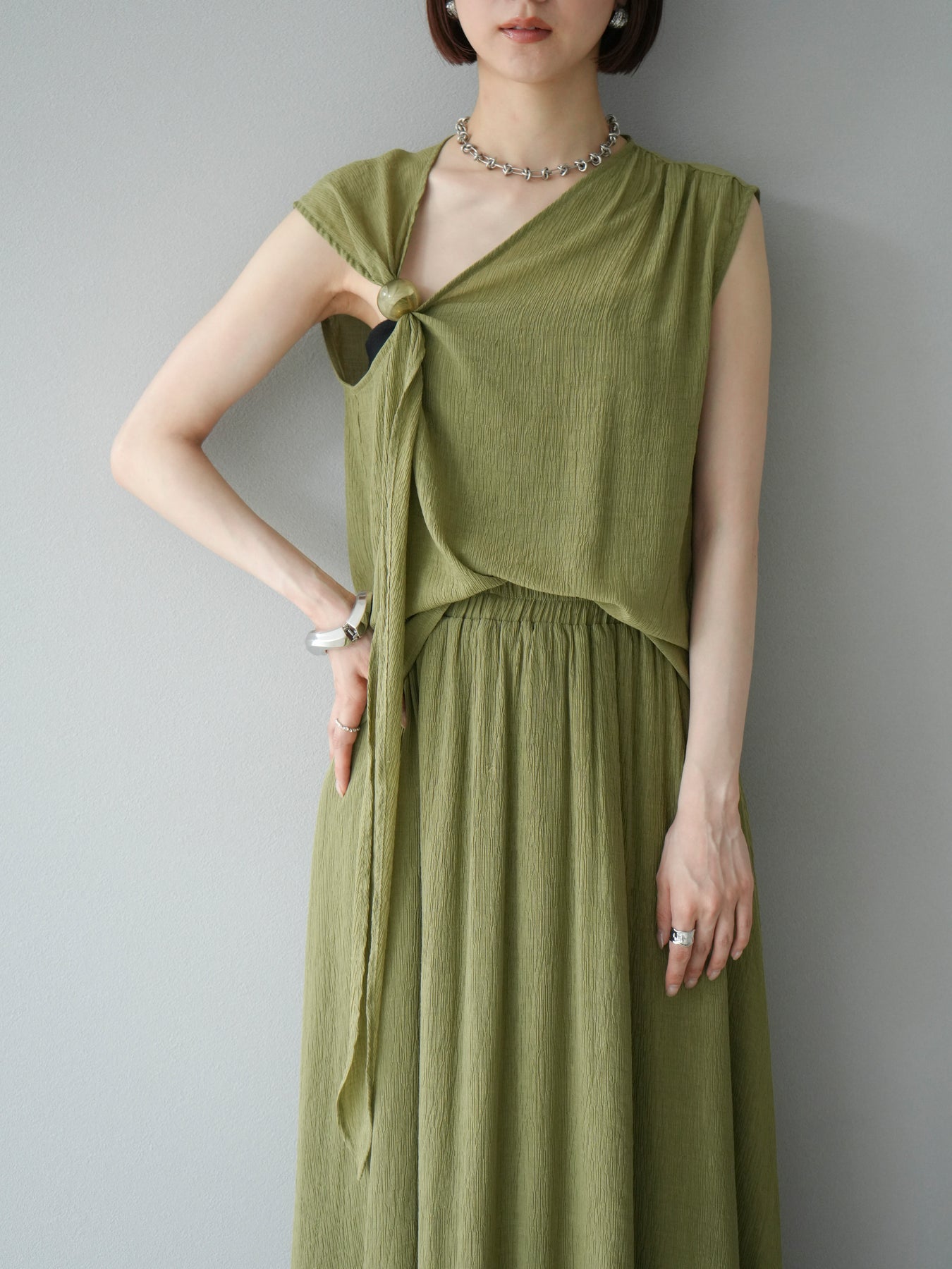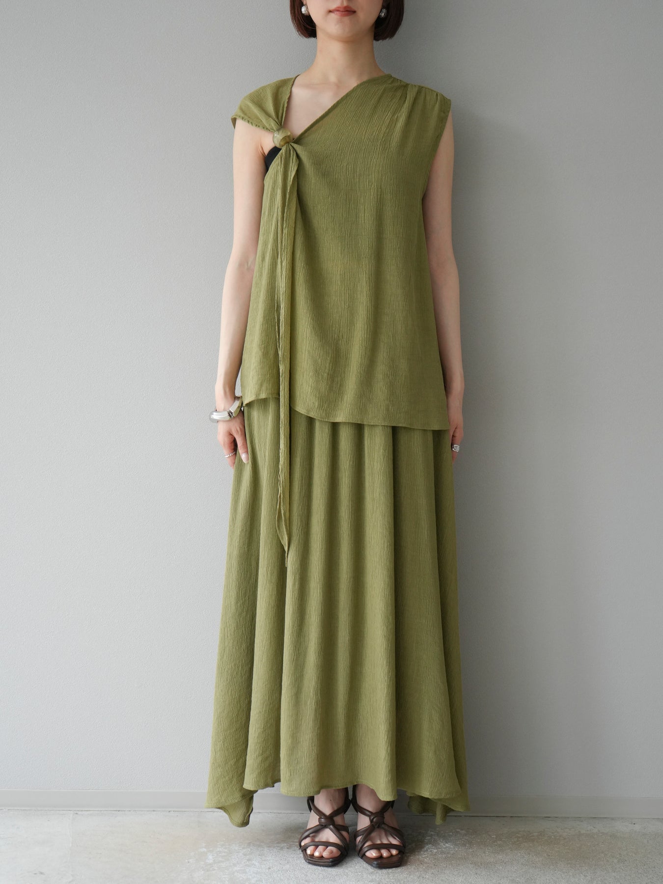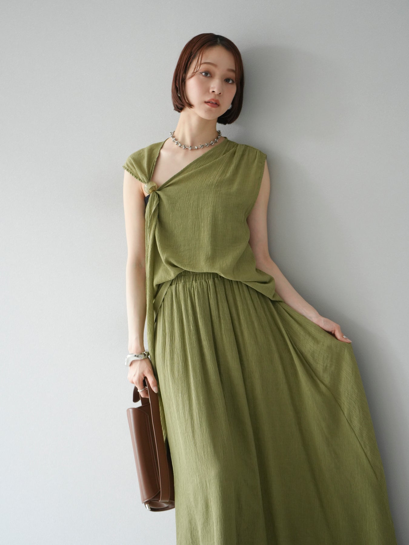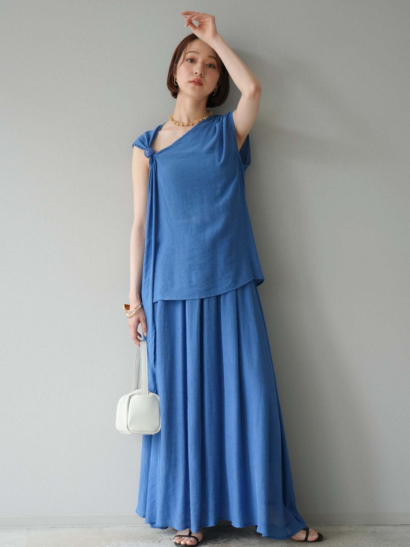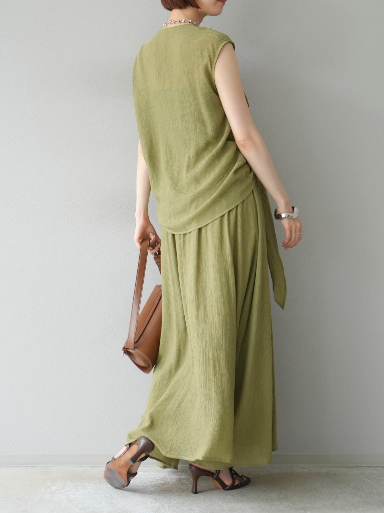 涼しげな楊柳素材を使用した、ビーズモチーフ付きアシンメトリーブラウスとフレアスカートのセットアップ。ブラウスは片側に寄せたドレープとビーズディテールがアクセントになり、1枚で立体感と動きを演出します。 スカートはウエストゴム仕様のストレスフリーな穿き心地で、揺れ感のあるフレアシルエットが女性らしさを引き立てます。軽やかな素材感が夏のムードにぴったりで、セットでも単品でも着回し力の高いアイテムです。 旅行やリゾートはもちろん、デイリーコーデにも映える大人のリラックススタイルに。 ※ボトムス、キャミソール(インナー)以外の商品は一律でインナーは付属していません。
