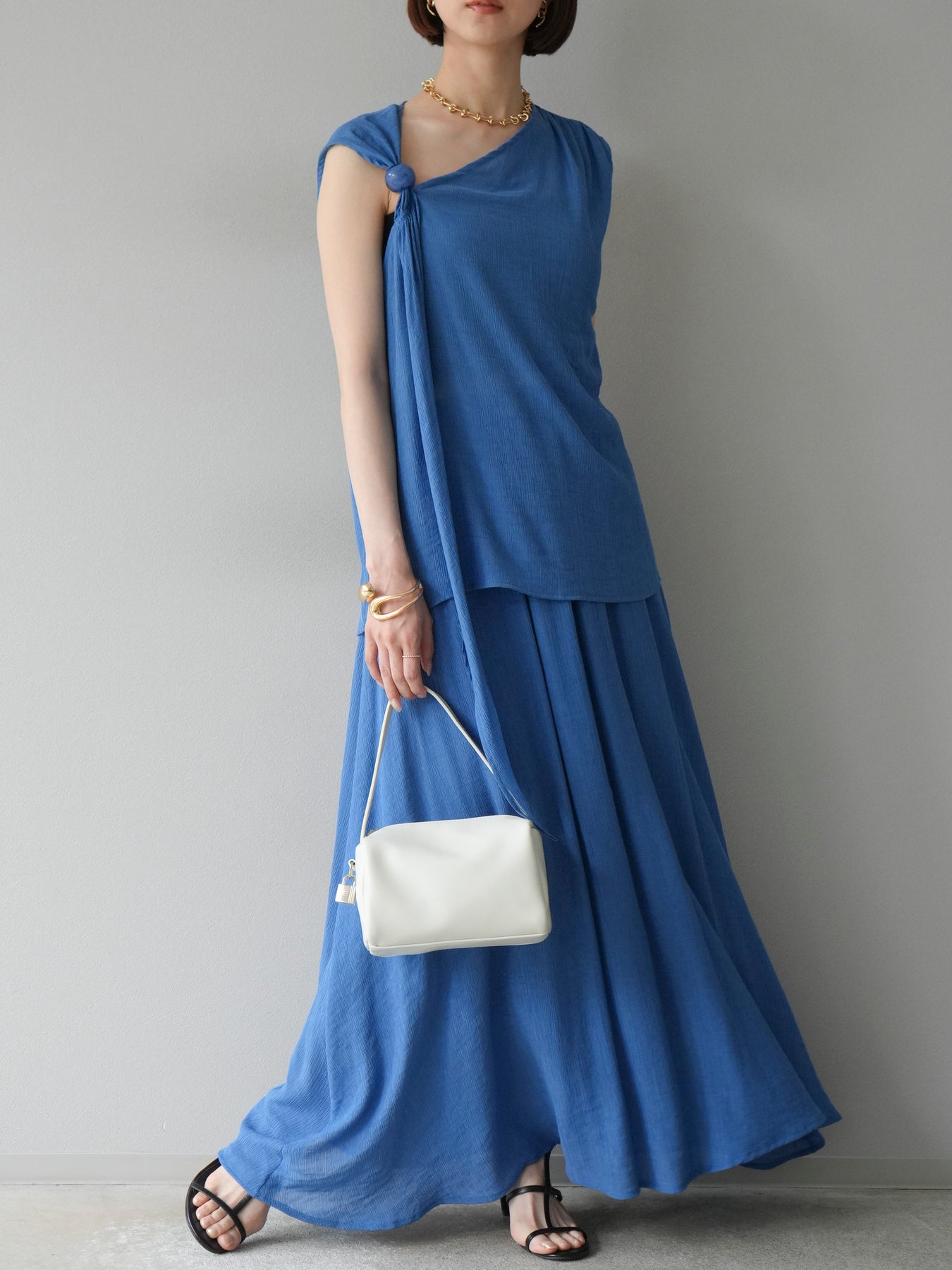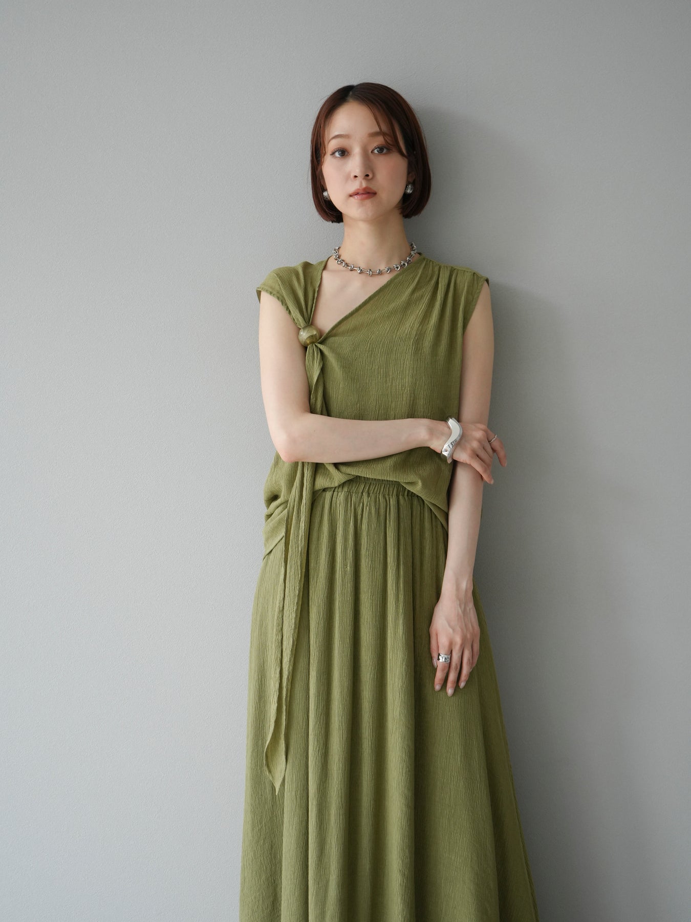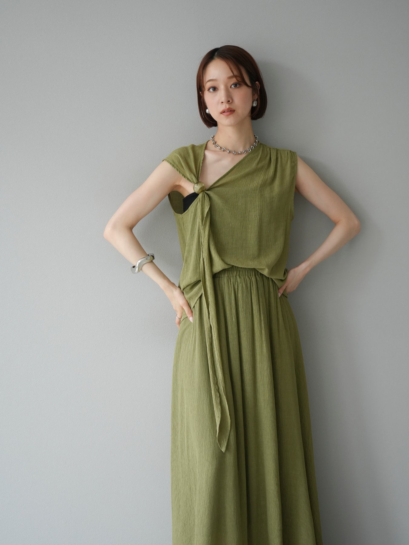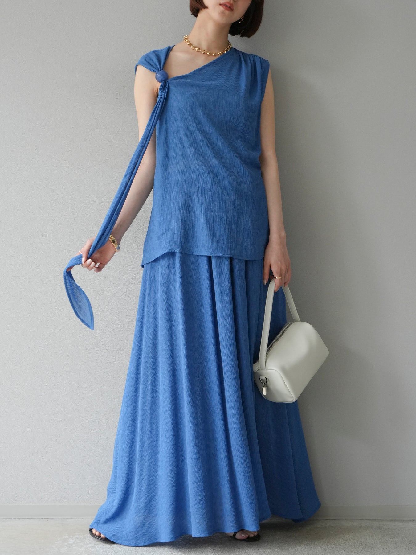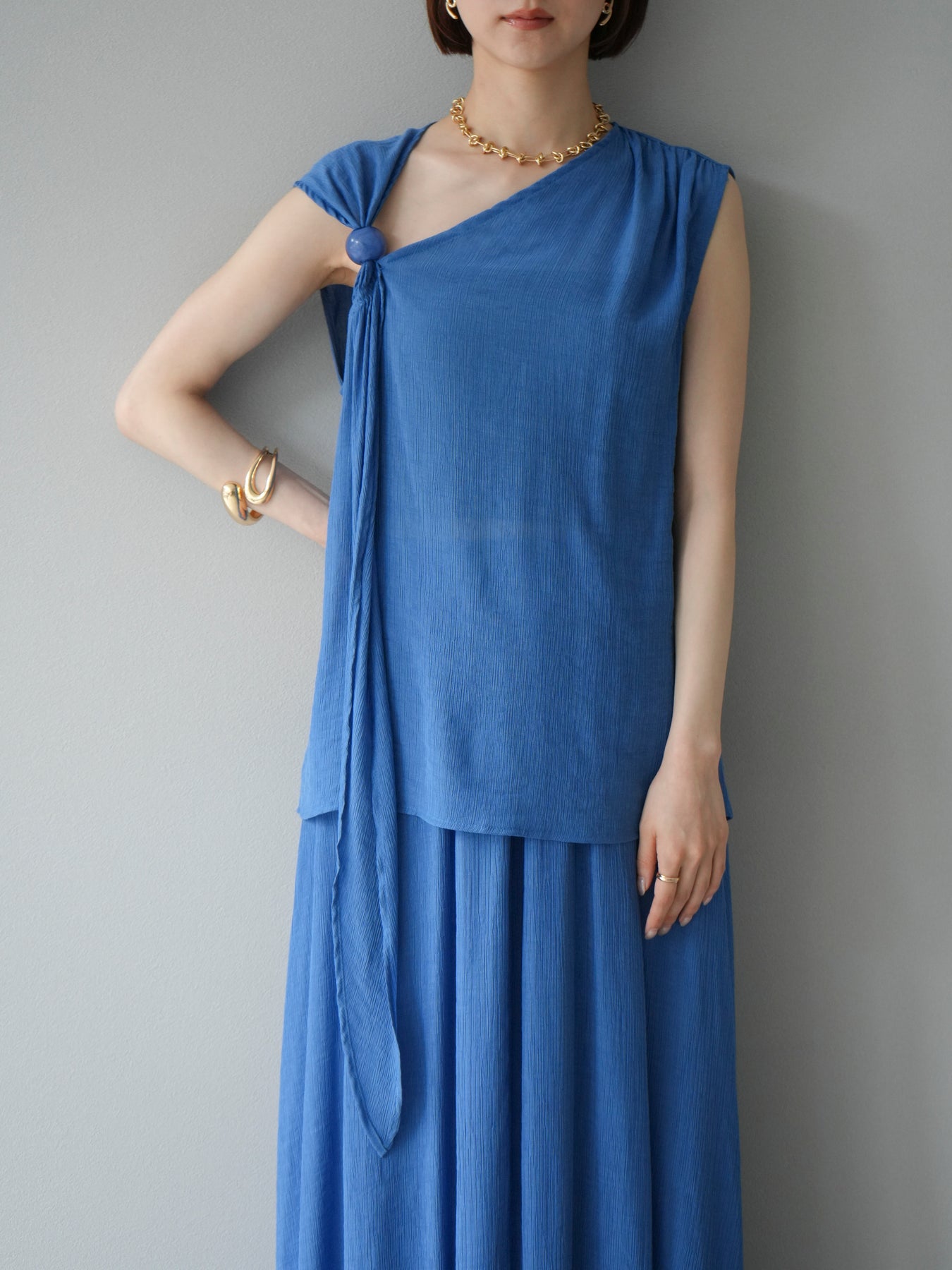 涼しげな楊柳素材を使用した、ビーズモチーフ付きアシンメトリーブラウスとフレアスカートのセットアップ。ブラウスは片側に寄せたドレープとビーズディテールがアクセントになり、1枚で立体感と動きを演出します。 スカートはウエストゴム仕様のストレスフリーな穿き心地で、揺れ感のあるフレアシルエットが女性らしさを引き立てます。軽やかな素材感が夏のムードにぴったりで、セットでも単品でも着回し力の高いアイテムです。 旅行やリゾートはもちろん、デイリーコーデにも映える大人のリラックススタイルに。 ※ボトムス、キャミソール(インナー)以外の商品は一律でインナーは付属していません。