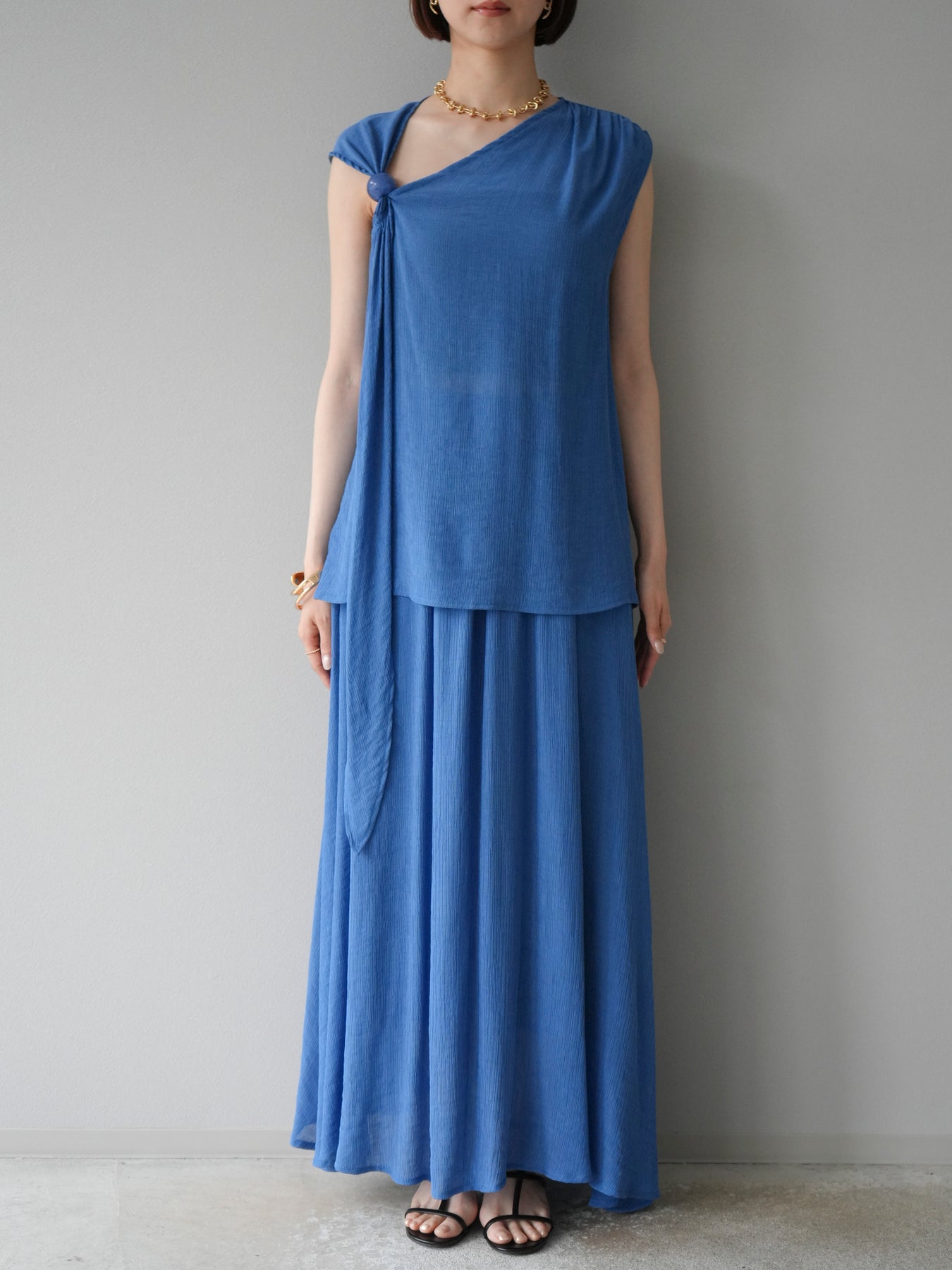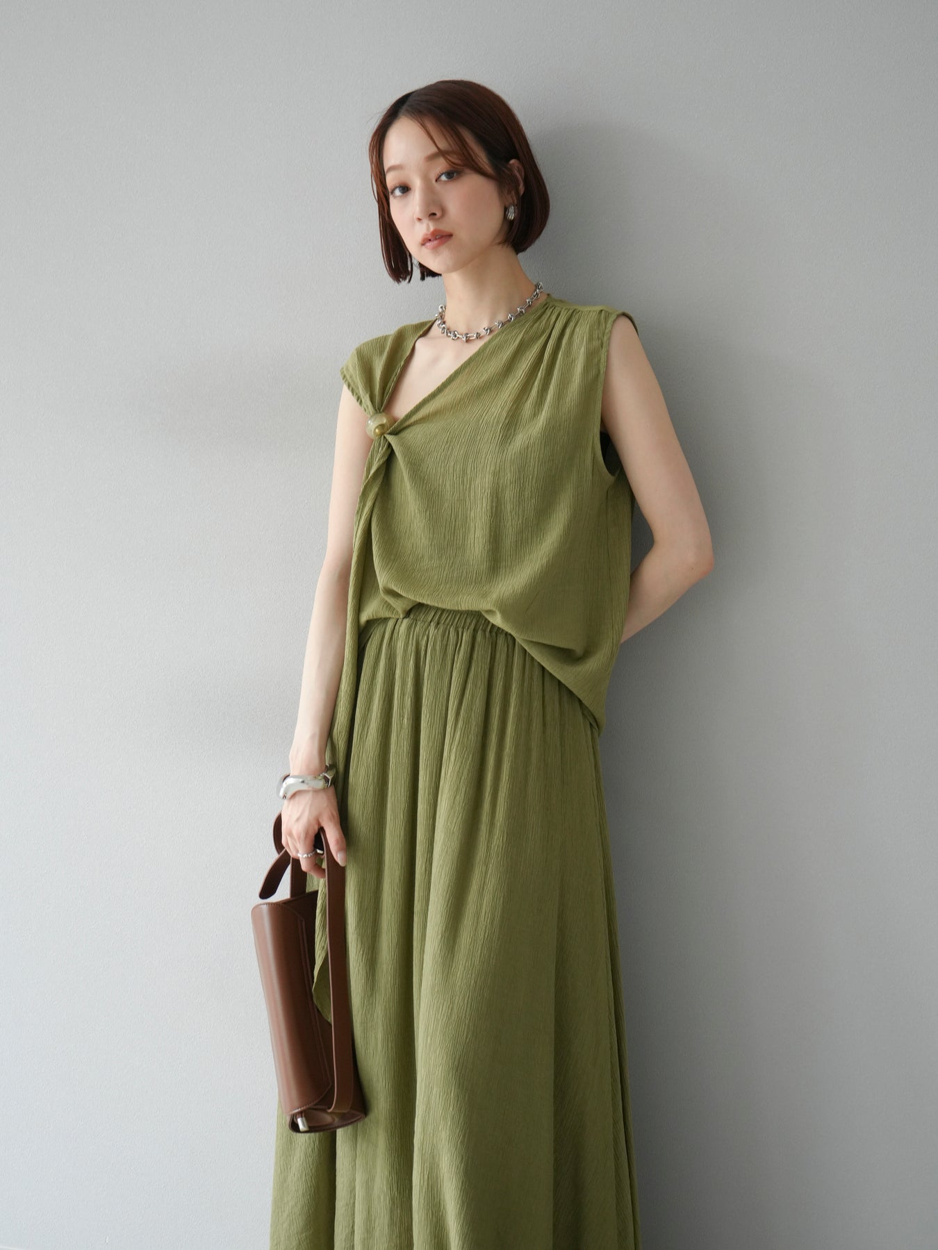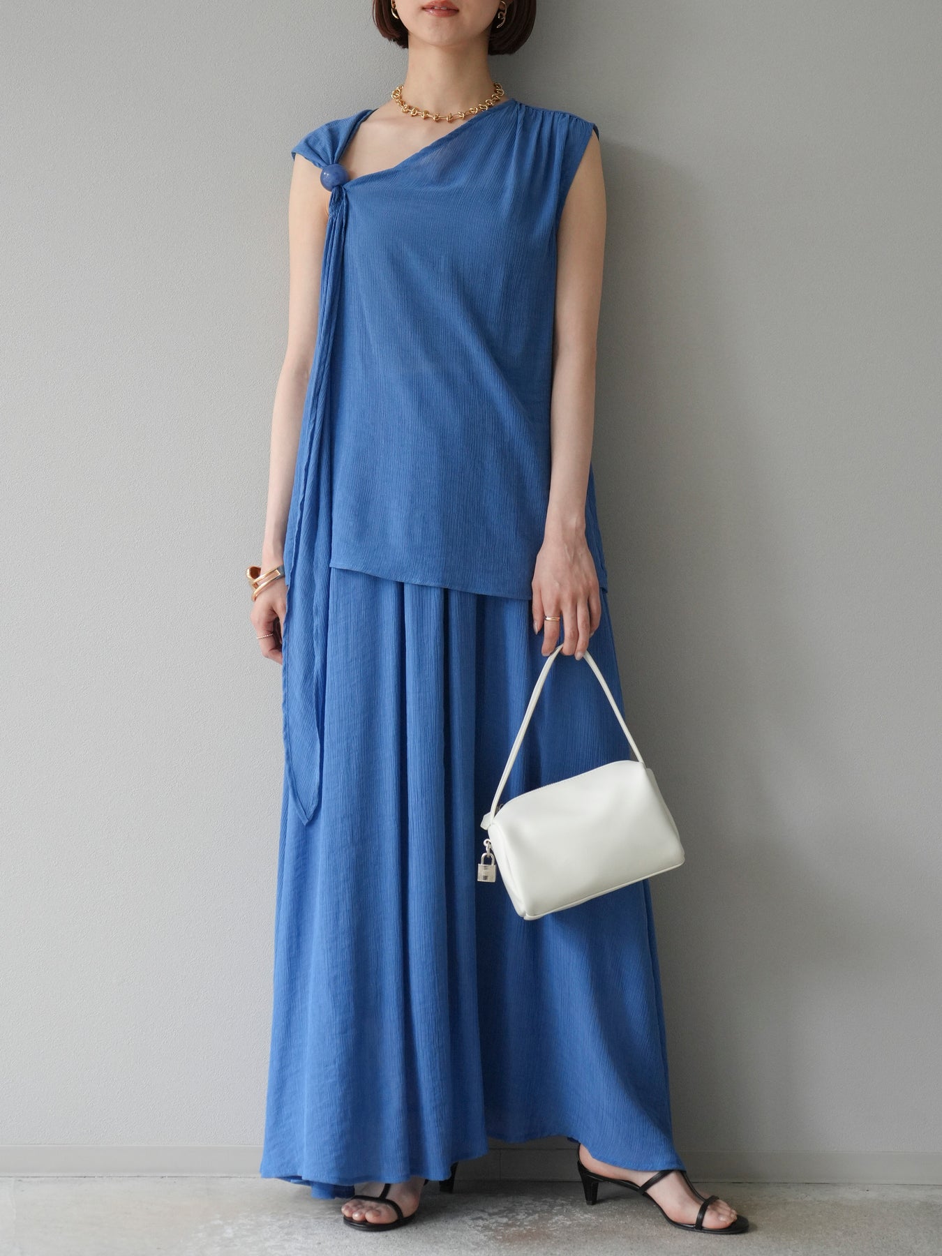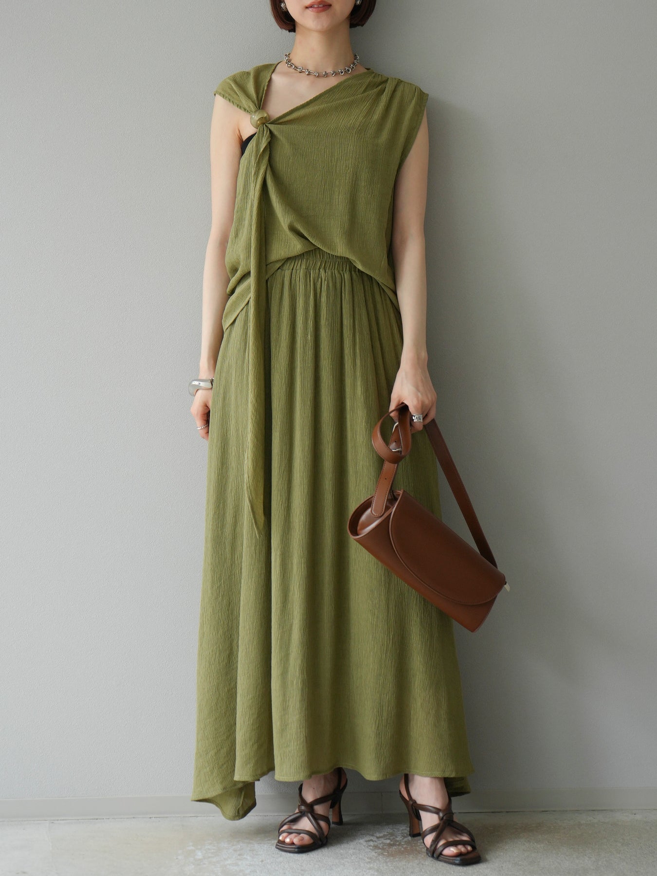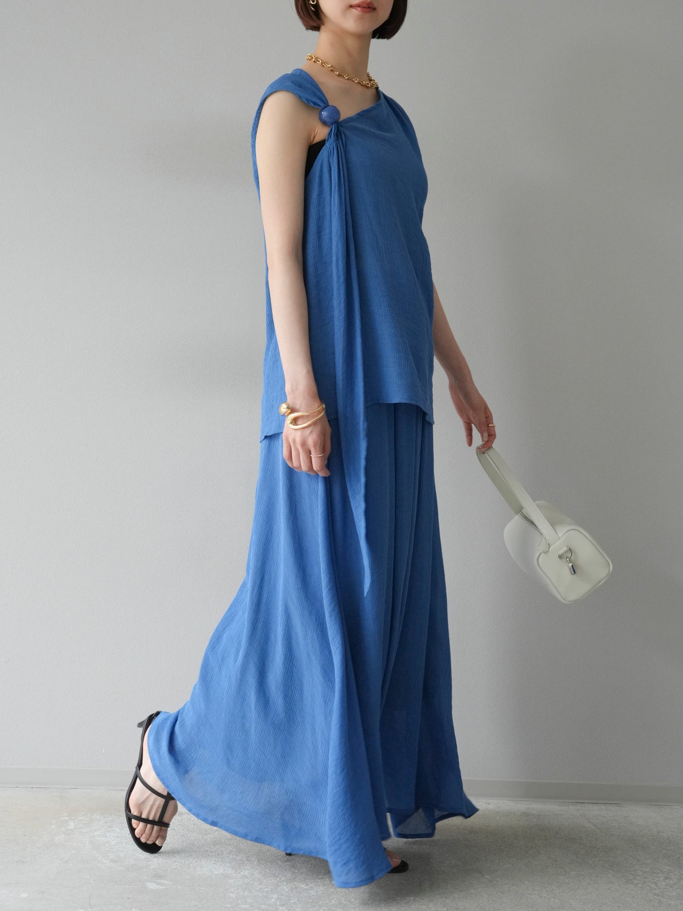 涼しげな楊柳素材を使用した、ビーズモチーフ付きアシンメトリーブラウスとフレアスカートのセットアップ。ブラウスは片側に寄せたドレープとビーズディテールがアクセントになり、1枚で立体感と動きを演出します。 スカートはウエストゴム仕様のストレスフリーな穿き心地で、揺れ感のあるフレアシルエットが女性らしさを引き立てます。軽やかな素材感が夏のムードにぴったりで、セットでも単品でも着回し力の高いアイテムです。 旅行やリゾートはもちろん、デイリーコーデにも映える大人のリラックススタイルに。 ※ボトムス、キャミソール(インナー)以外の商品は一律でインナーは付属していません。