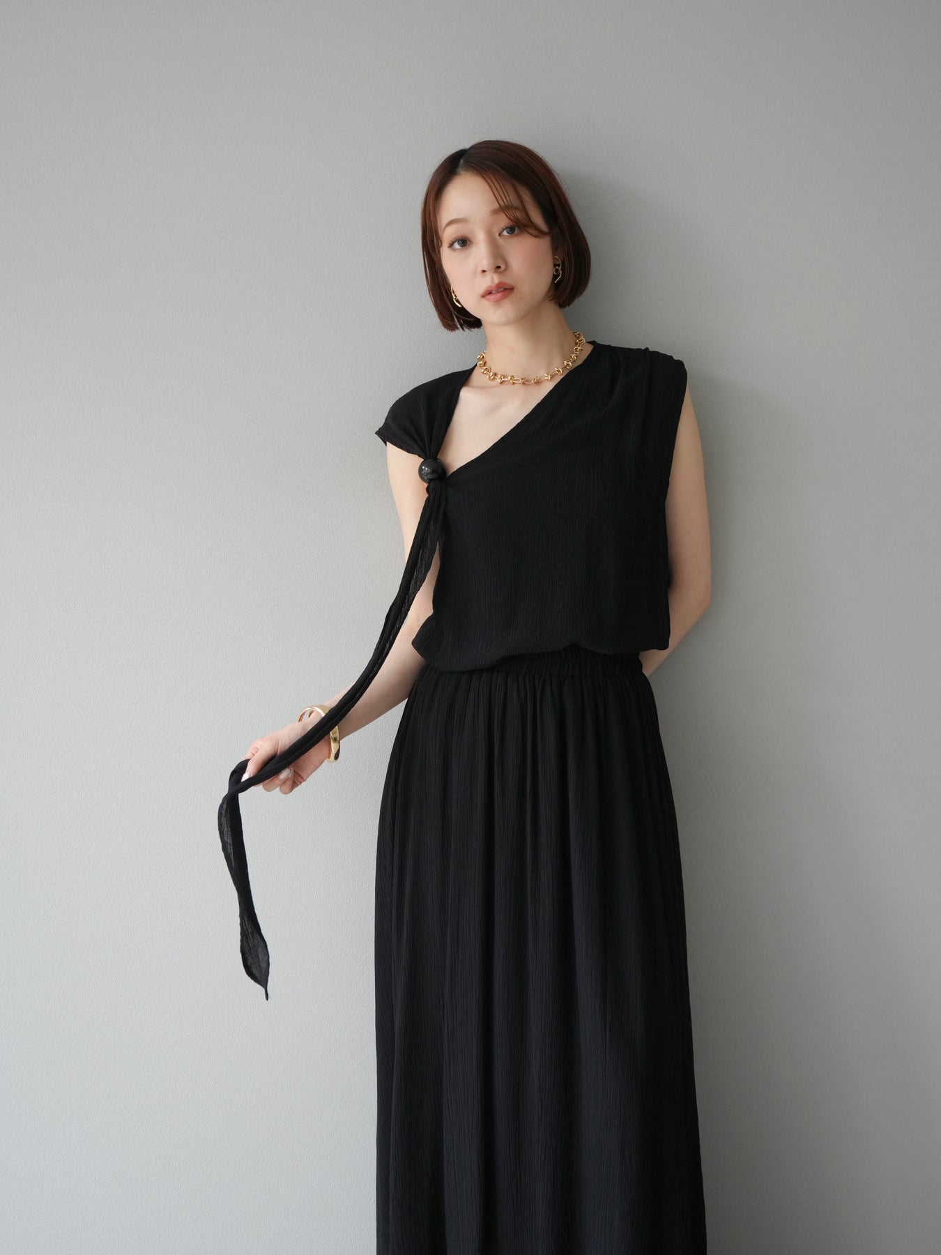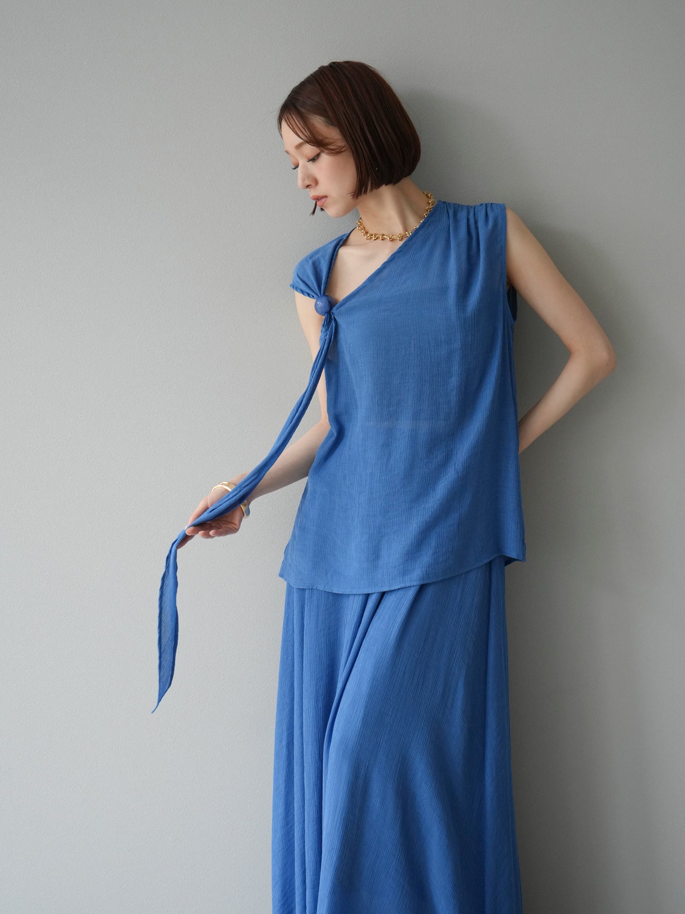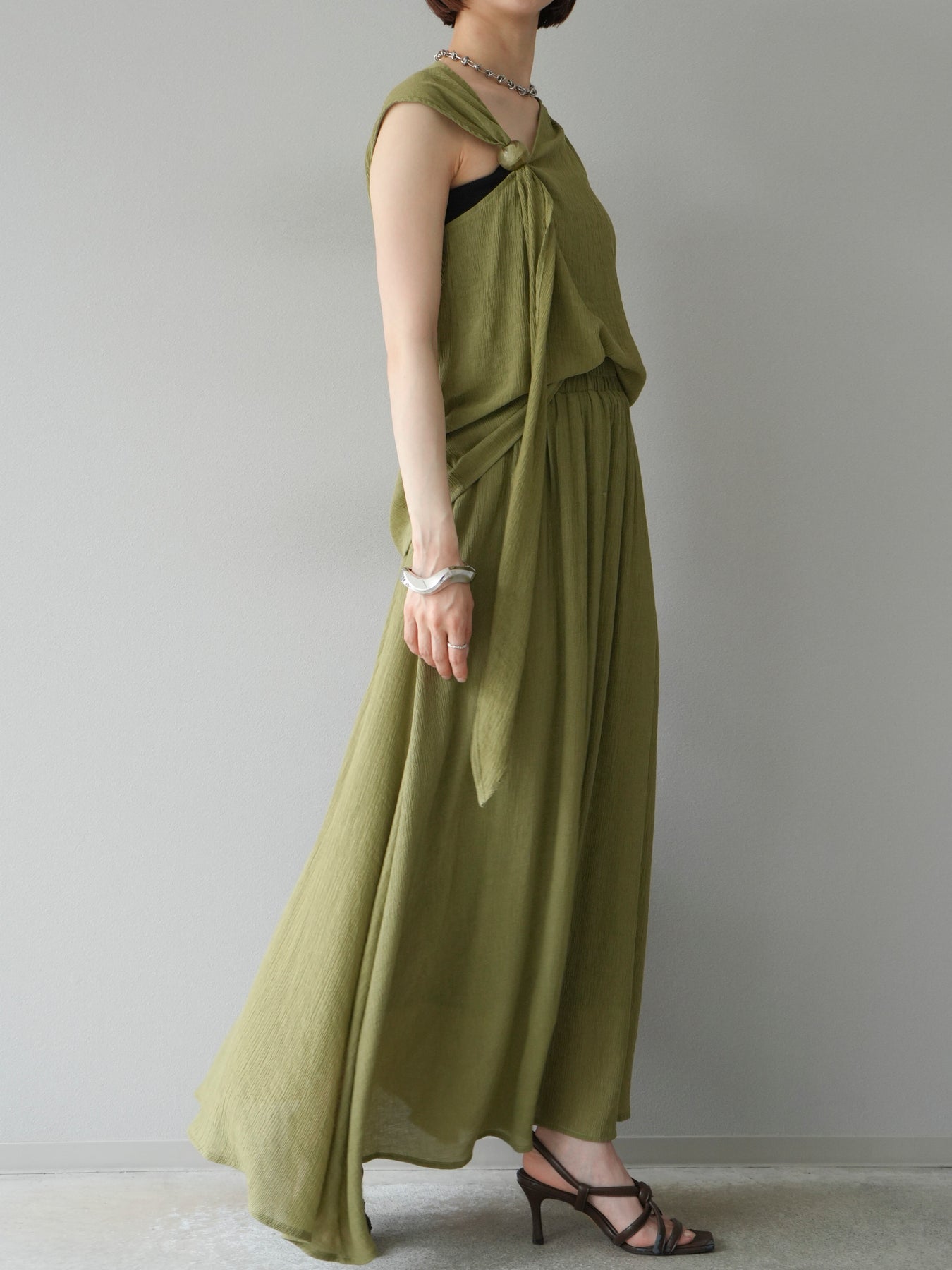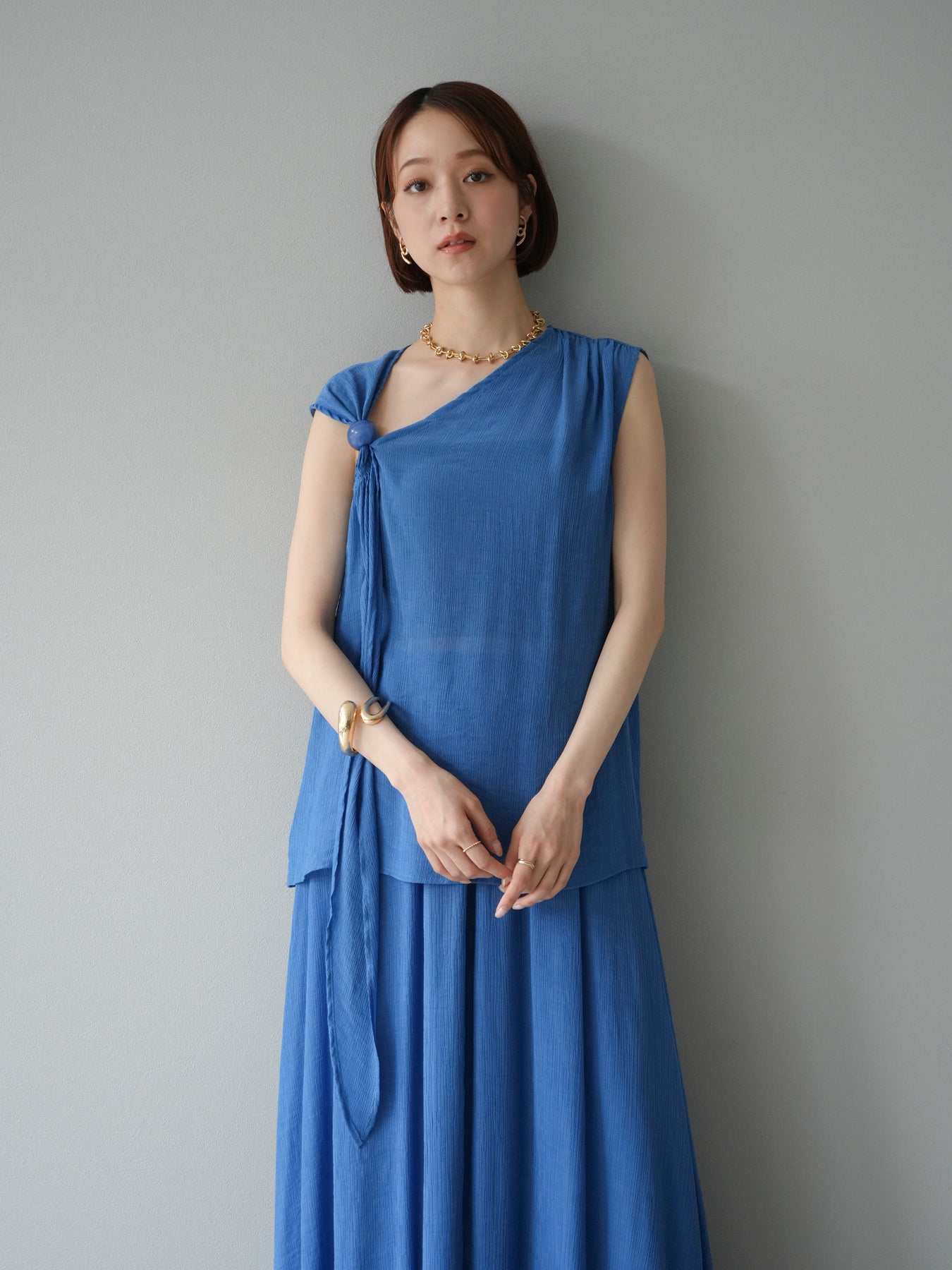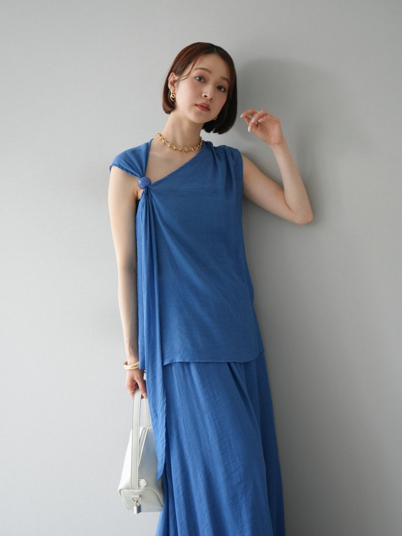 涼しげな楊柳素材を使用した、ビーズモチーフ付きアシンメトリーブラウスとフレアスカートのセットアップ。ブラウスは片側に寄せたドレープとビーズディテールがアクセントになり、1枚で立体感と動きを演出します。 スカートはウエストゴム仕様のストレスフリーな穿き心地で、揺れ感のあるフレアシルエットが女性らしさを引き立てます。軽やかな素材感が夏のムードにぴったりで、セットでも単品でも着回し力の高いアイテムです。 旅行やリゾートはもちろん、デイリーコーデにも映える大人のリラックススタイルに。 ※ボトムス、キャミソール(インナー)以外の商品は一律でインナーは付属していません。