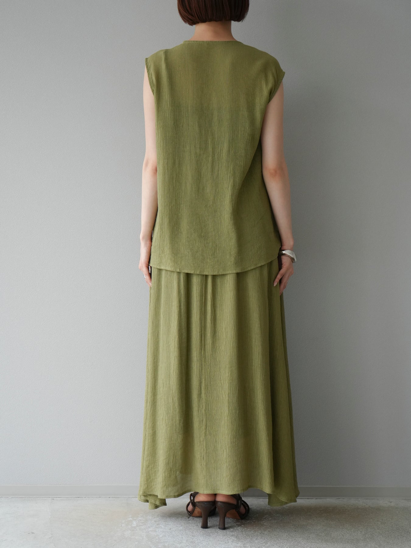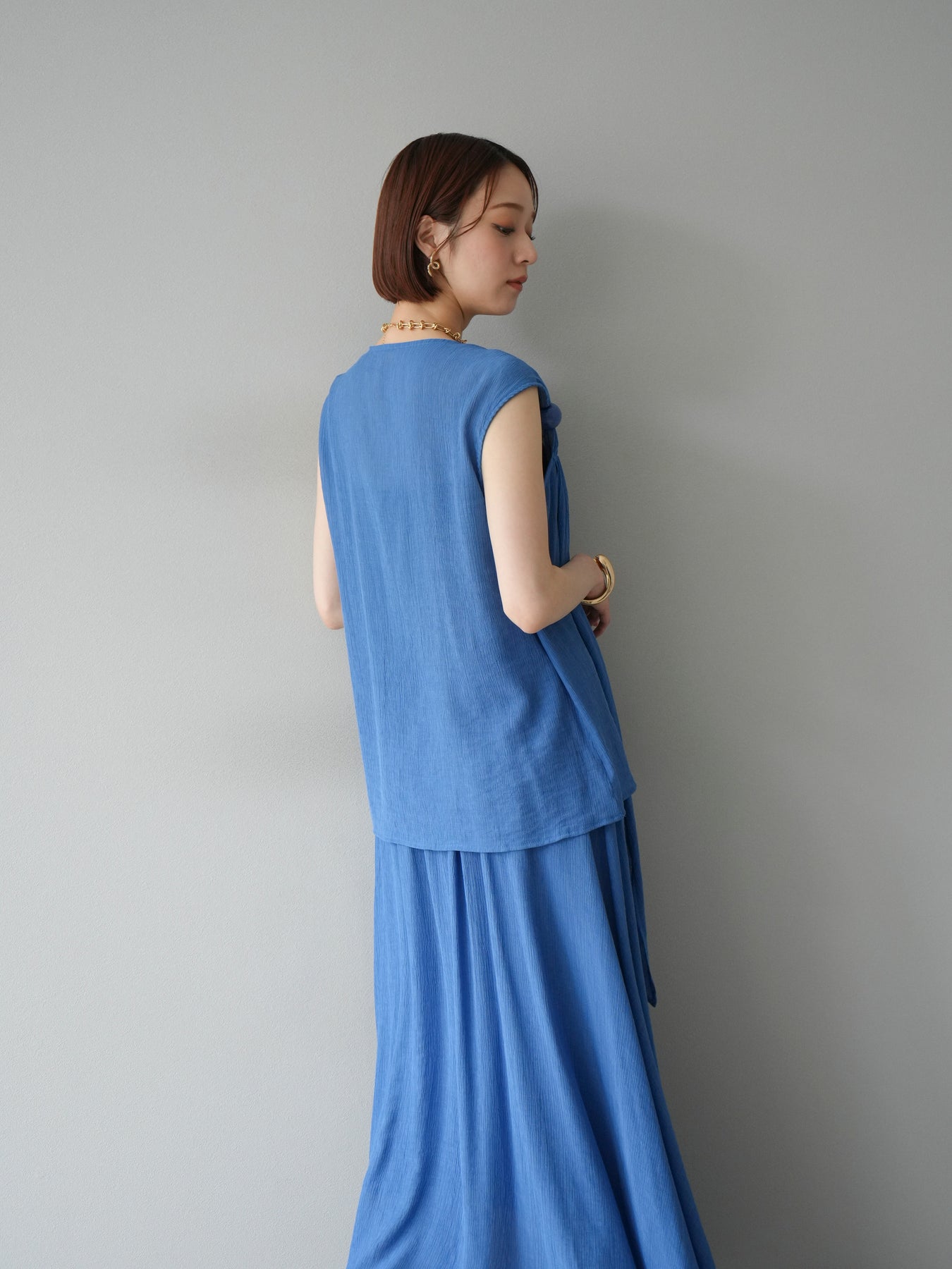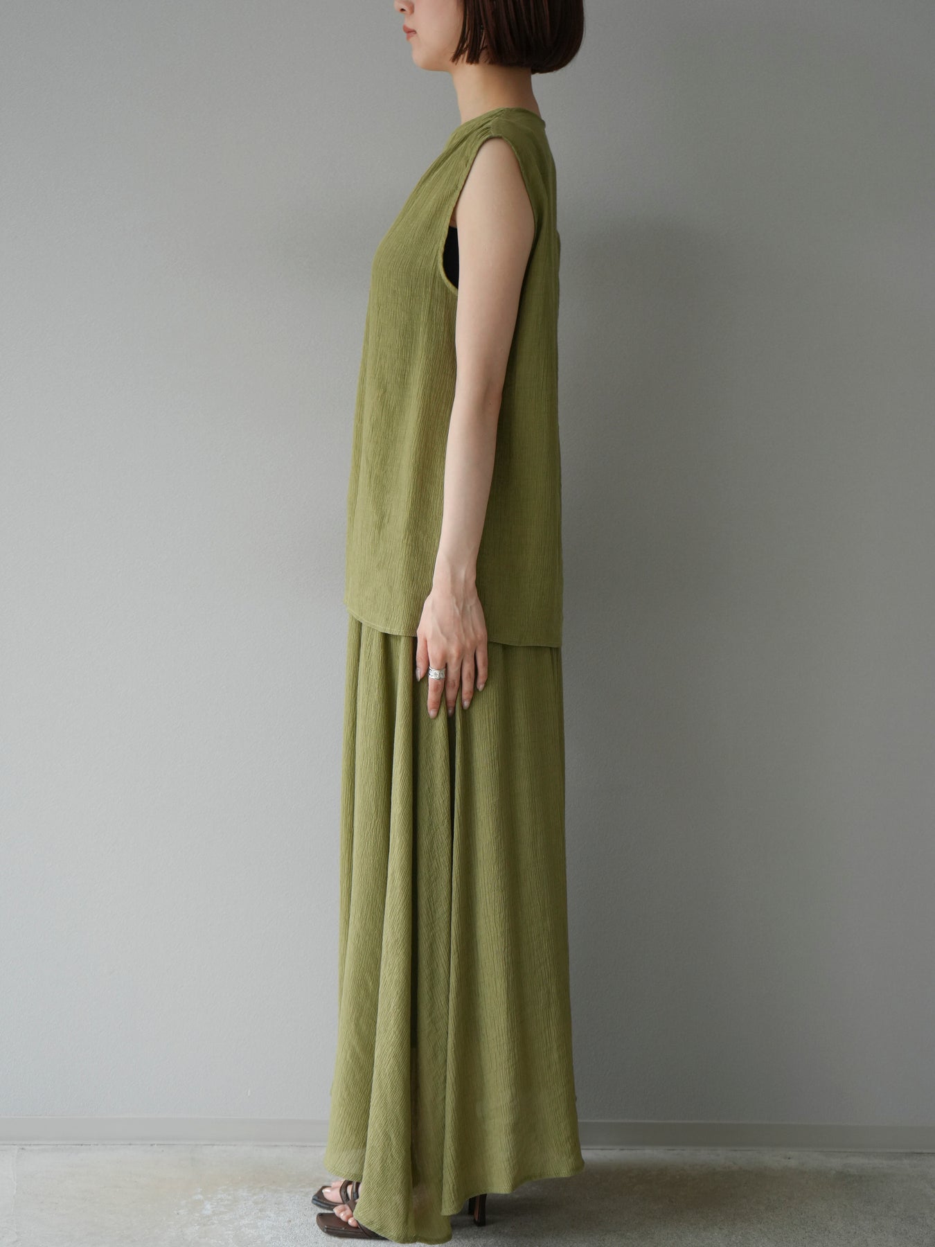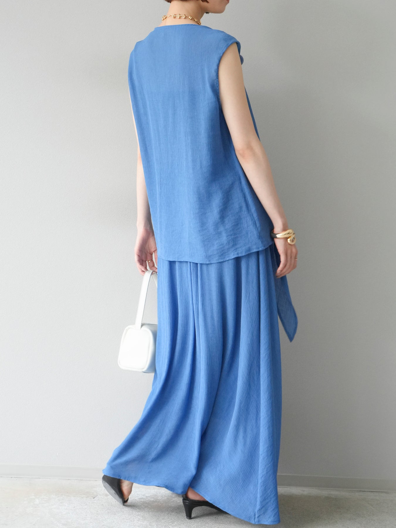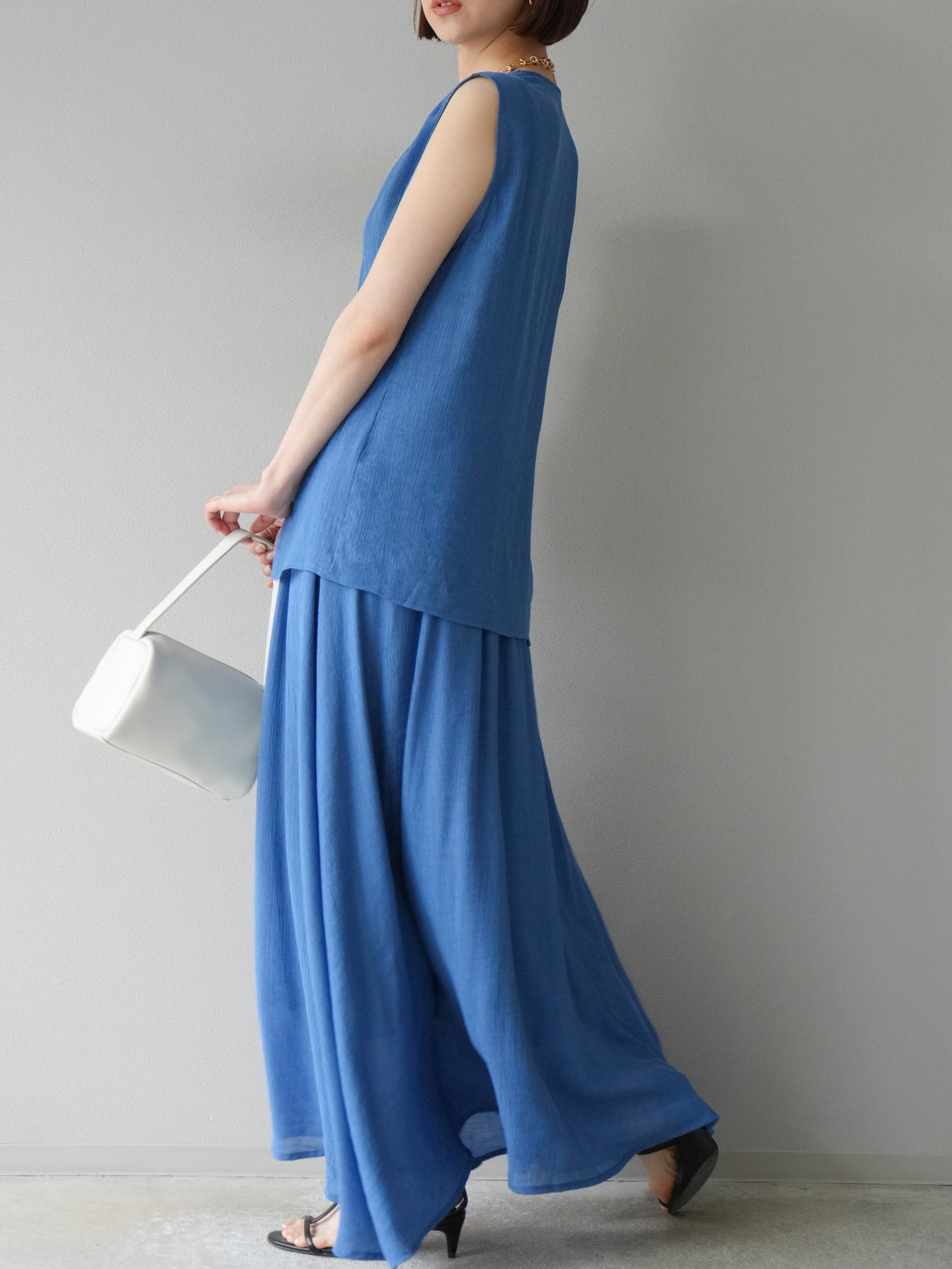 涼しげな楊柳素材を使用した、ビーズモチーフ付きアシンメトリーブラウスとフレアスカートのセットアップ。ブラウスは片側に寄せたドレープとビーズディテールがアクセントになり、1枚で立体感と動きを演出します。 スカートはウエストゴム仕様のストレスフリーな穿き心地で、揺れ感のあるフレアシルエットが女性らしさを引き立てます。軽やかな素材感が夏のムードにぴったりで、セットでも単品でも着回し力の高いアイテムです。 旅行やリゾートはもちろん、デイリーコーデにも映える大人のリラックススタイルに。 ※ボトムス、キャミソール(インナー)以外の商品は一律でインナーは付属していません。