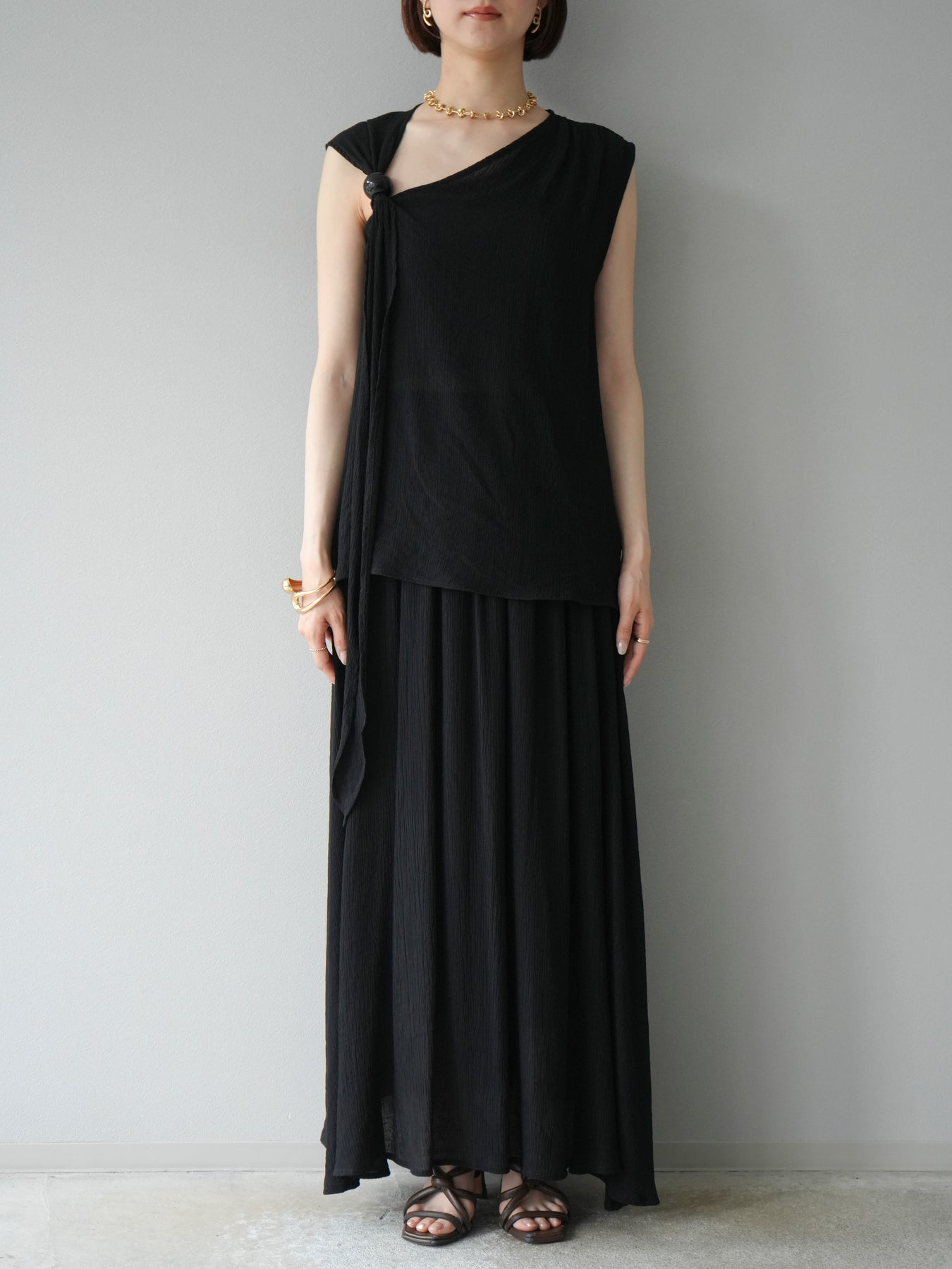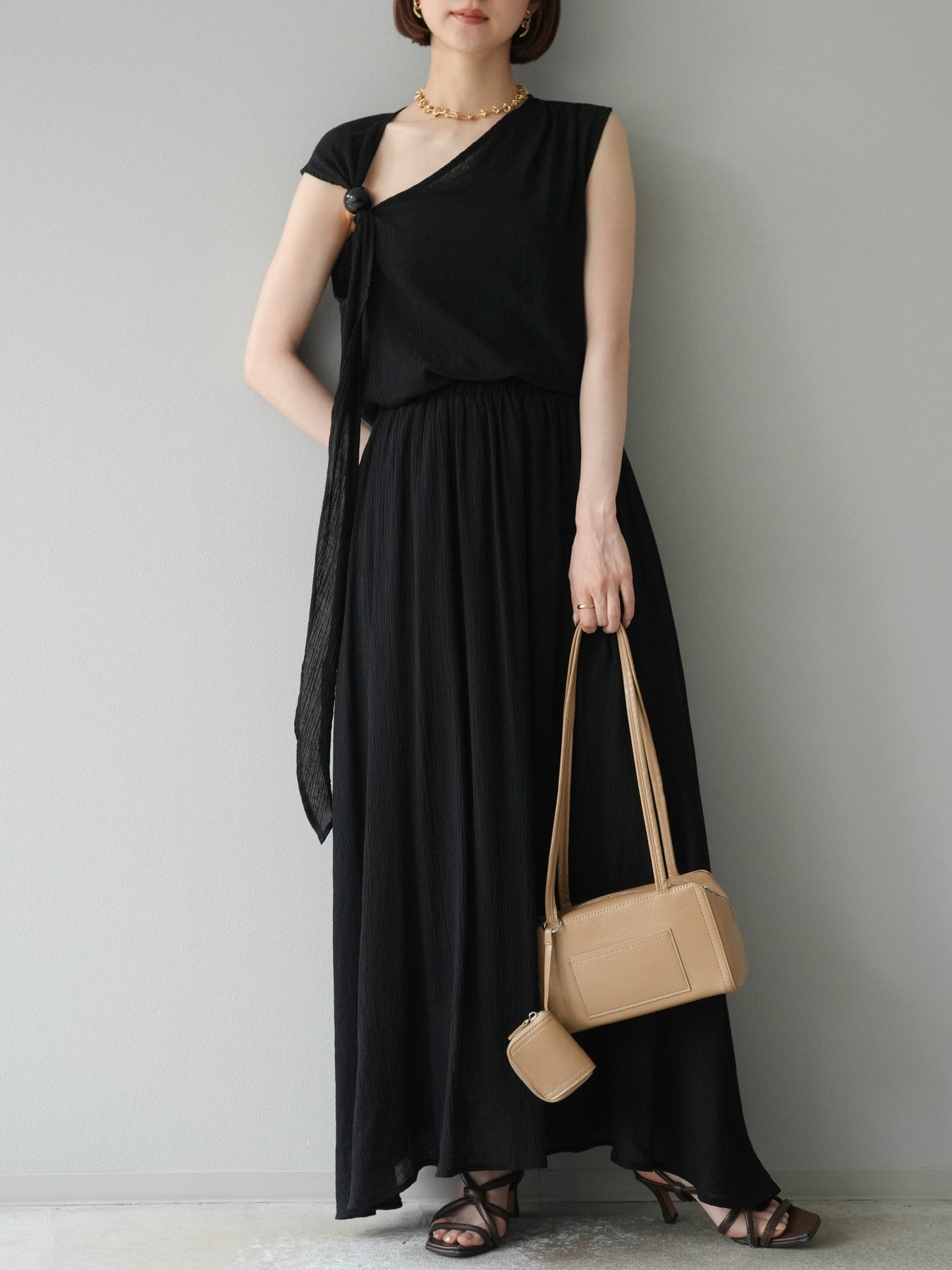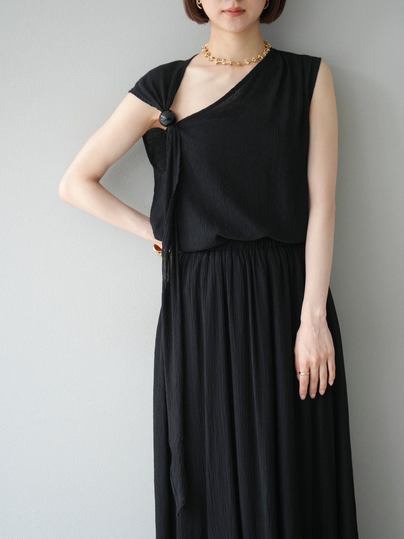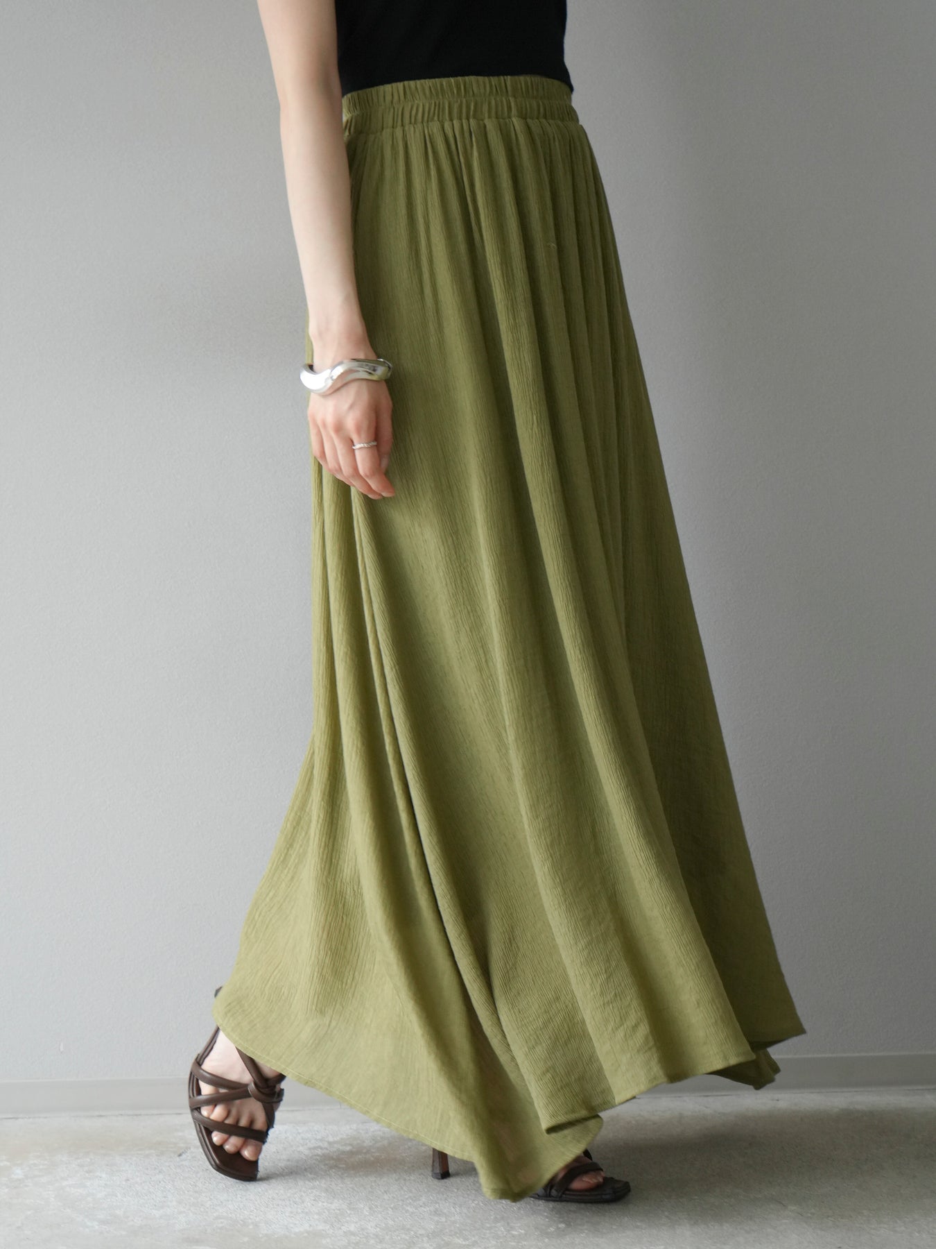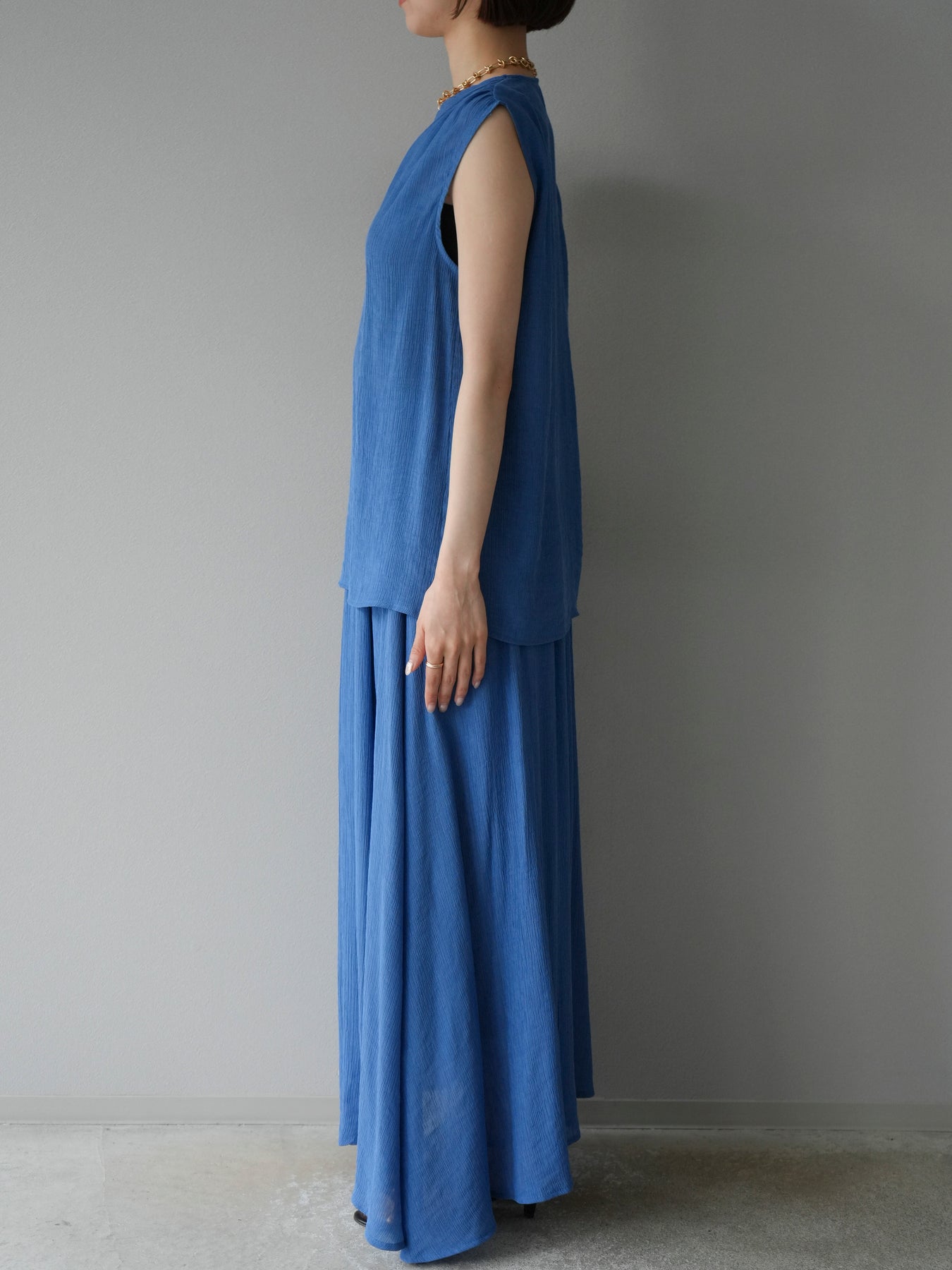 涼しげな楊柳素材を使用した、ビーズモチーフ付きアシンメトリーブラウスとフレアスカートのセットアップ。ブラウスは片側に寄せたドレープとビーズディテールがアクセントになり、1枚で立体感と動きを演出します。 スカートはウエストゴム仕様のストレスフリーな穿き心地で、揺れ感のあるフレアシルエットが女性らしさを引き立てます。軽やかな素材感が夏のムードにぴったりで、セットでも単品でも着回し力の高いアイテムです。 旅行やリゾートはもちろん、デイリーコーデにも映える大人のリラックススタイルに。 ※ボトムス、キャミソール(インナー)以外の商品は一律でインナーは付属していません。