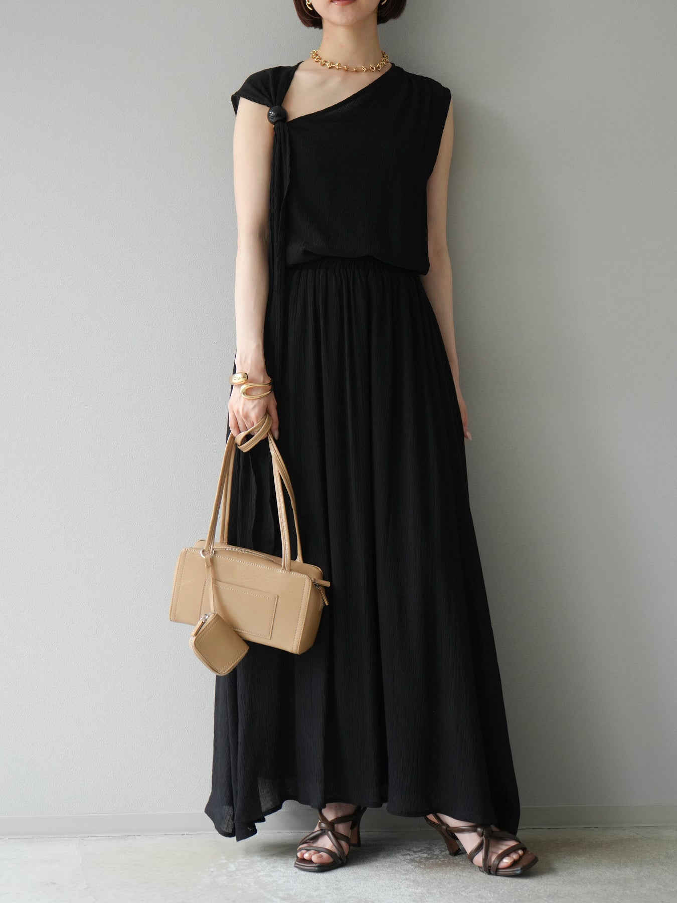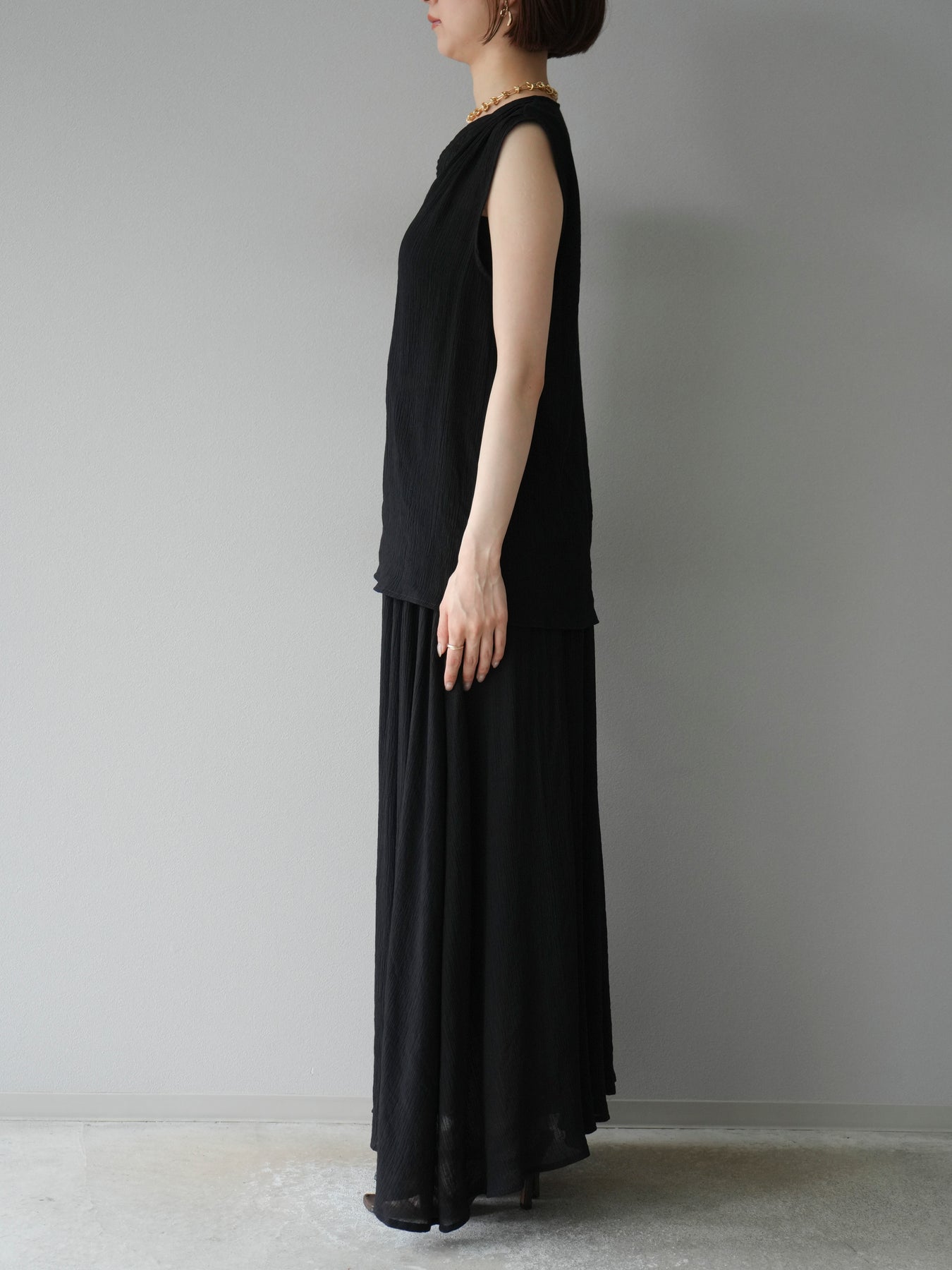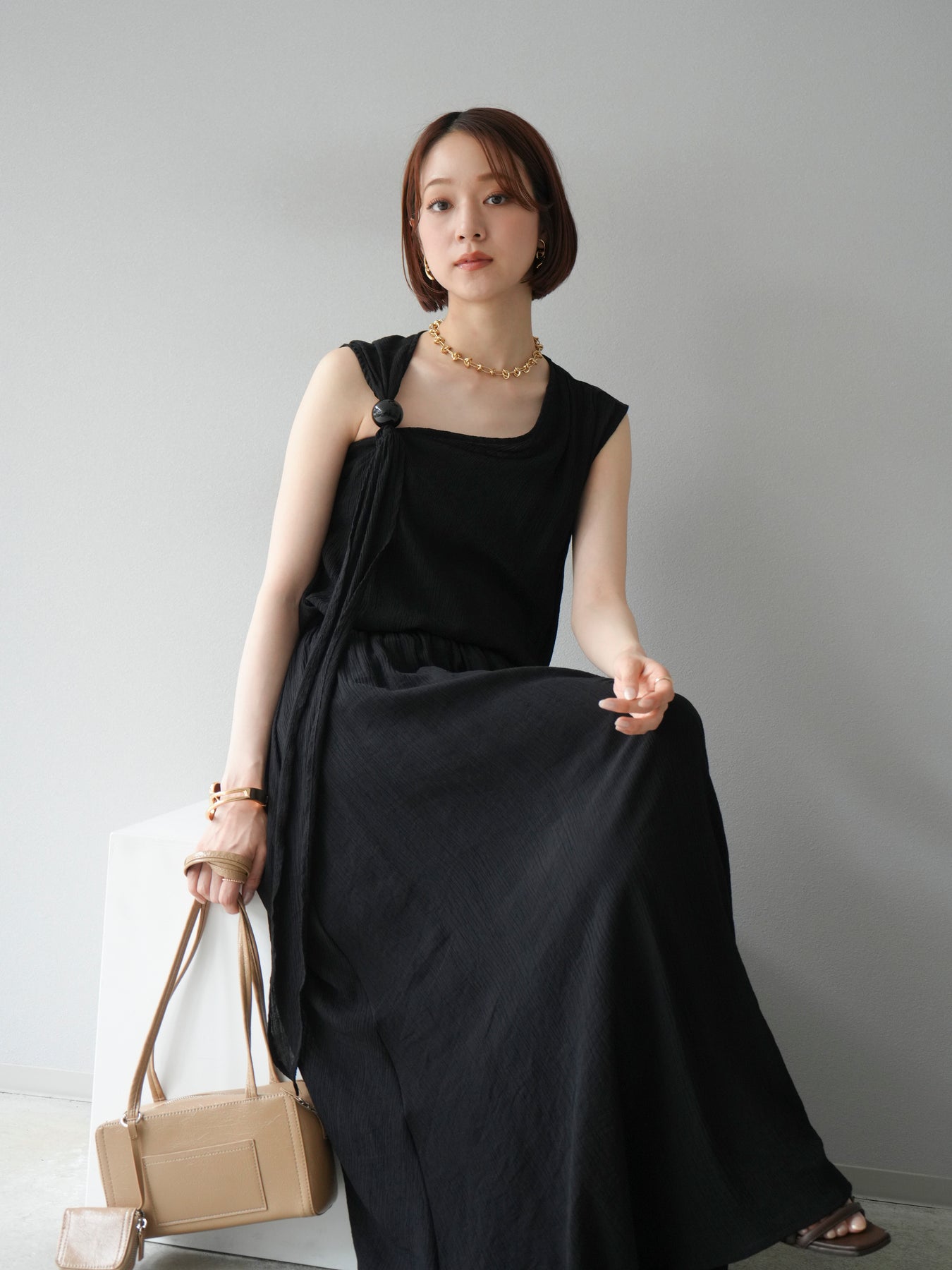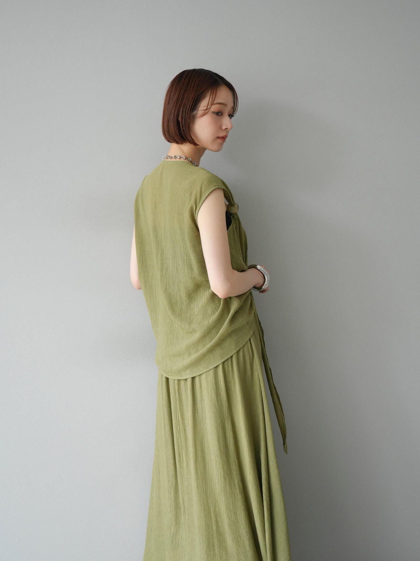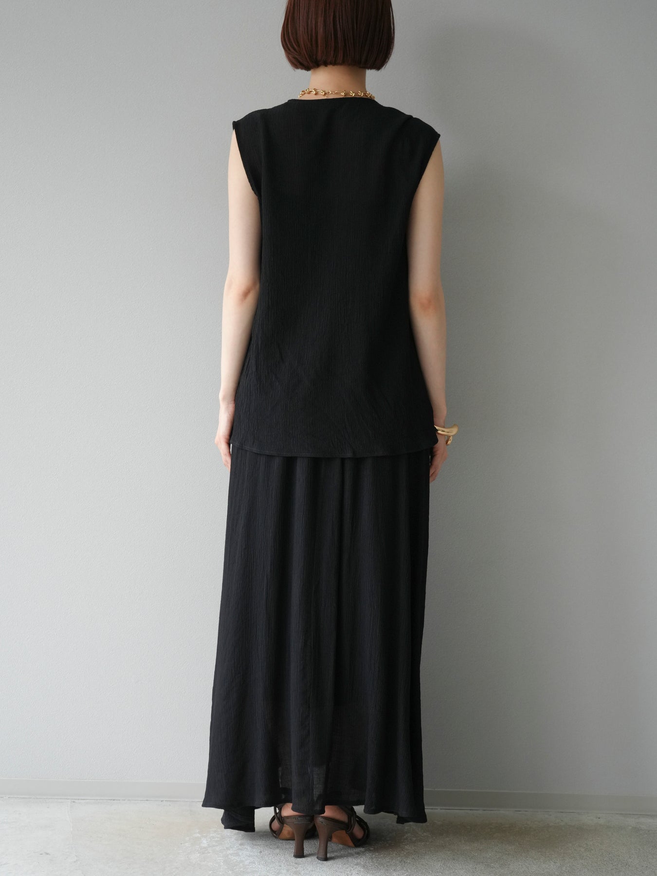涼しげな楊柳素材を使用した、ビーズモチーフ付きアシンメトリーブラウスとフレアスカートのセットアップ。ブラウスは片側に寄せたドレープとビーズディテールがアクセントになり、1枚で立体感と動きを演出します。 スカートはウエストゴム仕様のストレスフリーな穿き心地で、揺れ感のあるフレアシルエットが女性らしさを引き立てます。軽やかな素材感が夏のムードにぴったりで、セットでも単品でも着回し力の高いアイテムです。 旅行やリゾートはもちろん、デイリーコーデにも映える大人のリラックススタイルに。 ※ボトムス、キャミソール(インナー)以外の商品は一律でインナーは付属していません。