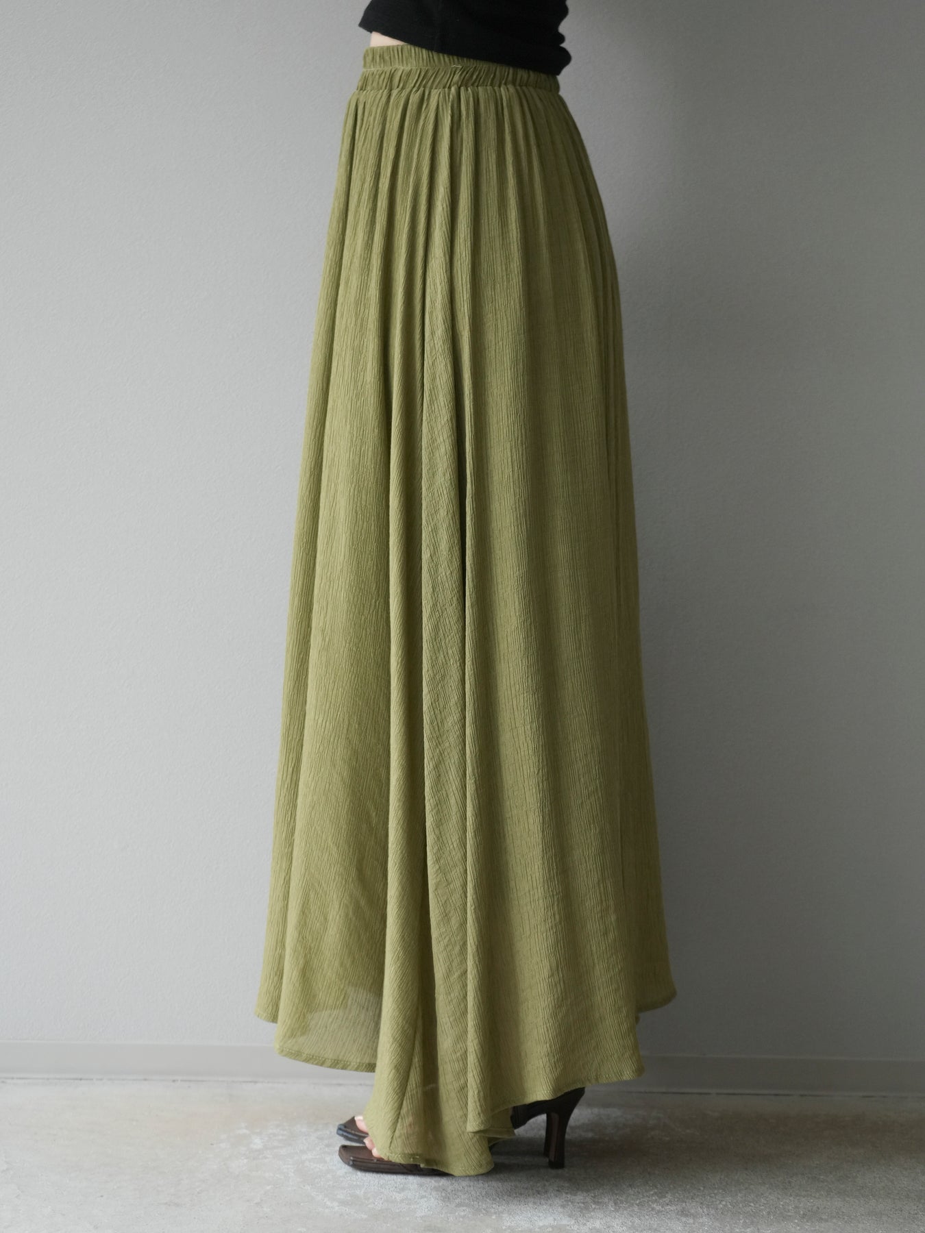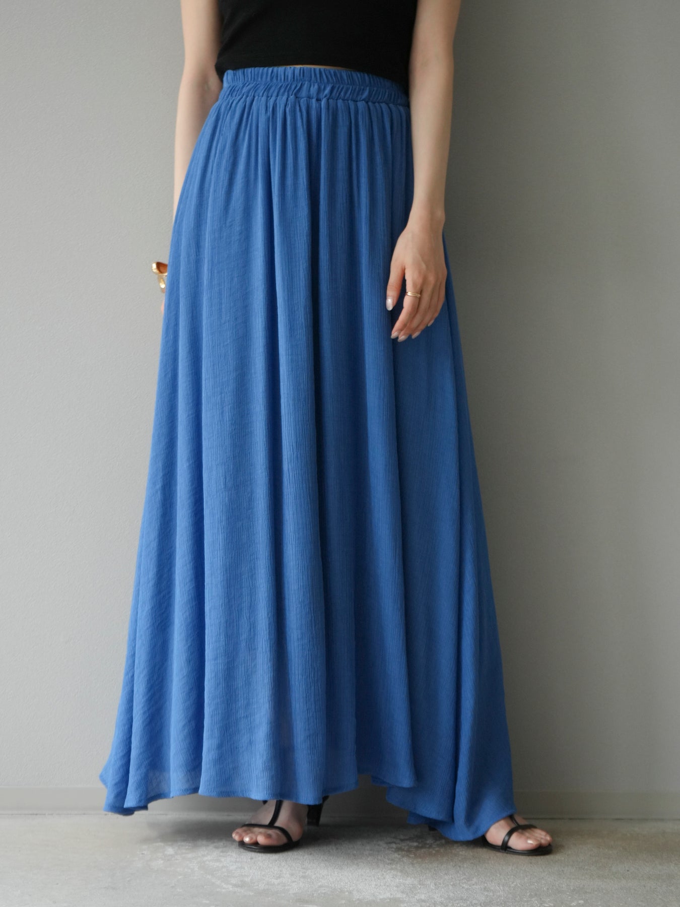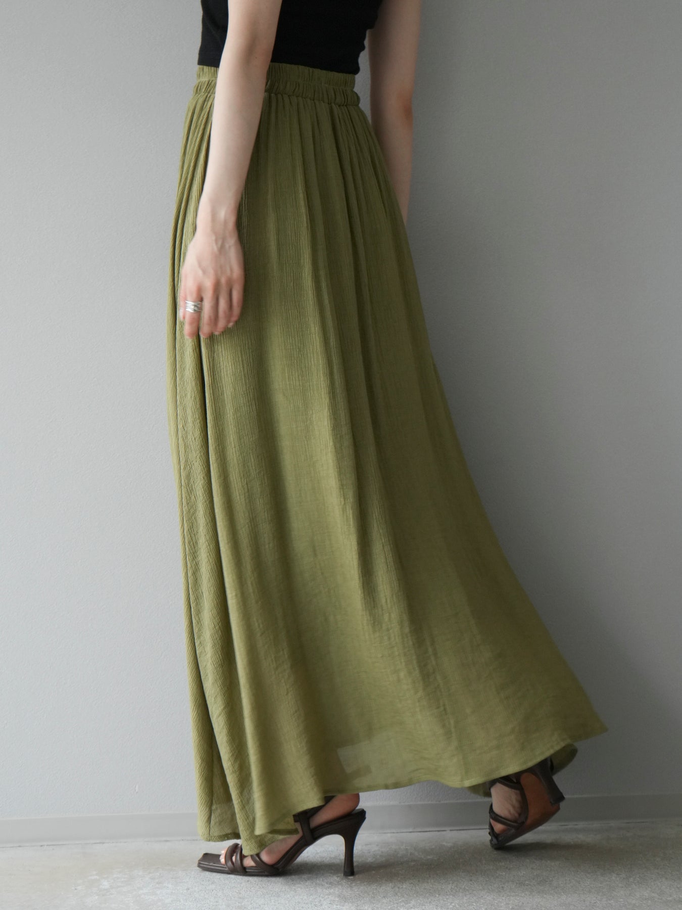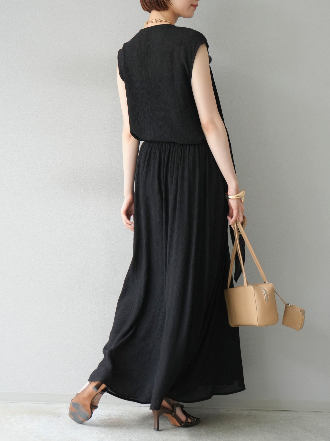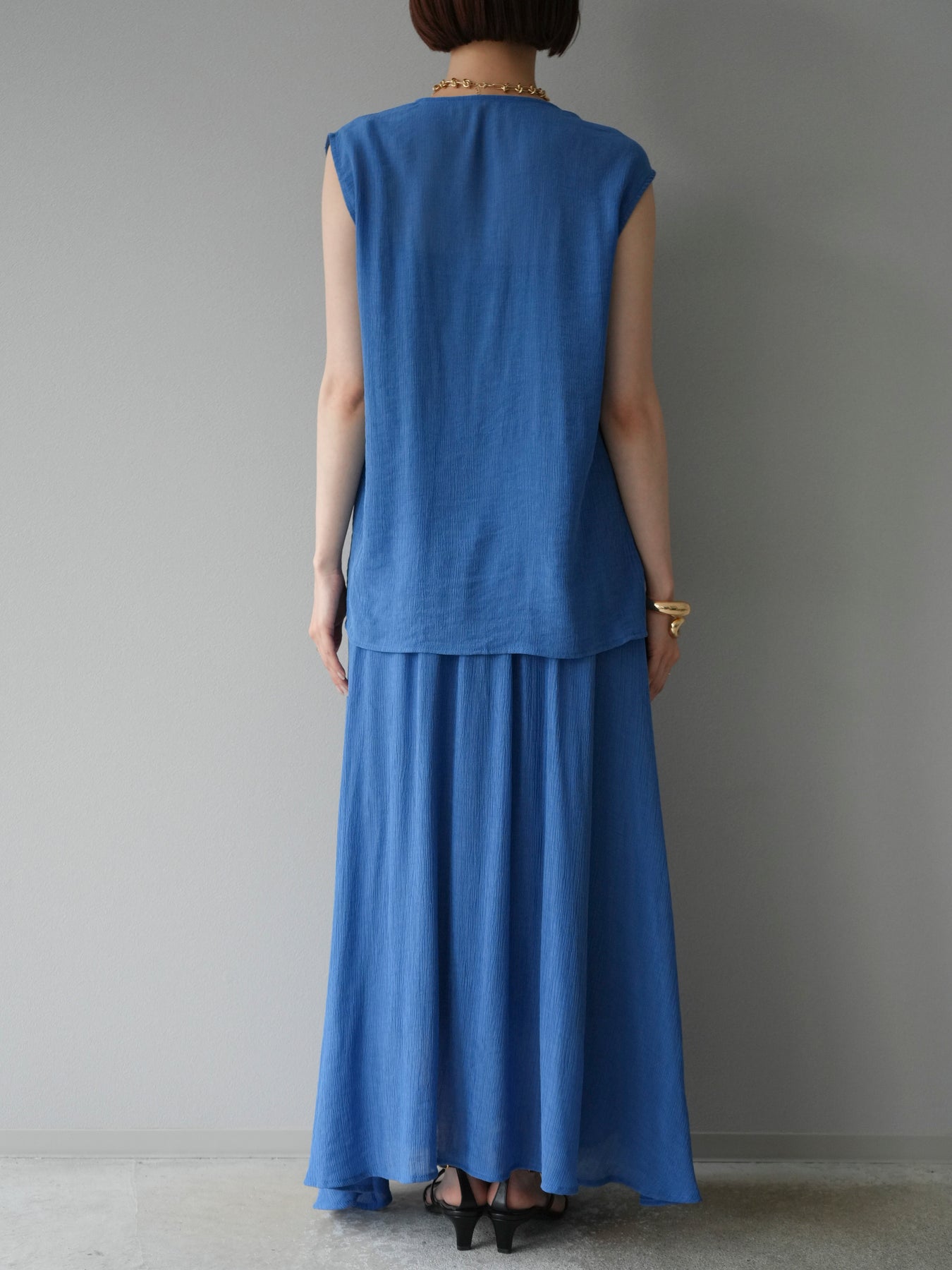 涼しげな楊柳素材を使用した、ビーズモチーフ付きアシンメトリーブラウスとフレアスカートのセットアップ。ブラウスは片側に寄せたドレープとビーズディテールがアクセントになり、1枚で立体感と動きを演出します。 スカートはウエストゴム仕様のストレスフリーな穿き心地で、揺れ感のあるフレアシルエットが女性らしさを引き立てます。軽やかな素材感が夏のムードにぴったりで、セットでも単品でも着回し力の高いアイテムです。 旅行やリゾートはもちろん、デイリーコーデにも映える大人のリラックススタイルに。 ※ボトムス、キャミソール(インナー)以外の商品は一律でインナーは付属していません。