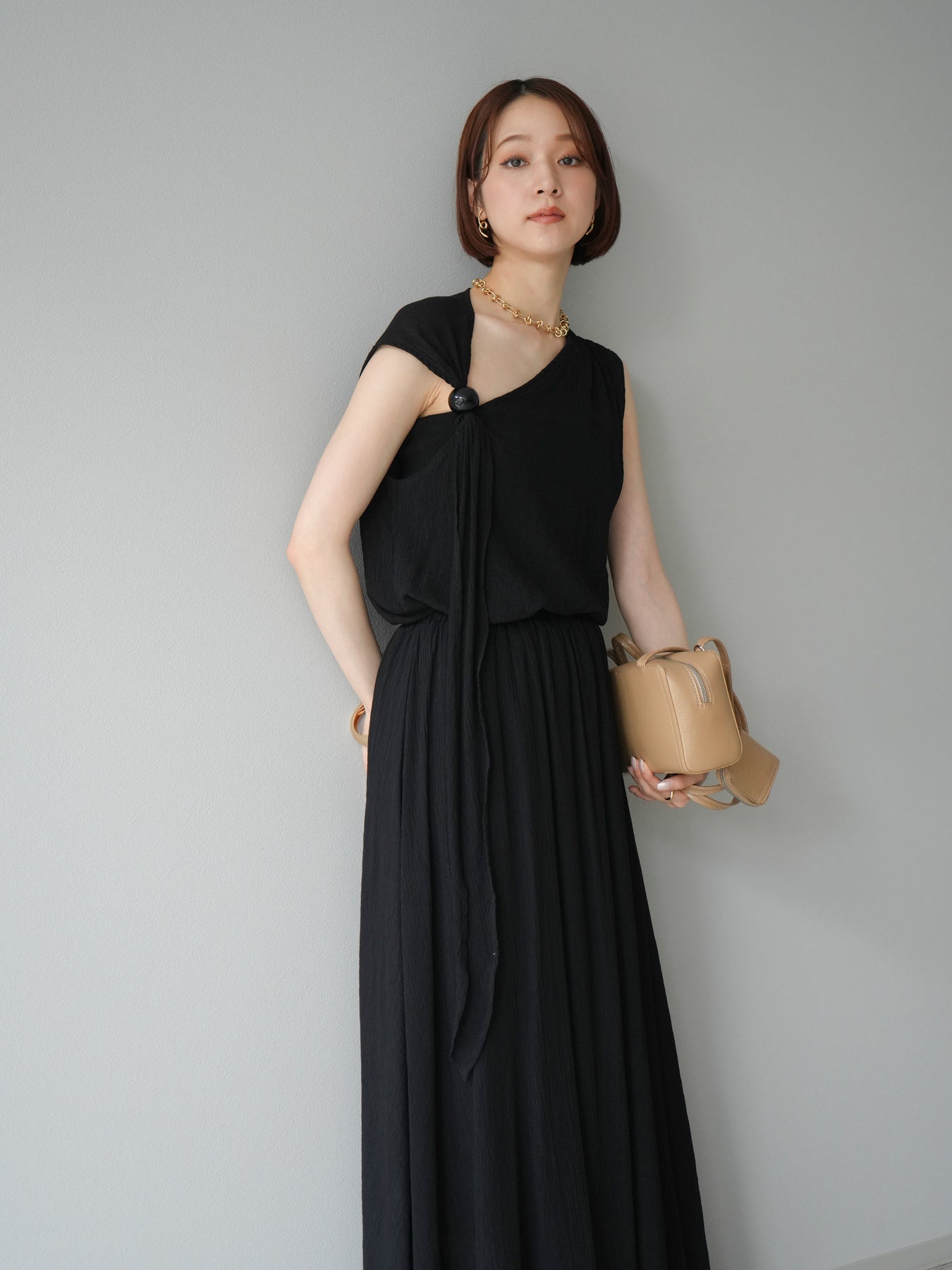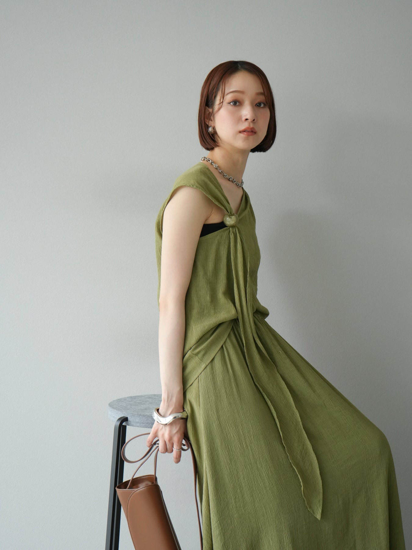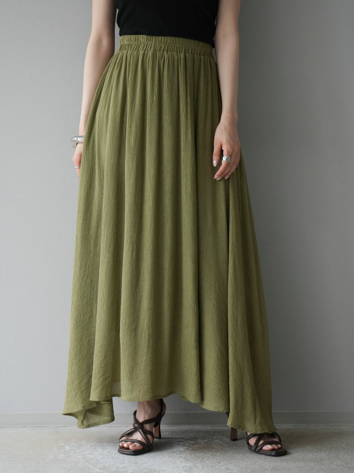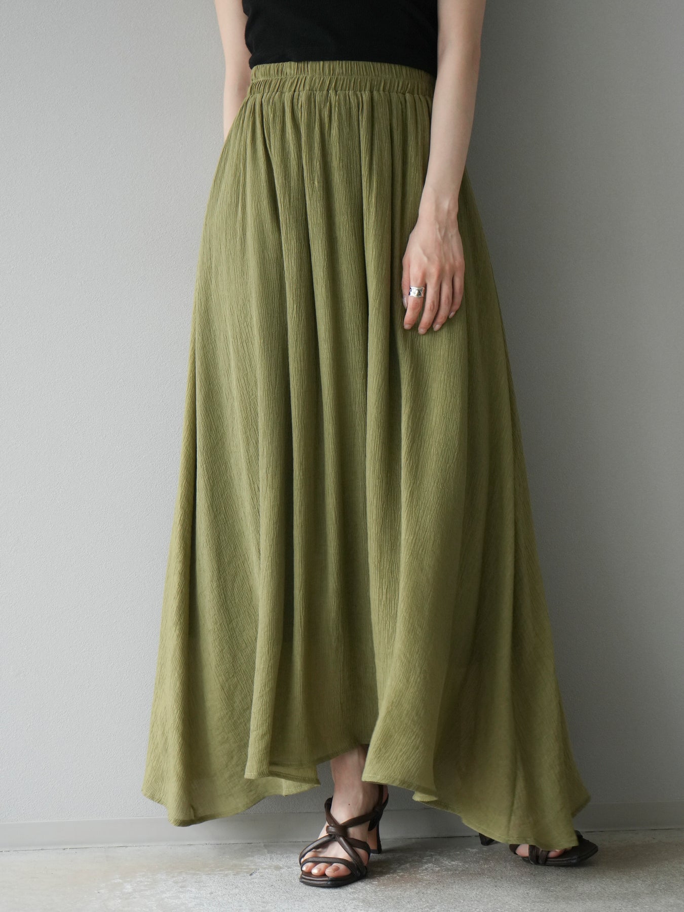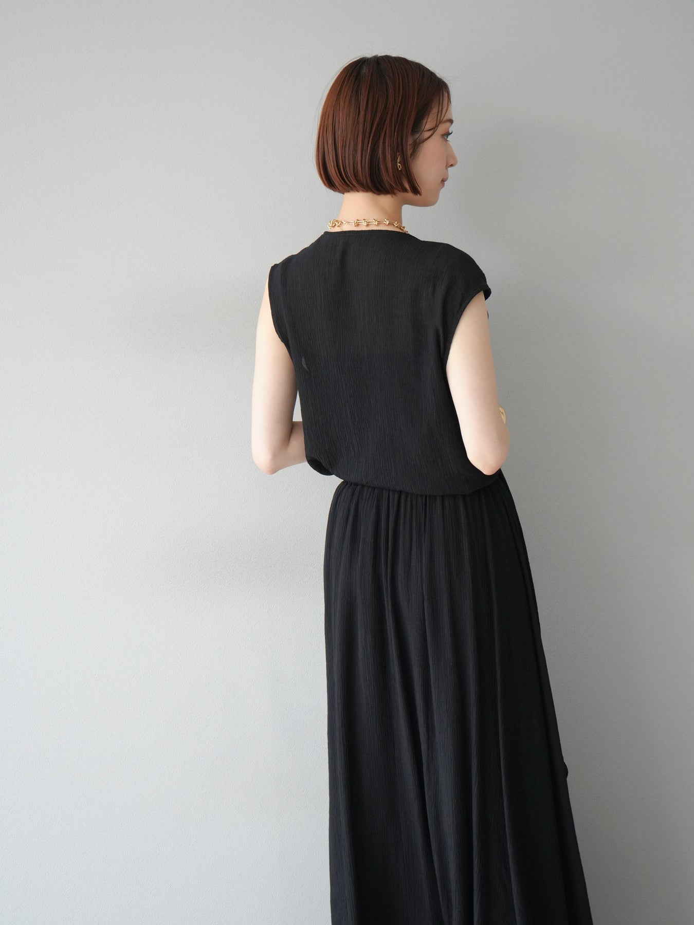 涼しげな楊柳素材を使用した、ビーズモチーフ付きアシンメトリーブラウスとフレアスカートのセットアップ。ブラウスは片側に寄せたドレープとビーズディテールがアクセントになり、1枚で立体感と動きを演出します。 スカートはウエストゴム仕様のストレスフリーな穿き心地で、揺れ感のあるフレアシルエットが女性らしさを引き立てます。軽やかな素材感が夏のムードにぴったりで、セットでも単品でも着回し力の高いアイテムです。 旅行やリゾートはもちろん、デイリーコーデにも映える大人のリラックススタイルに。 ※ボトムス、キャミソール(インナー)以外の商品は一律でインナーは付属していません。