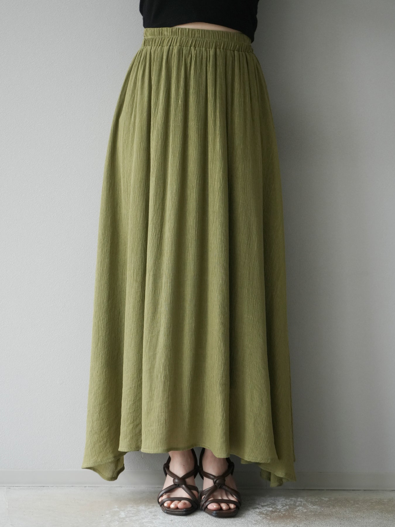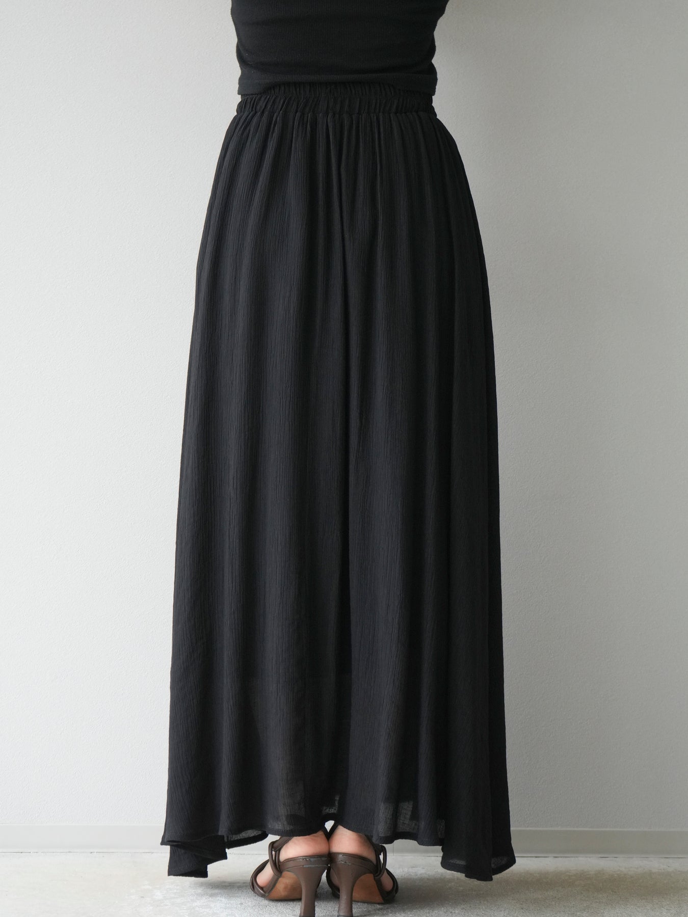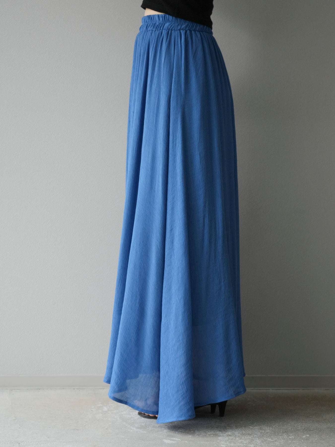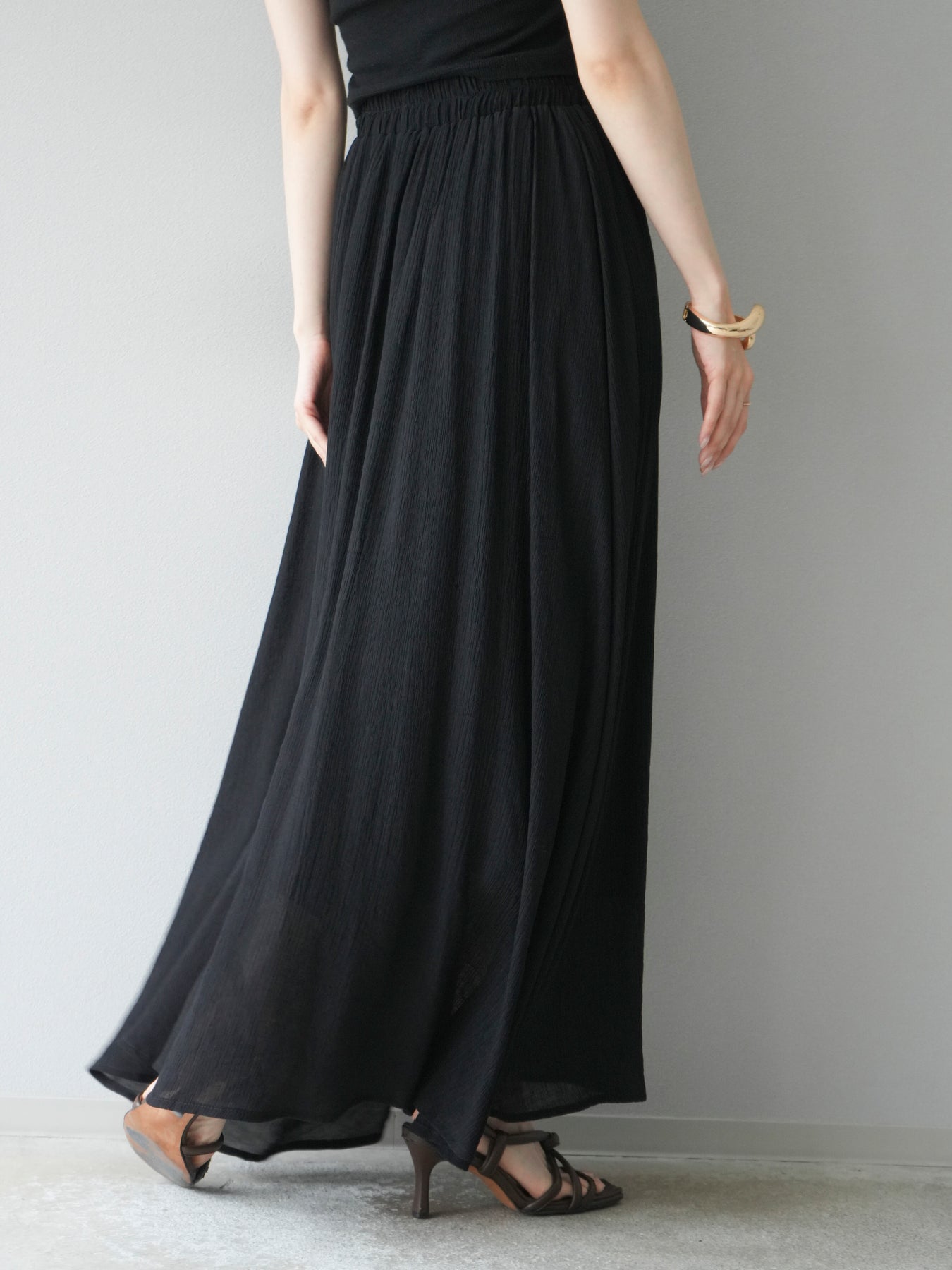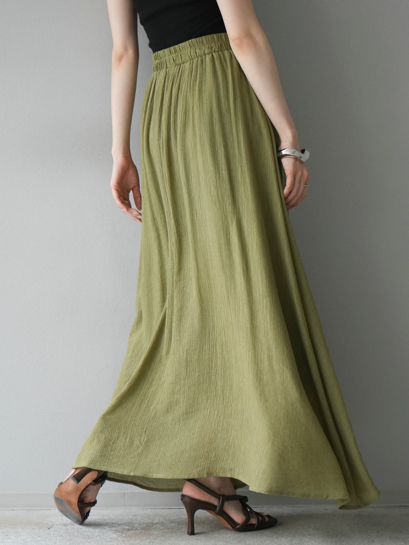 涼しげな楊柳素材を使用した、ビーズモチーフ付きアシンメトリーブラウスとフレアスカートのセットアップ。ブラウスは片側に寄せたドレープとビーズディテールがアクセントになり、1枚で立体感と動きを演出します。 スカートはウエストゴム仕様のストレスフリーな穿き心地で、揺れ感のあるフレアシルエットが女性らしさを引き立てます。軽やかな素材感が夏のムードにぴったりで、セットでも単品でも着回し力の高いアイテムです。 旅行やリゾートはもちろん、デイリーコーデにも映える大人のリラックススタイルに。 ※ボトムス、キャミソール(インナー)以外の商品は一律でインナーは付属していません。
